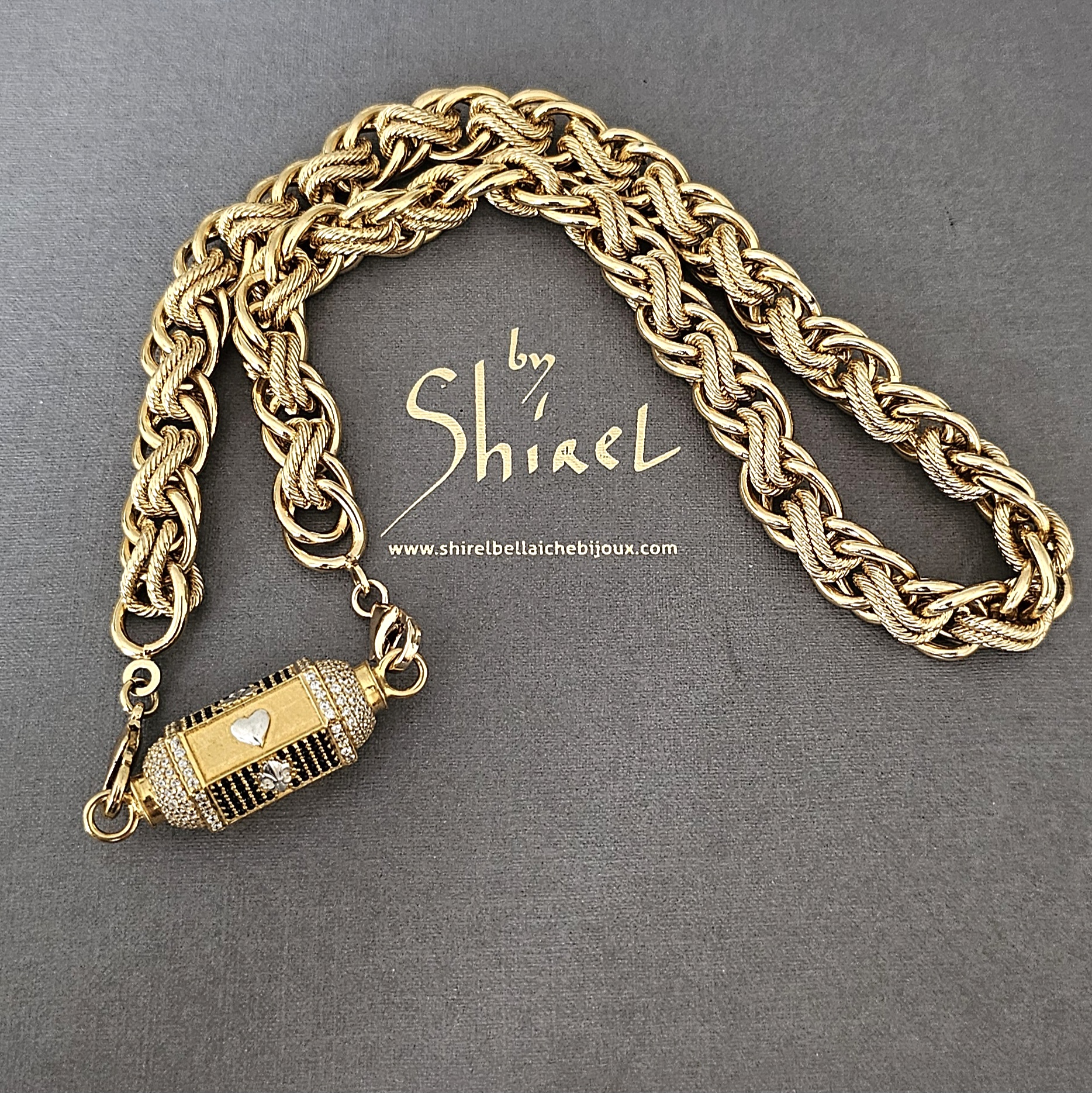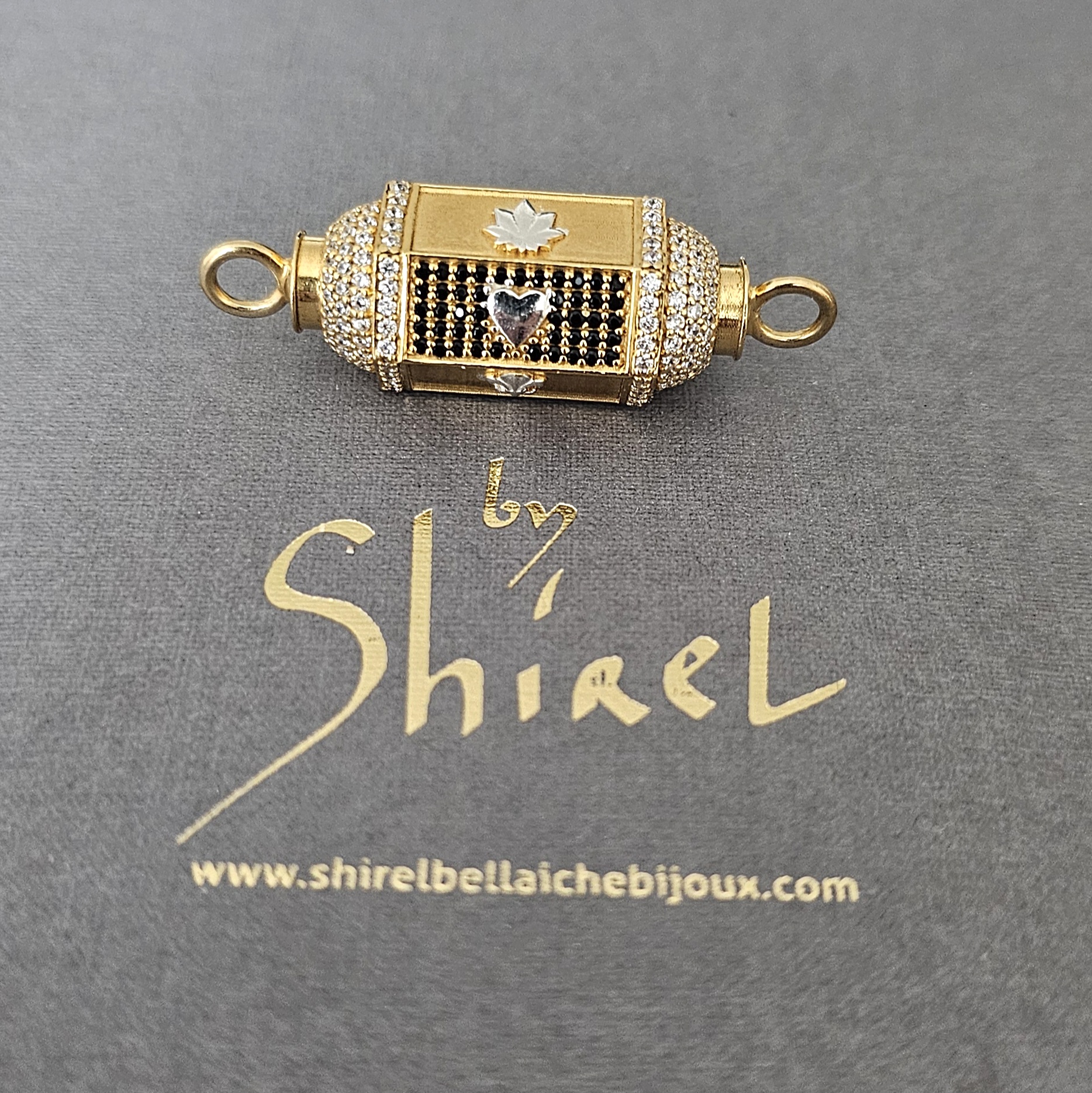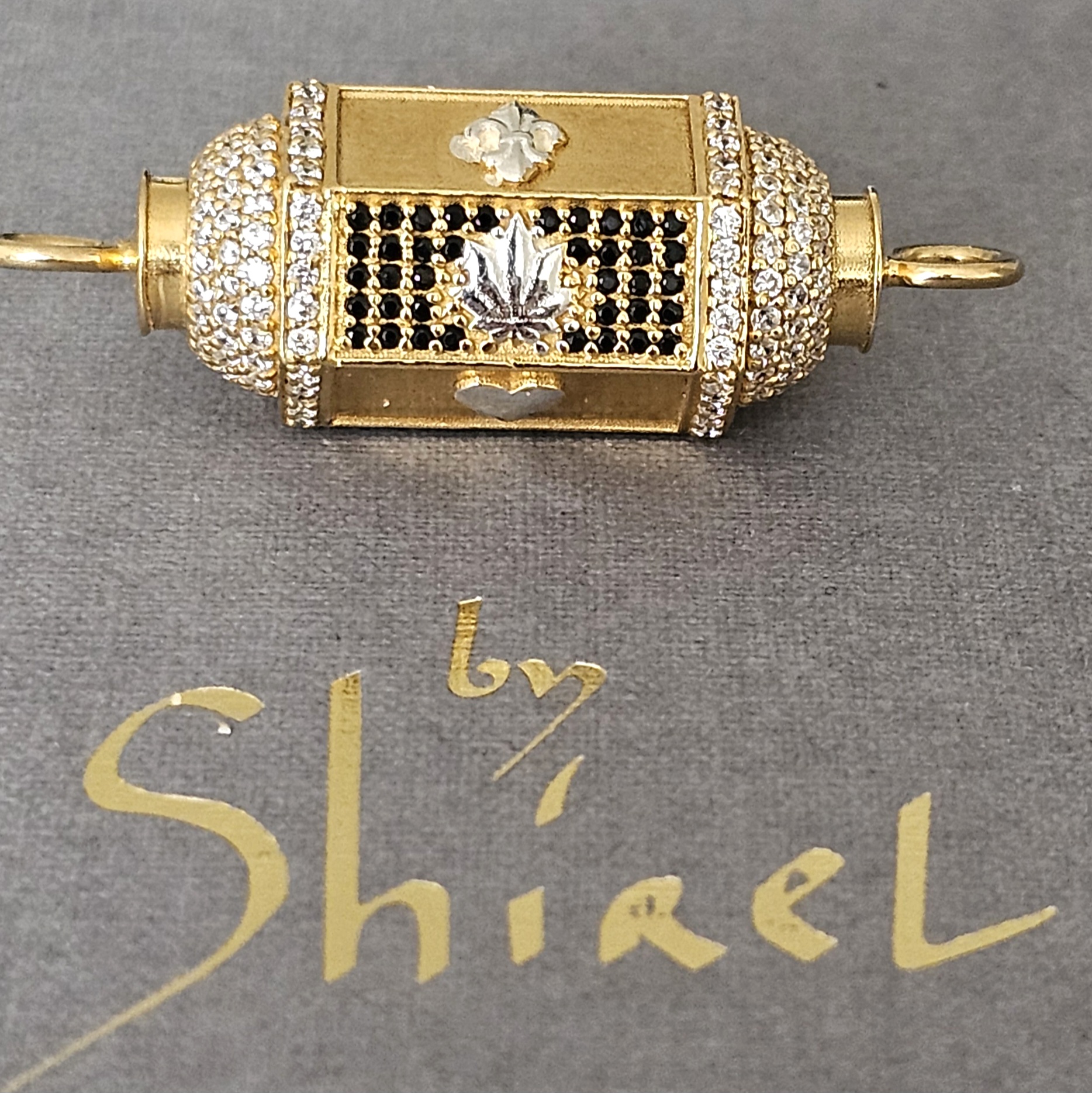 Locket Royal est tout en argent massif plaqué or et zircons. Les six facettes comportent un symbole couleur argent : un cœur, une feuille de cannabis et une fleur de Lys. L’originalité de ces facettes, est qu’une facette sur deux est entièrement pavée de zircons noirs, avec à chaque fois son symbole.