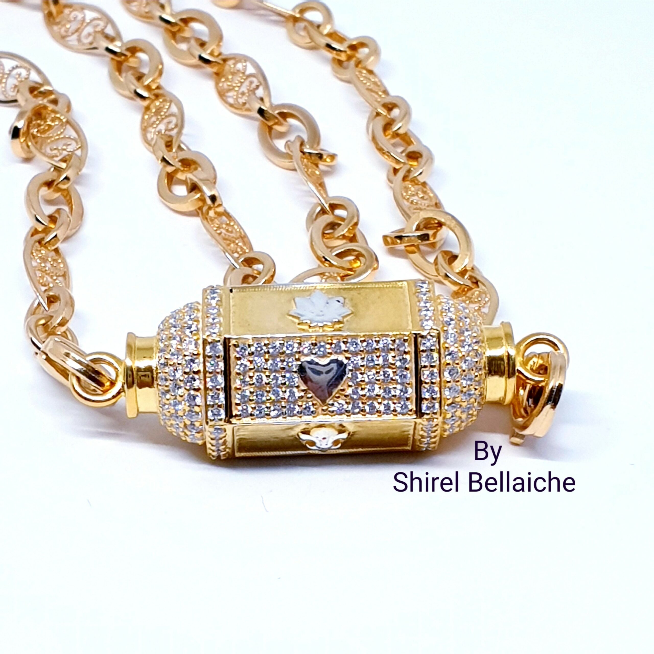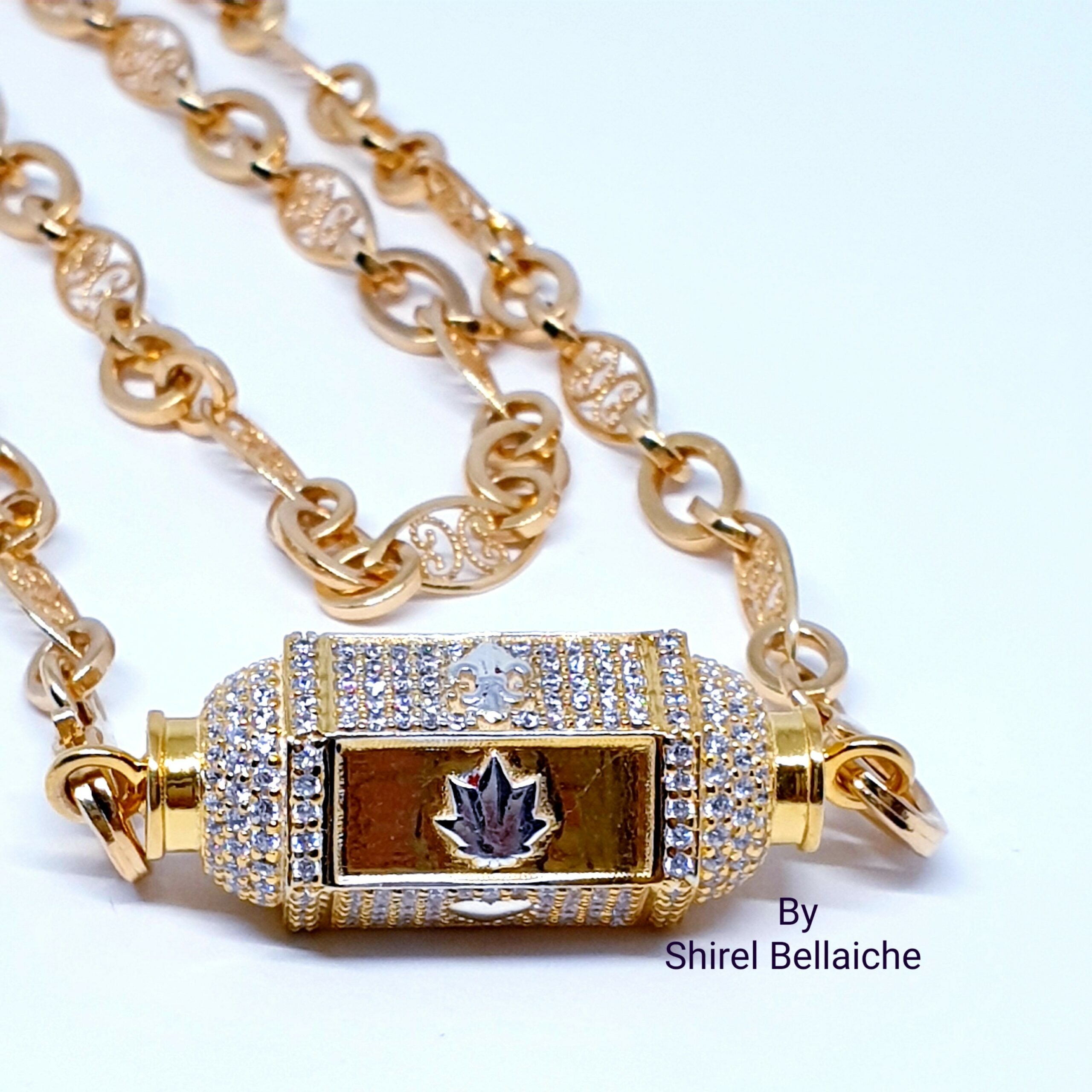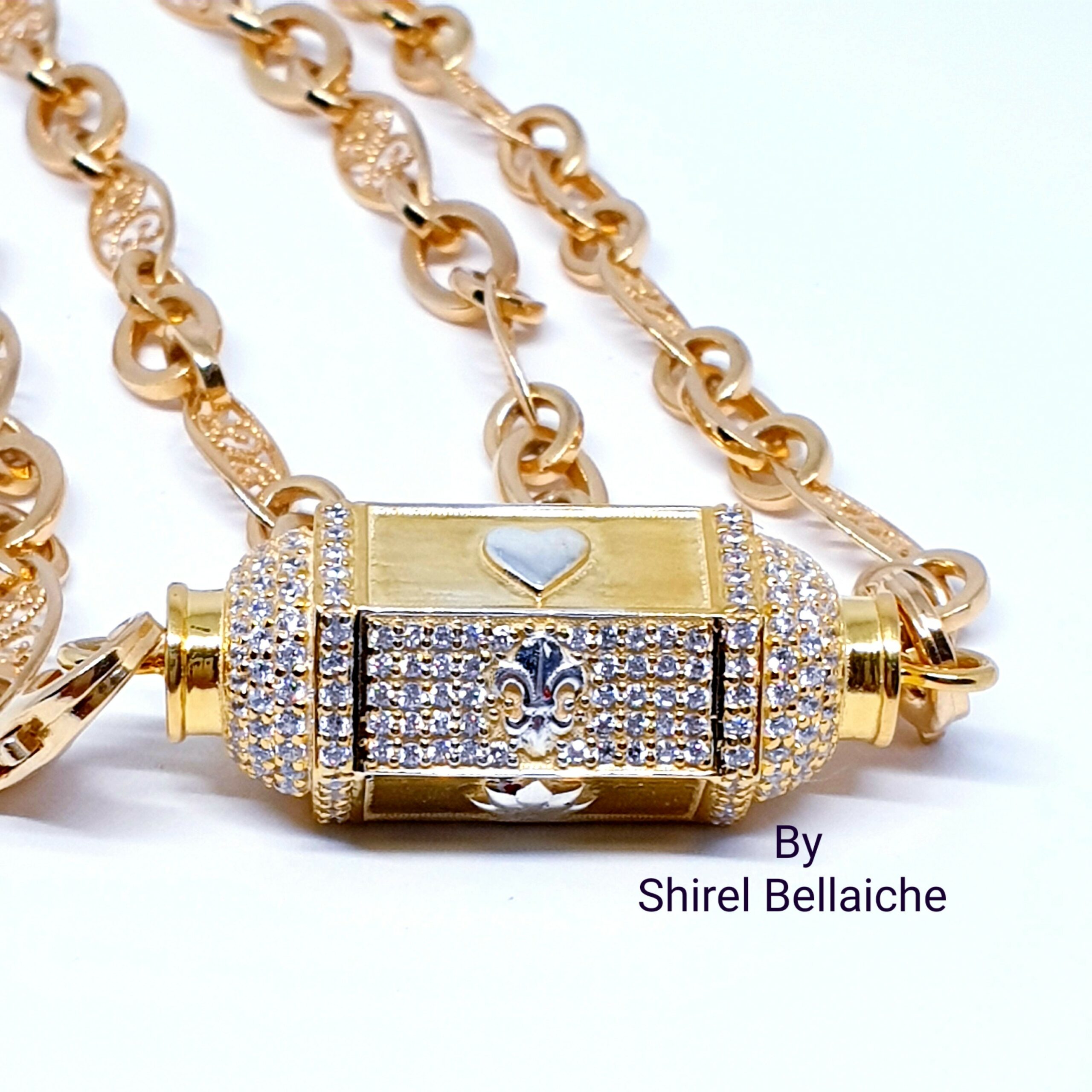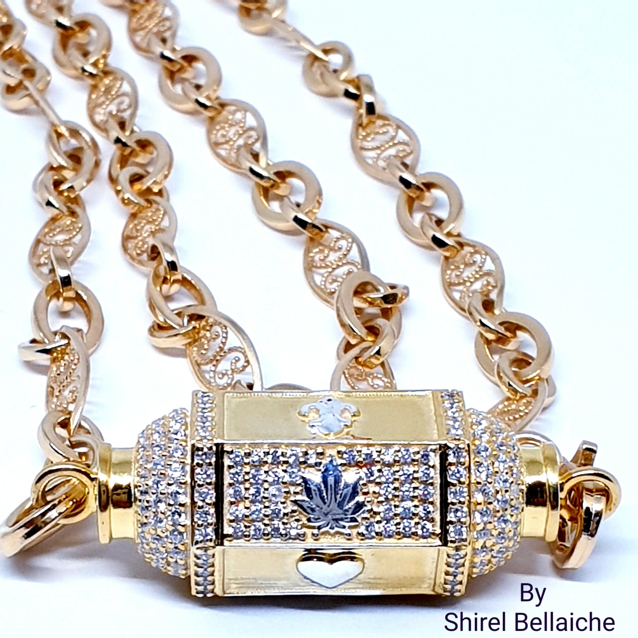 Locket Royal  se compose d’une chaine Vintage de 45 cm en vermeil plaquée or 3 microns et d’un pendentif vermeil plaqué or 3 microns  entièrement pavé de zircons blancs. Les six facettes comportent un symbole couleur argent :  un cœur, une feuille de cannabis et une fleur de Lys. L’originalité de ces facettes, est qu’une facette sur deux est entièrement pavée de zircons blancs avec à chaque fois son symbole.