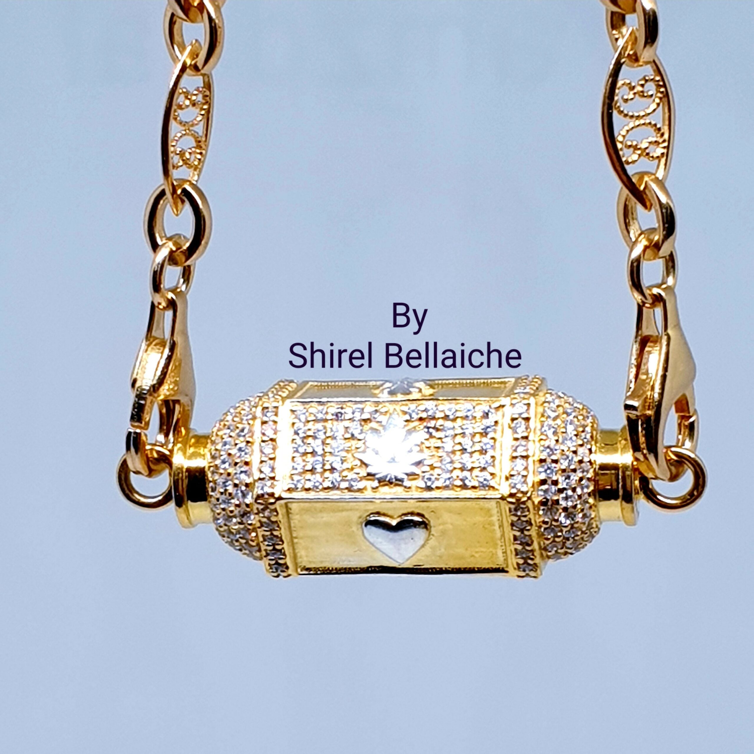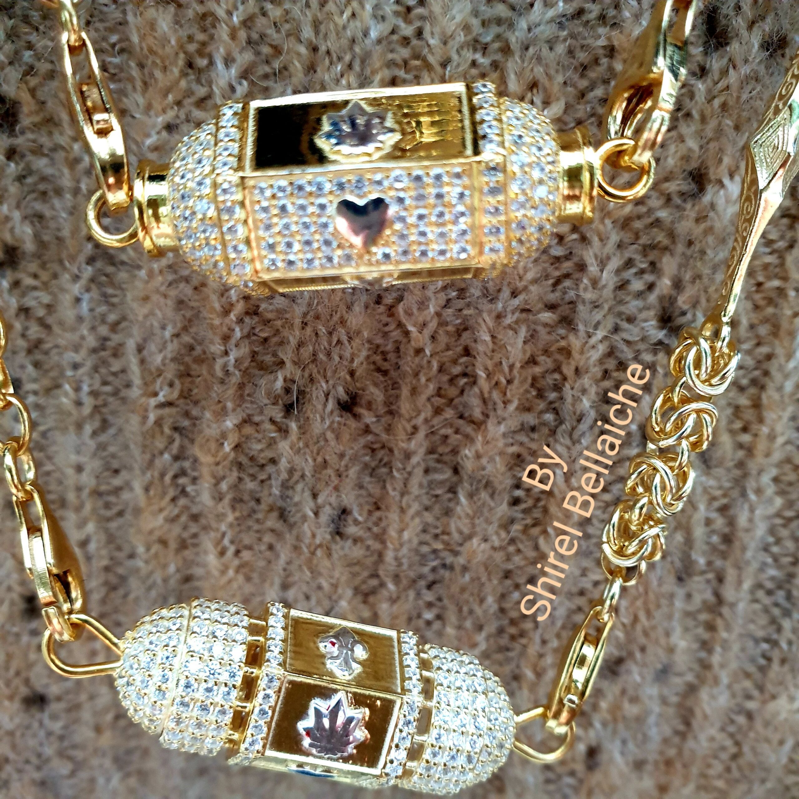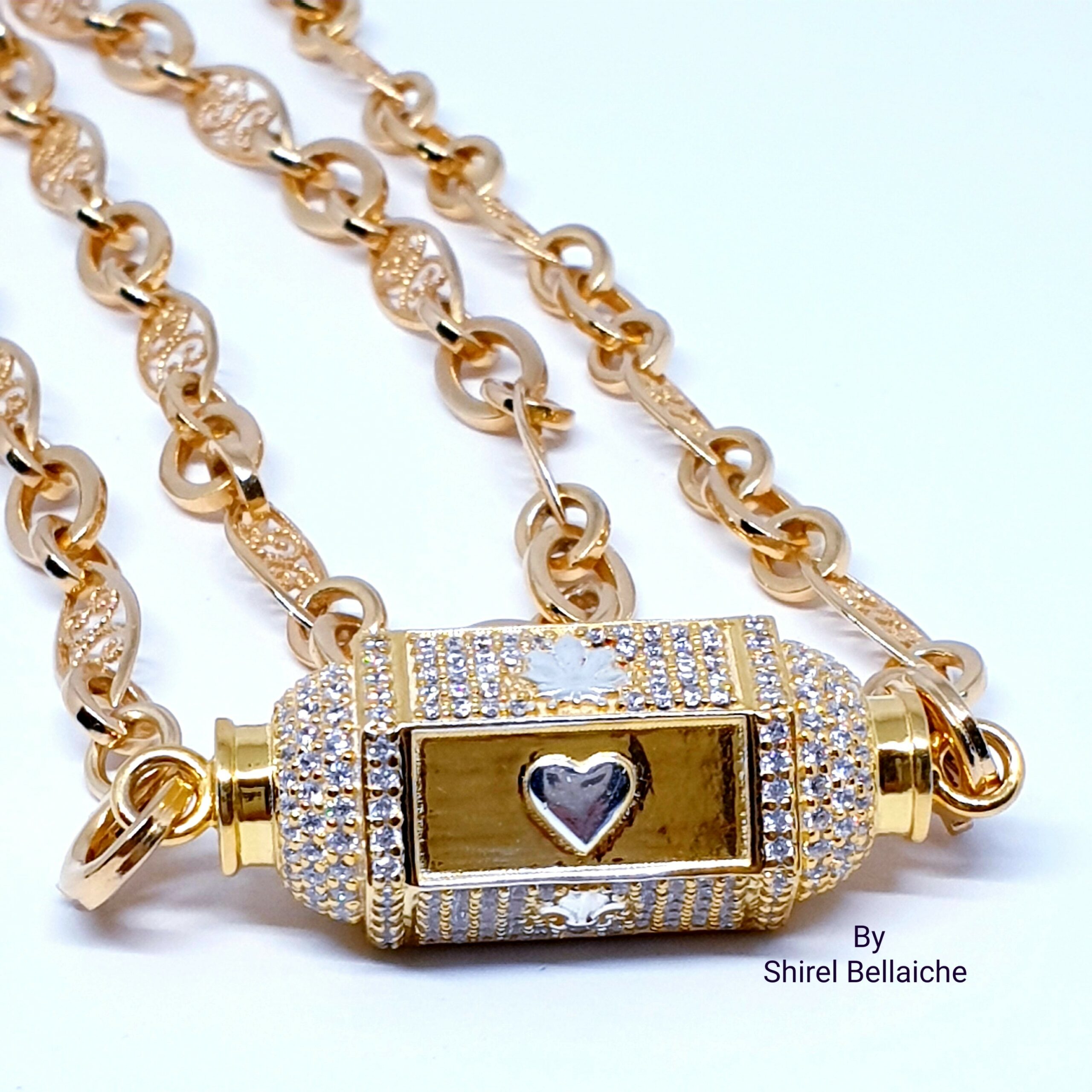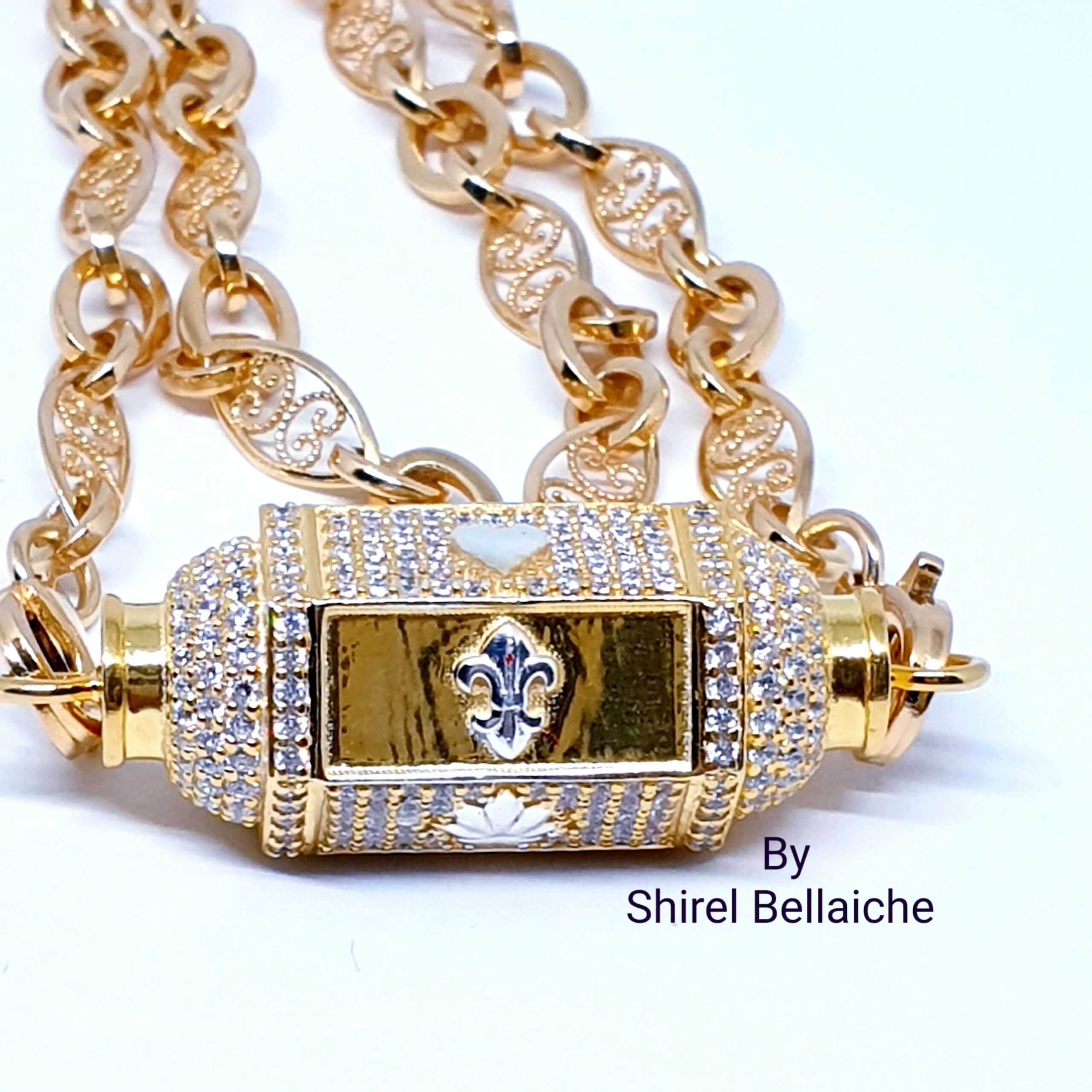 Locket Royal  se compose d’une chaine Vintage de 45 cm en vermeil plaquée or 3 microns et d’un pendentif vermeil plaqué or 3 microns  entièrement pavé de zircons blancs. Les six facettes comportent un symbole couleur argent :  un cœur, une feuille de cannabis et une fleur de Lys. L’originalité de ces facettes, est qu’une facette sur deux est entièrement pavée de zircons blancs avec à chaque fois son symbole.