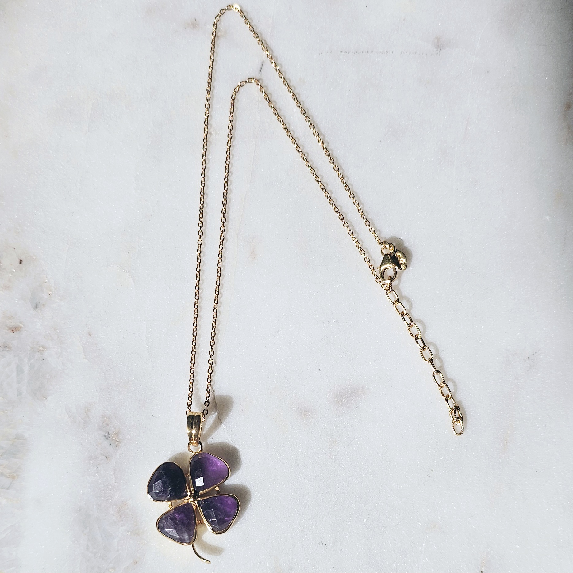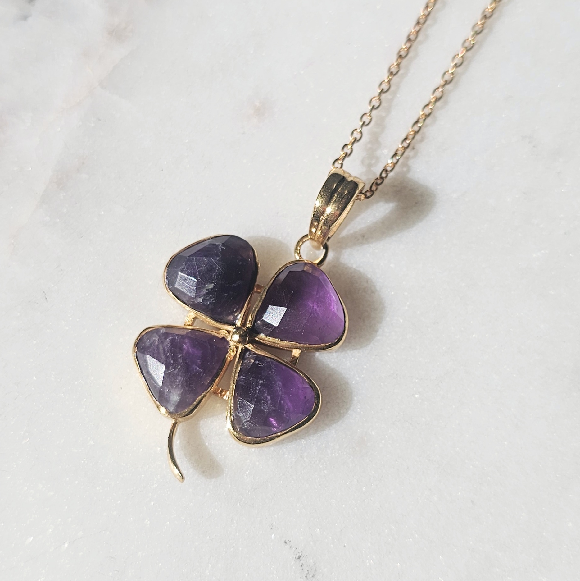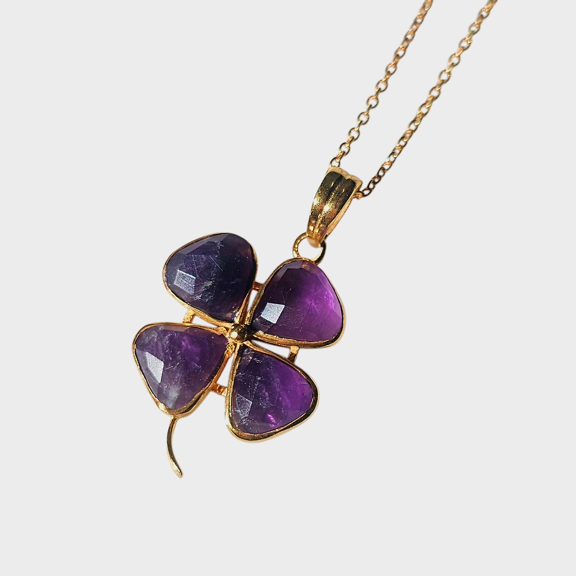 Lucky Trèfle est un bijou porte bonheur grâce à son pendentif trèfle tout en améthyste facettée naturelle plaqué or.