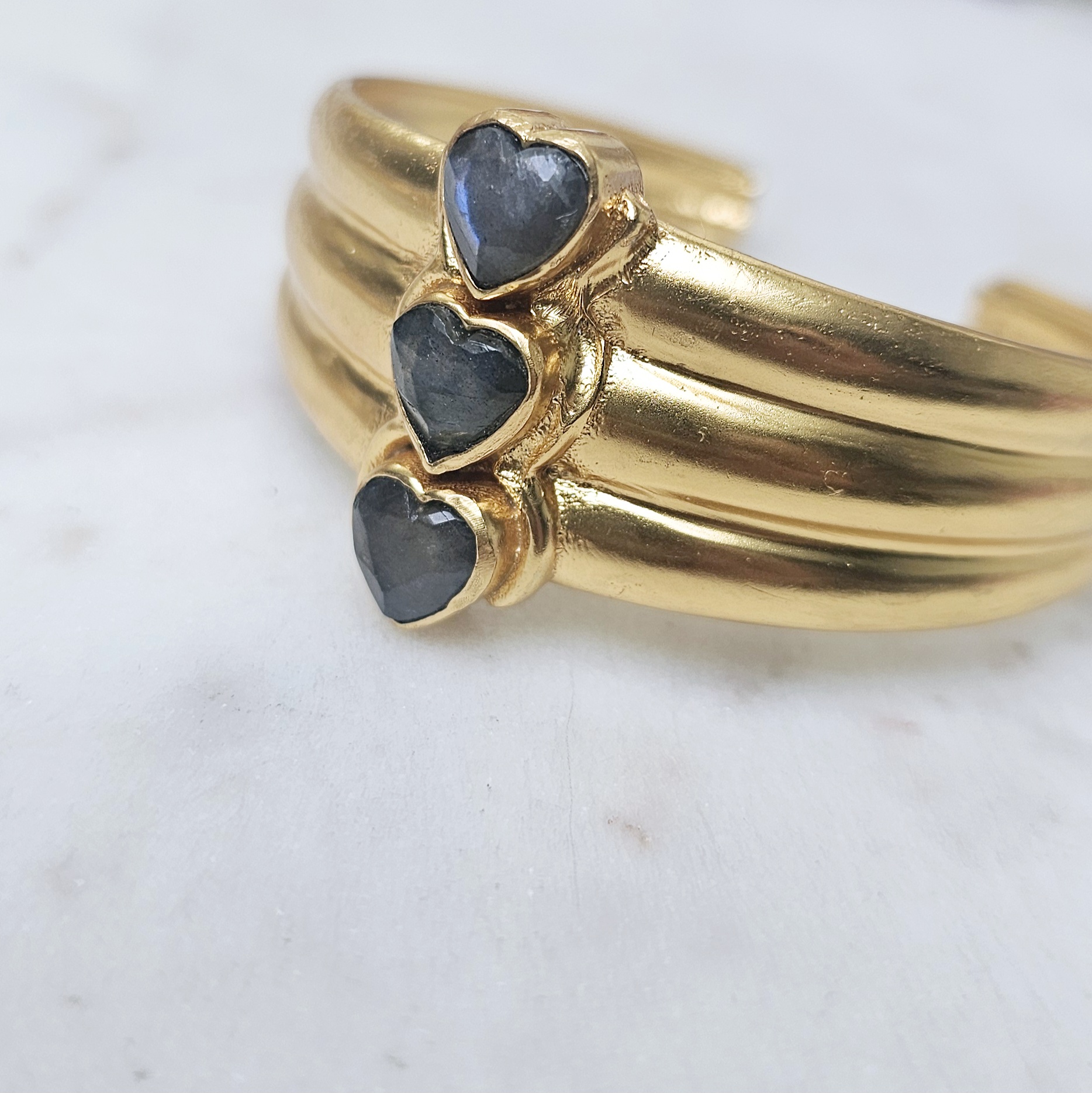 Cette manchette originale triple cœurs est proposée ici avec trois cœurs en labradorite facettée naturelle, ce qui apporte au rendu de meilleurs reflets ainsi qu’ une intensité supplémentaire à l éclats.