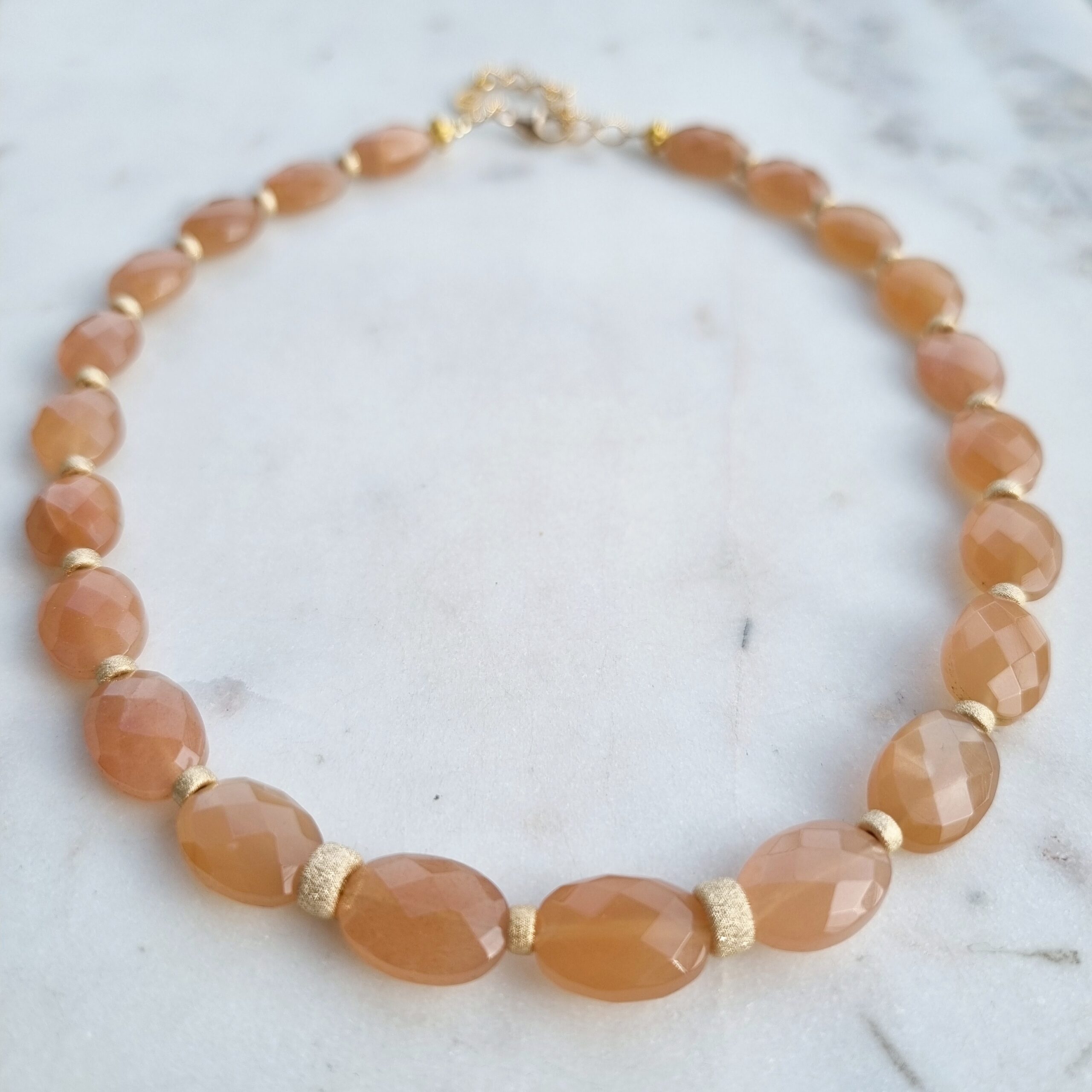 MARILOU est un collier ras de cou proposé ici tout en Peach Moonstone. Les éléments entre chaque pierres sont en or laminés 14 carats.