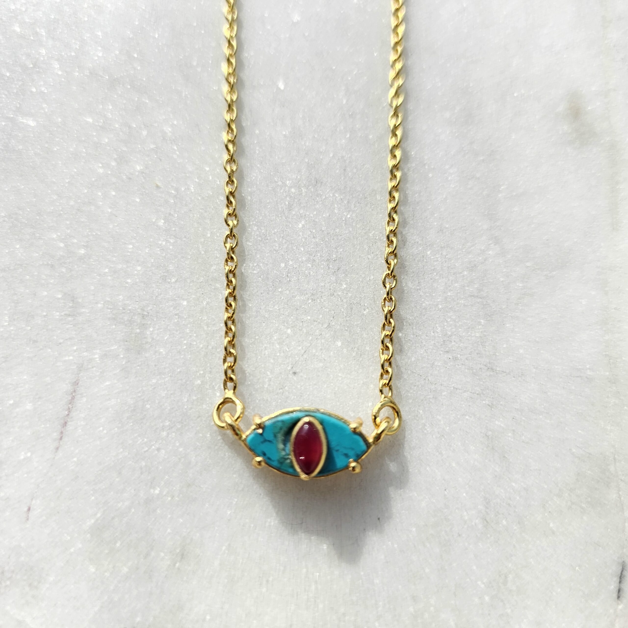 Mini AINARA marquise est un bijou de protection, un talisman porte bonheur intemporel et tendance. Il est tout en argent 925 plaqué or, et est proposé ici avec une pierre centrale turquoise et une iris marquise rubis.