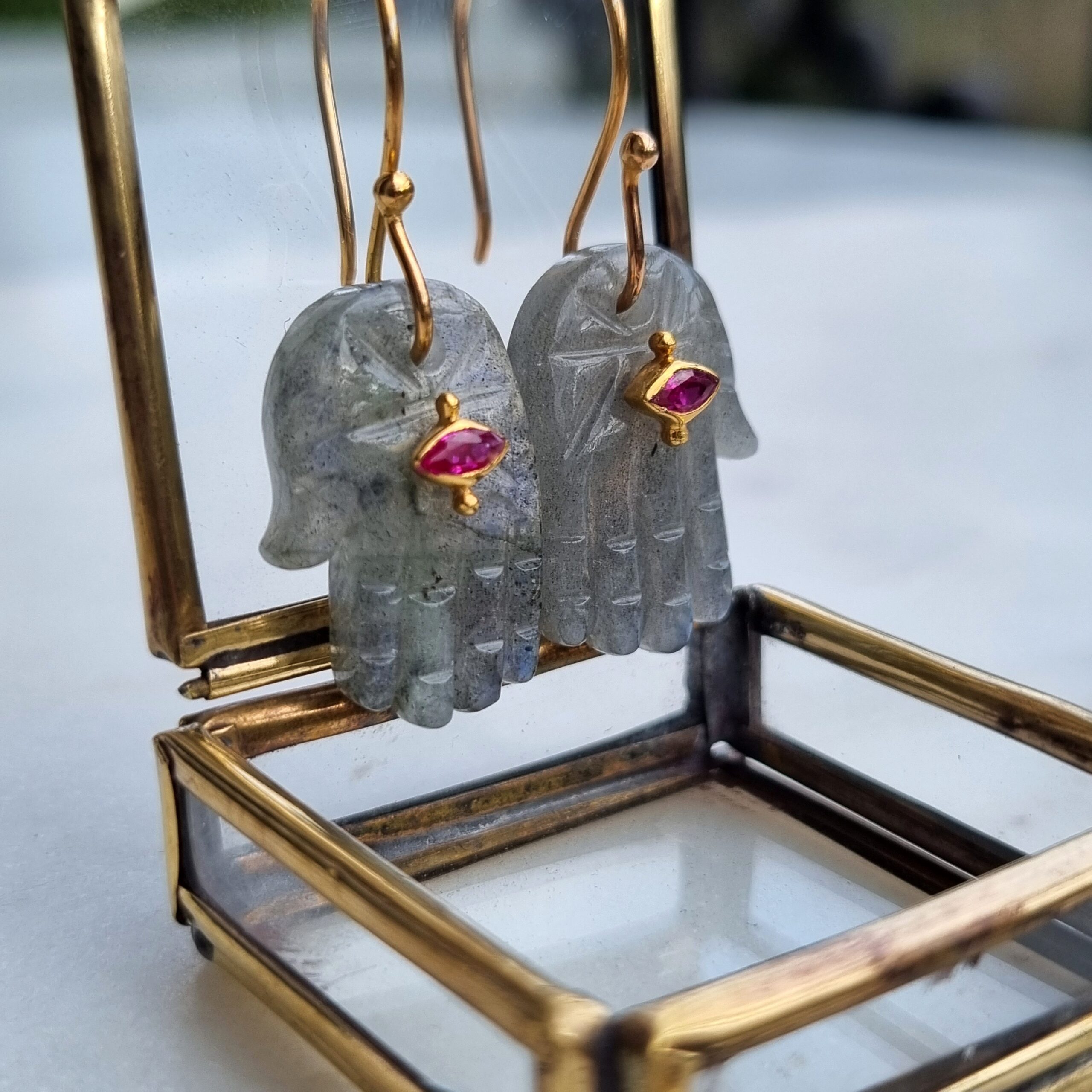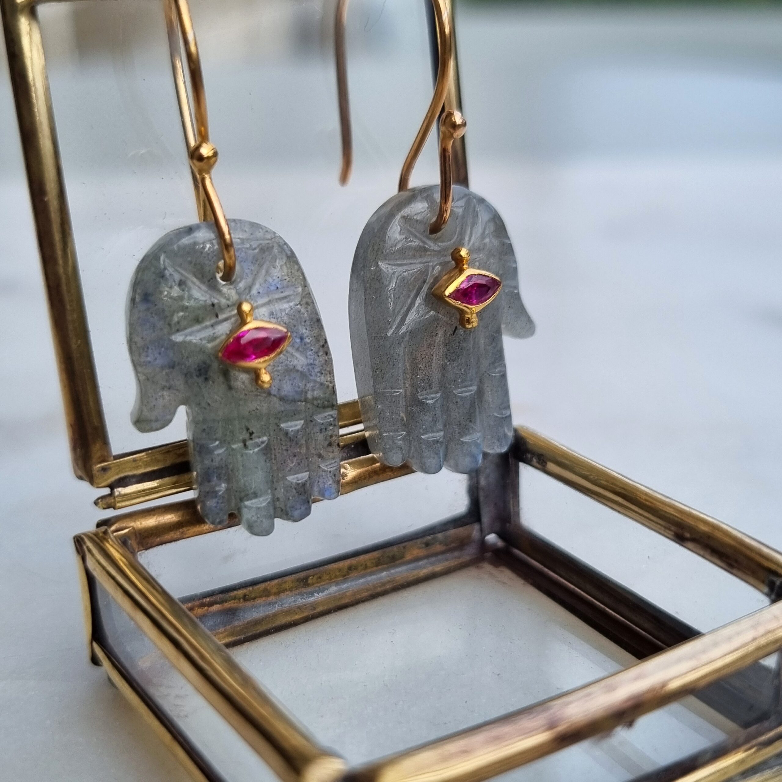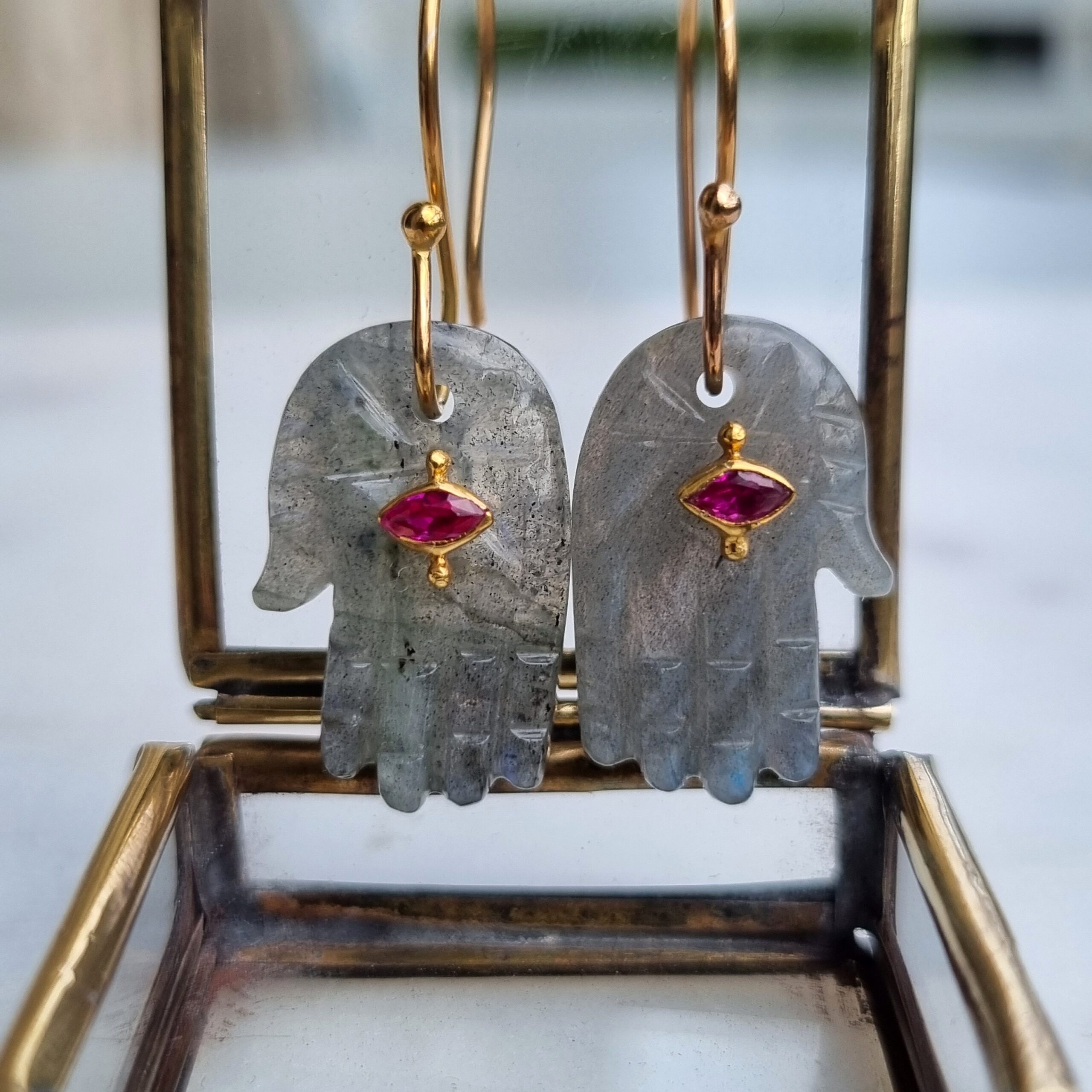 Mona mono boucle est en labradorite avec son petit œil centrale grenat. La tige est en vermeil plaquée or.