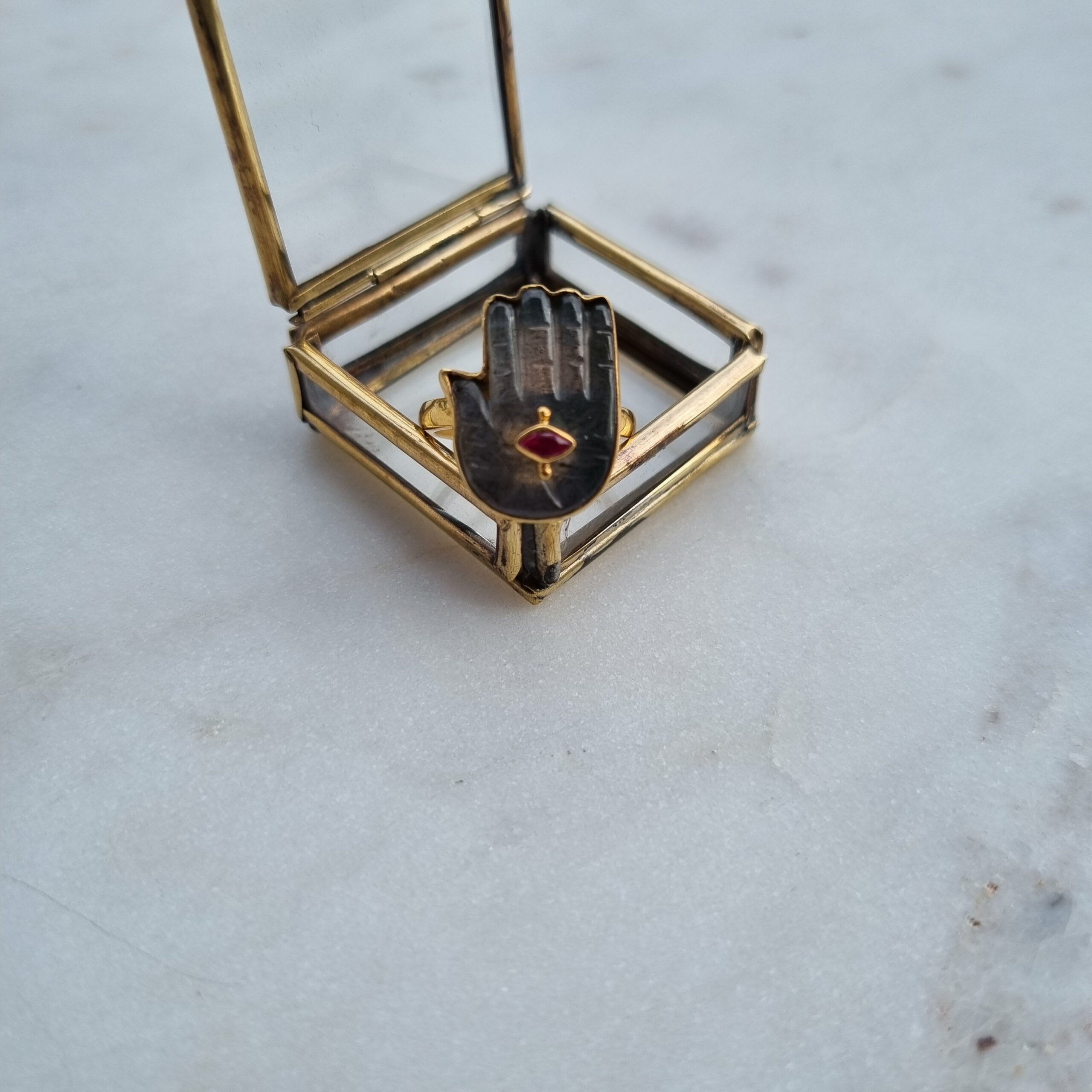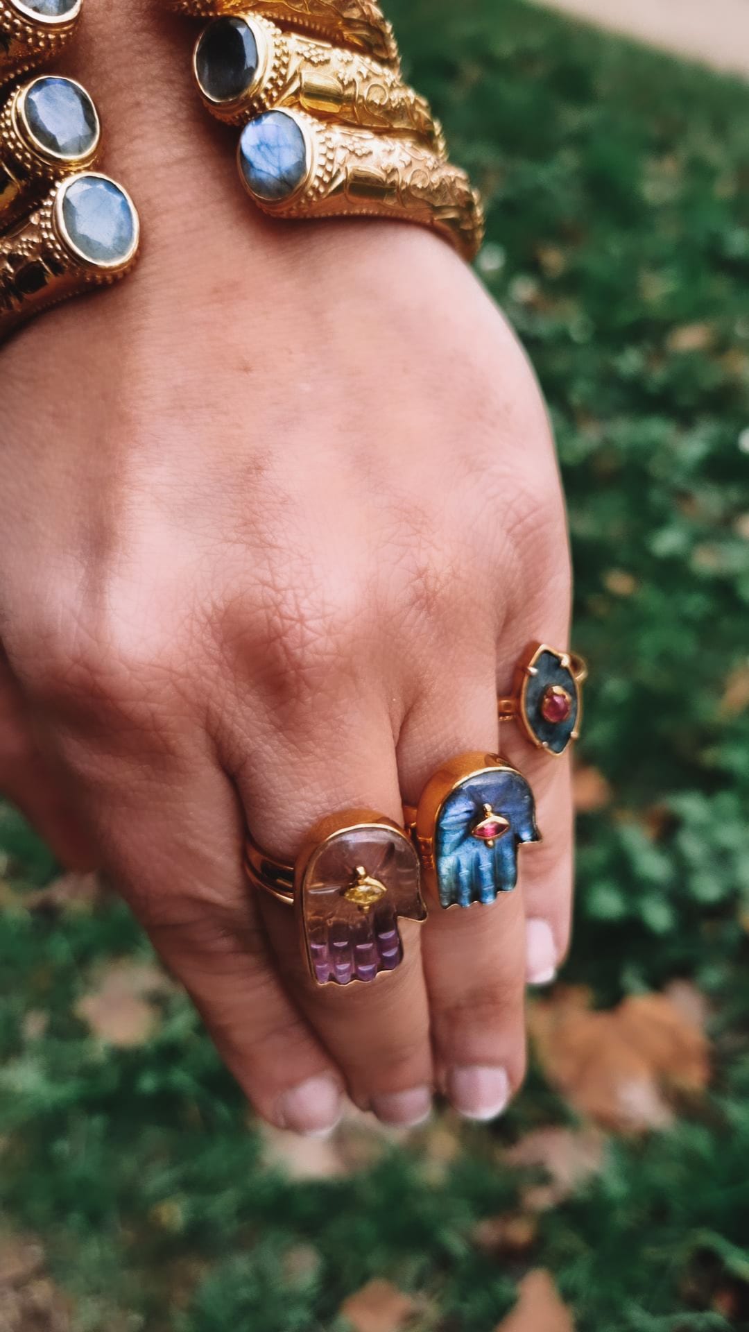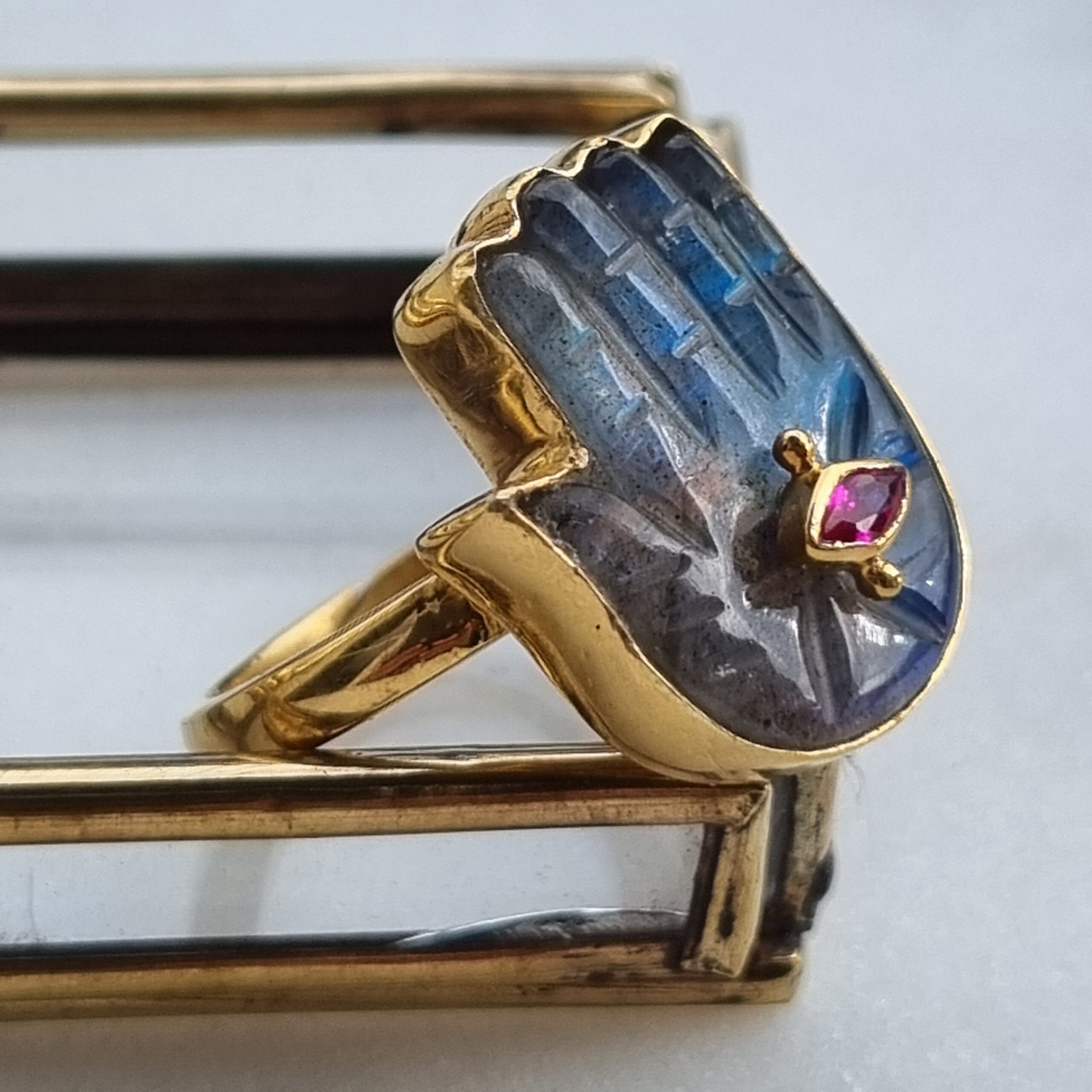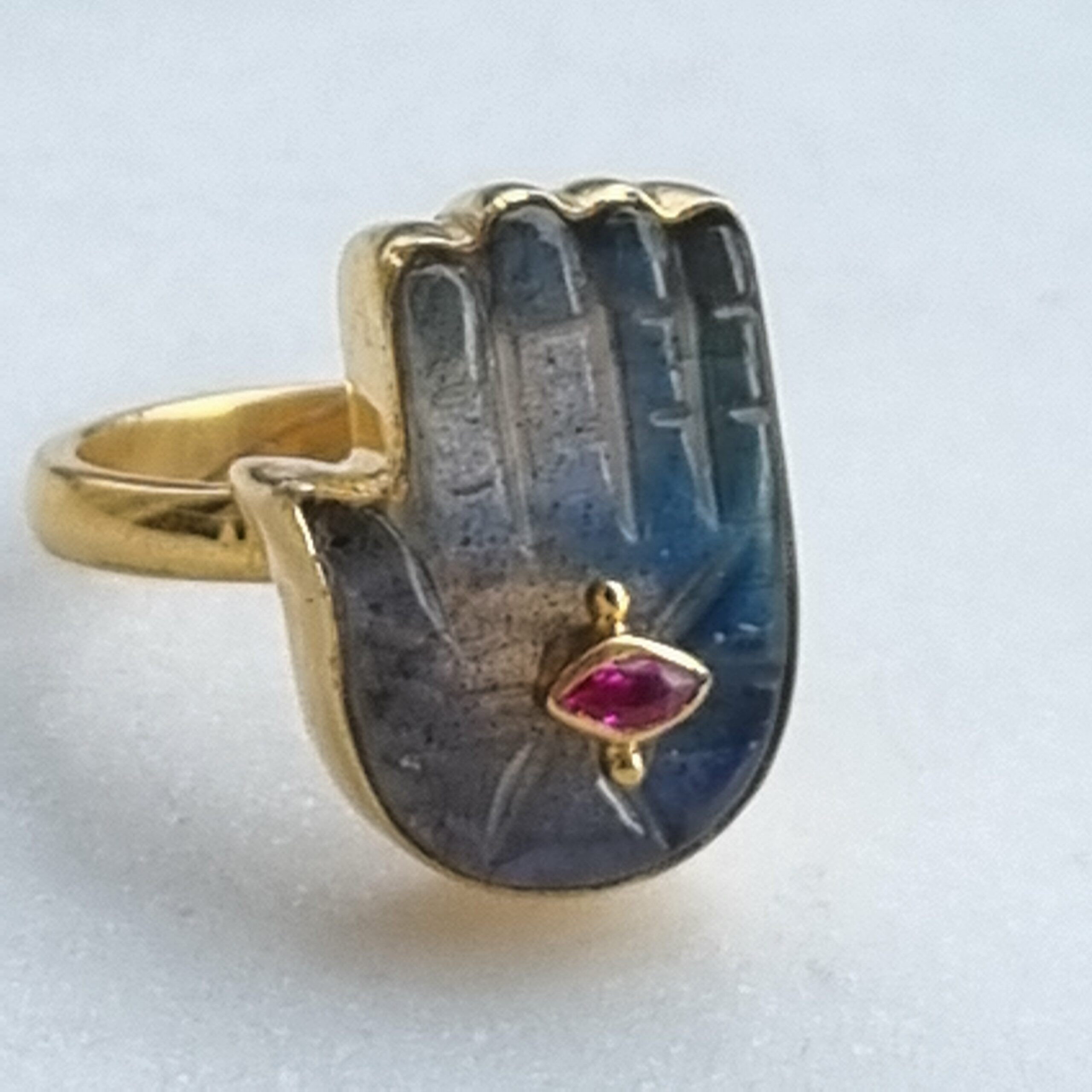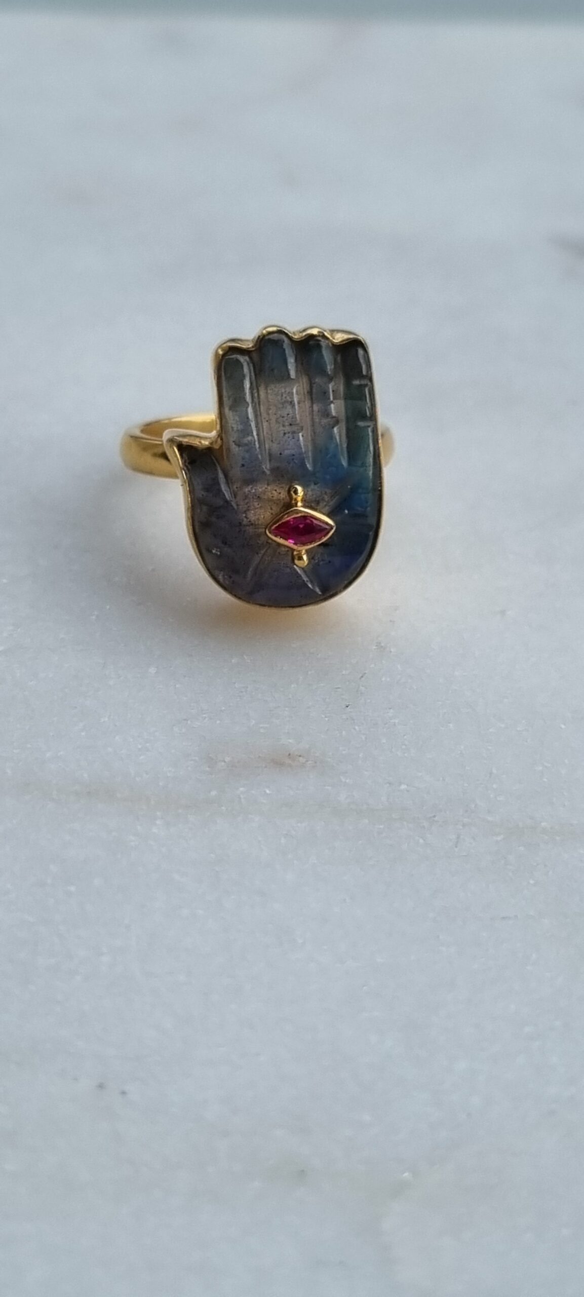 Mona version bague qui complète la gamme du même nom. La bague est en vermeil plaquée or et proposée ici en version labradorite avec son petit œil grenat.