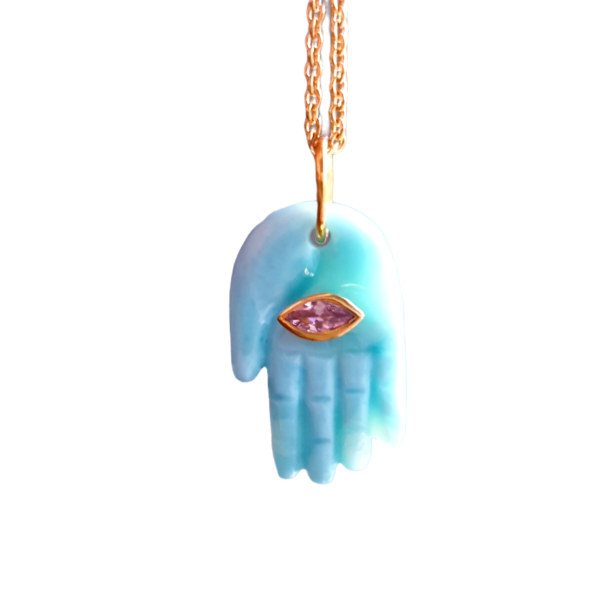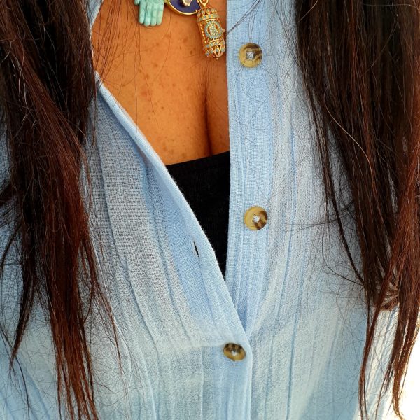 MONA est un collier avec un pendentif main en pierre larimar et d’un zircon rose pale. Le larimar est réputé pour avoir des propriétés apaisantes et d’équilibre sur le psychisme et le corps. Celui qui porte par exemple un collier, un bracelet, une gourmette ou un quelconque objet fait de cette roche semi-précieuse reçoit de façon automatique des énergies positives, nécessaires à l’épanouissement de son âme. Le larimar permet donc de booster la positive attitude lorsque le moral est au plus bas. Il éloigne les pensées négatives.