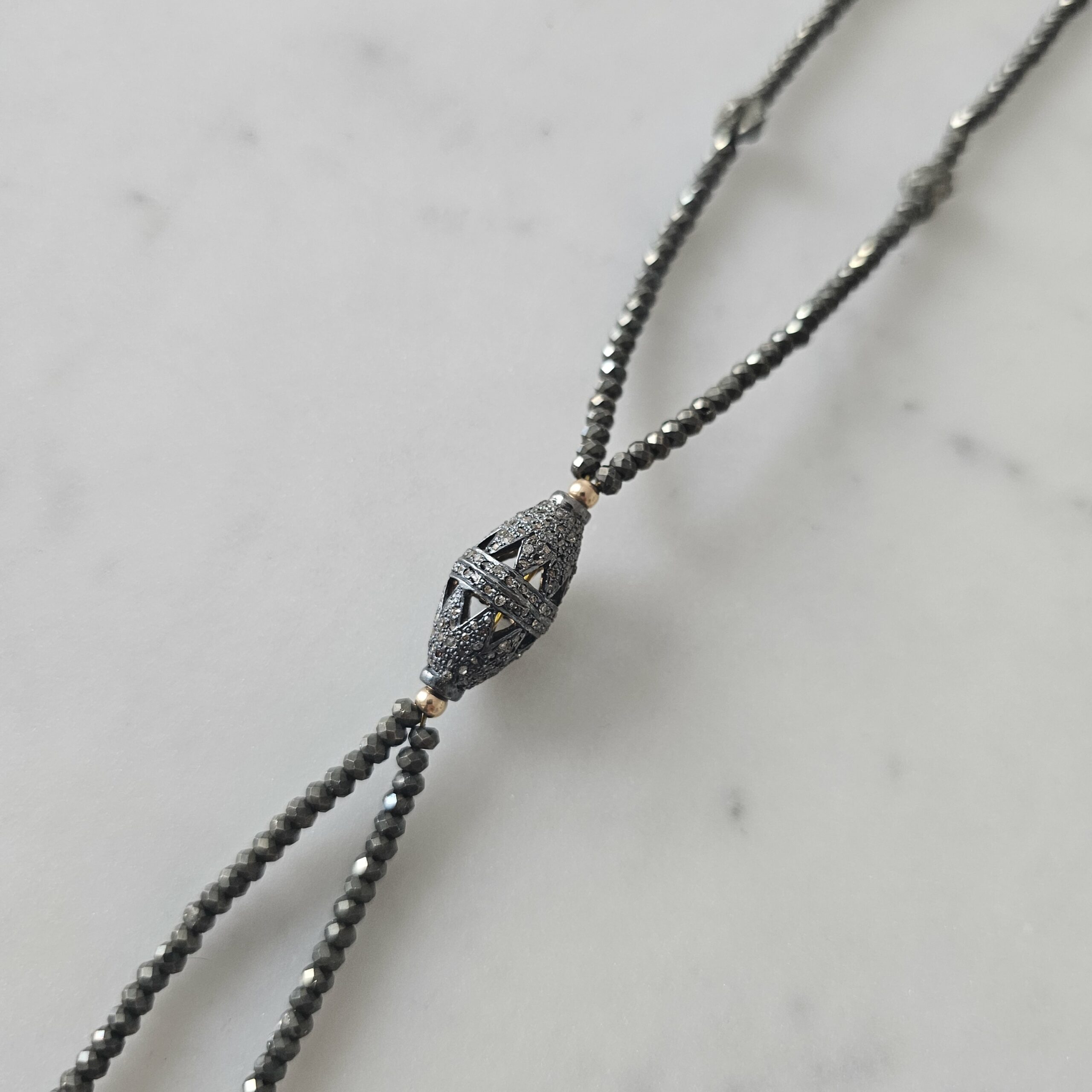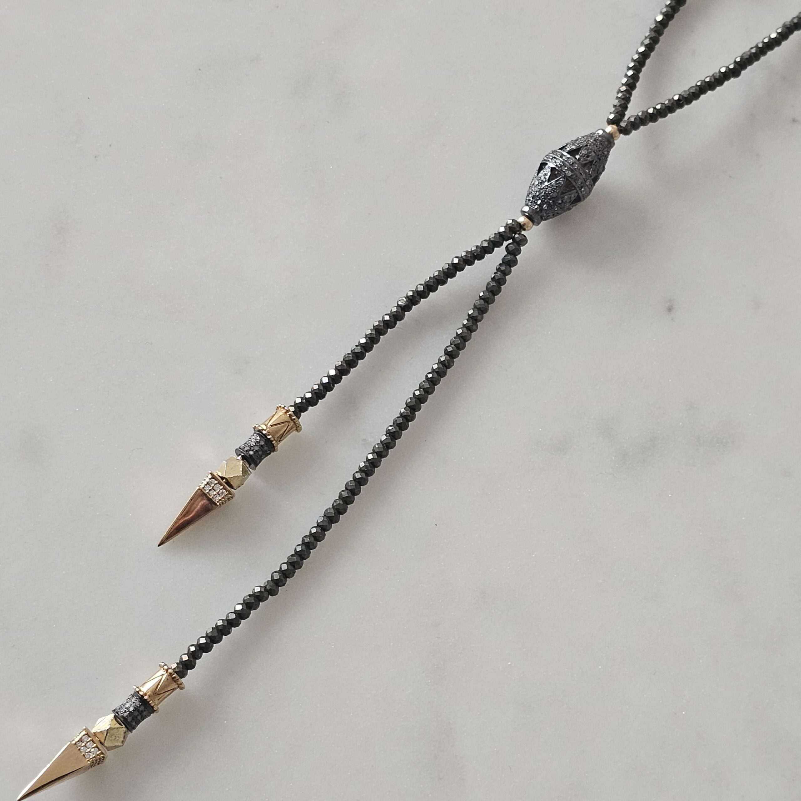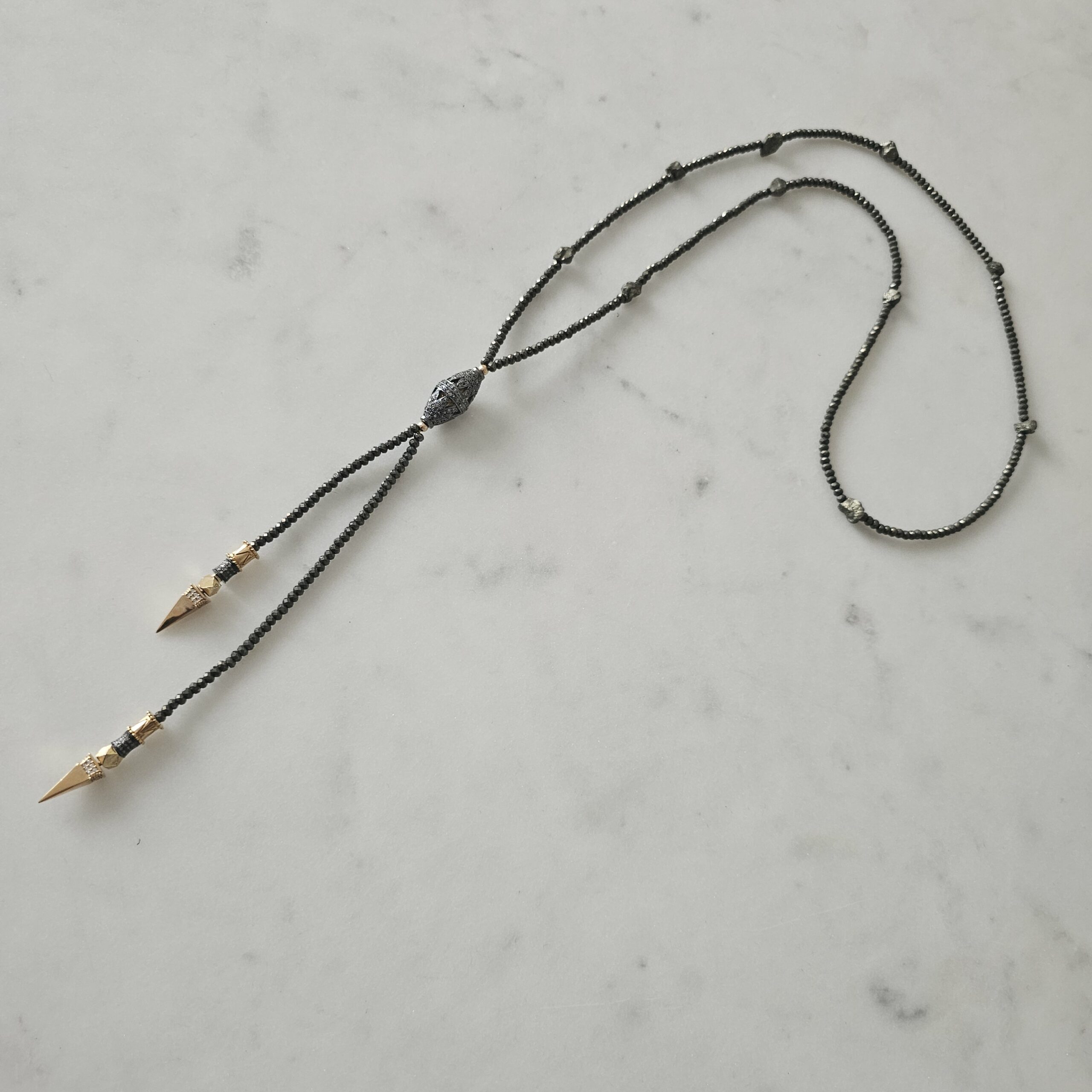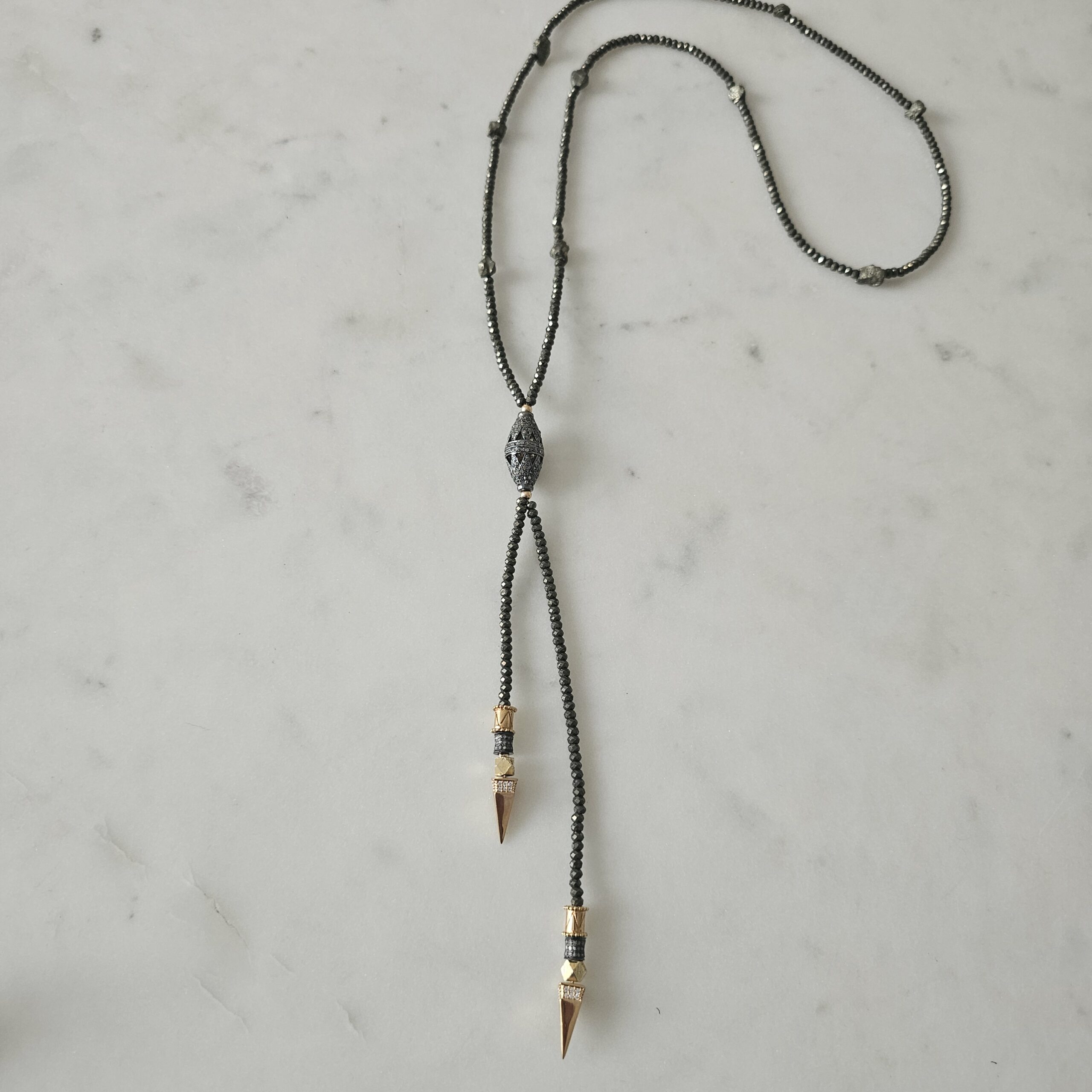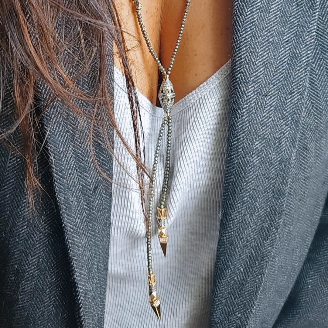 NIRVANA est le sautoir cravate Rock et Chic par définition. Il est tout en pierres de pyrite et plaquée or 3 microns, avec au centre un élément en diamants et argent noir, ainsi que sur les éléments du bas.