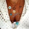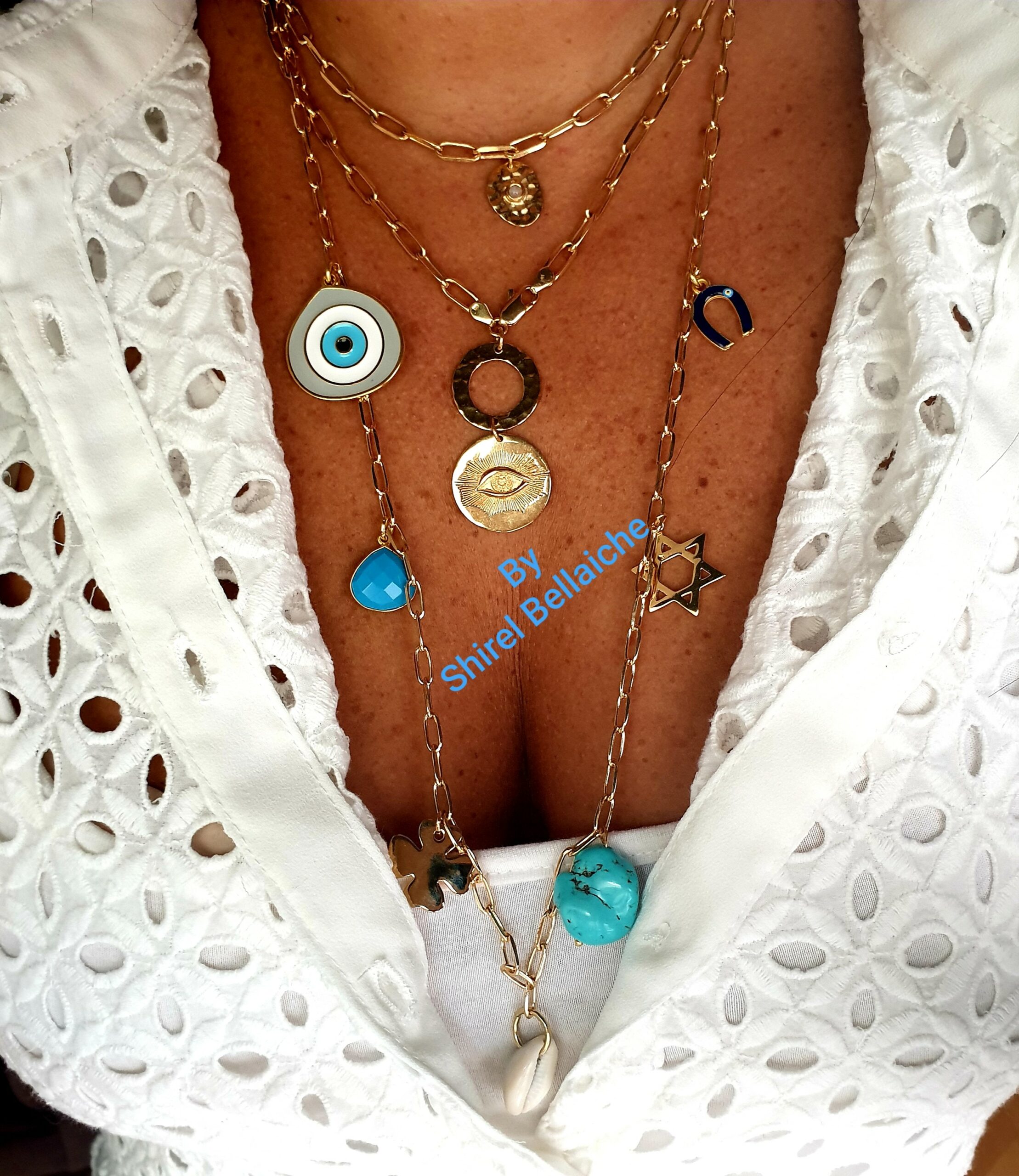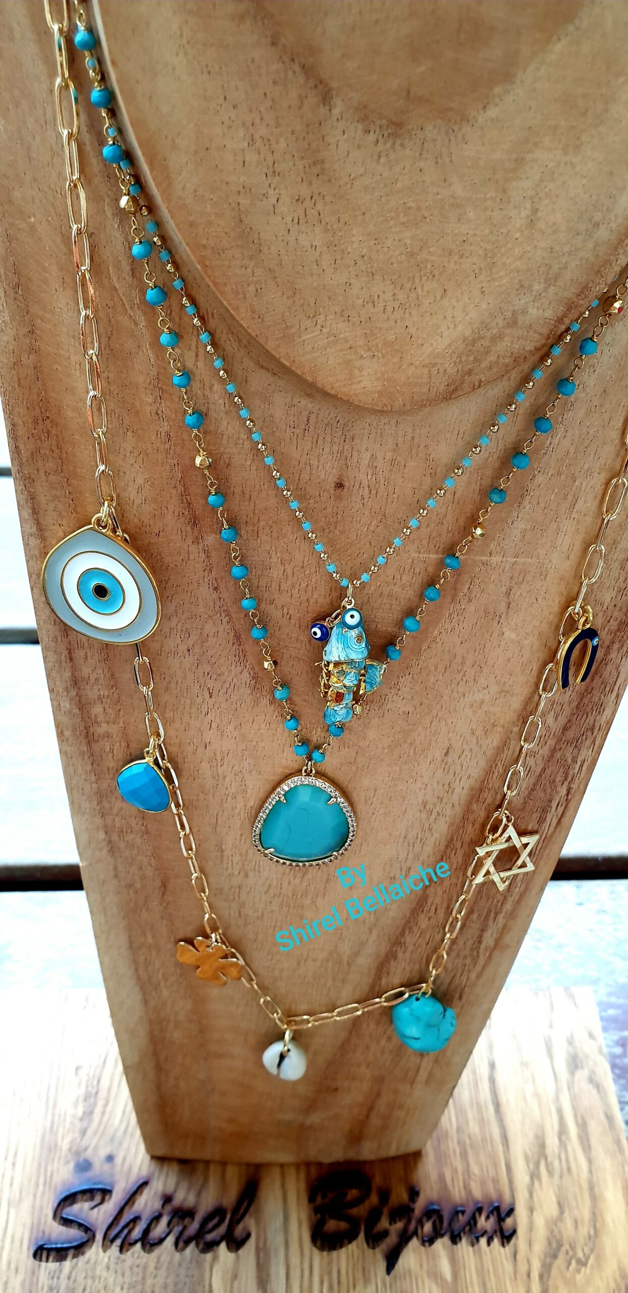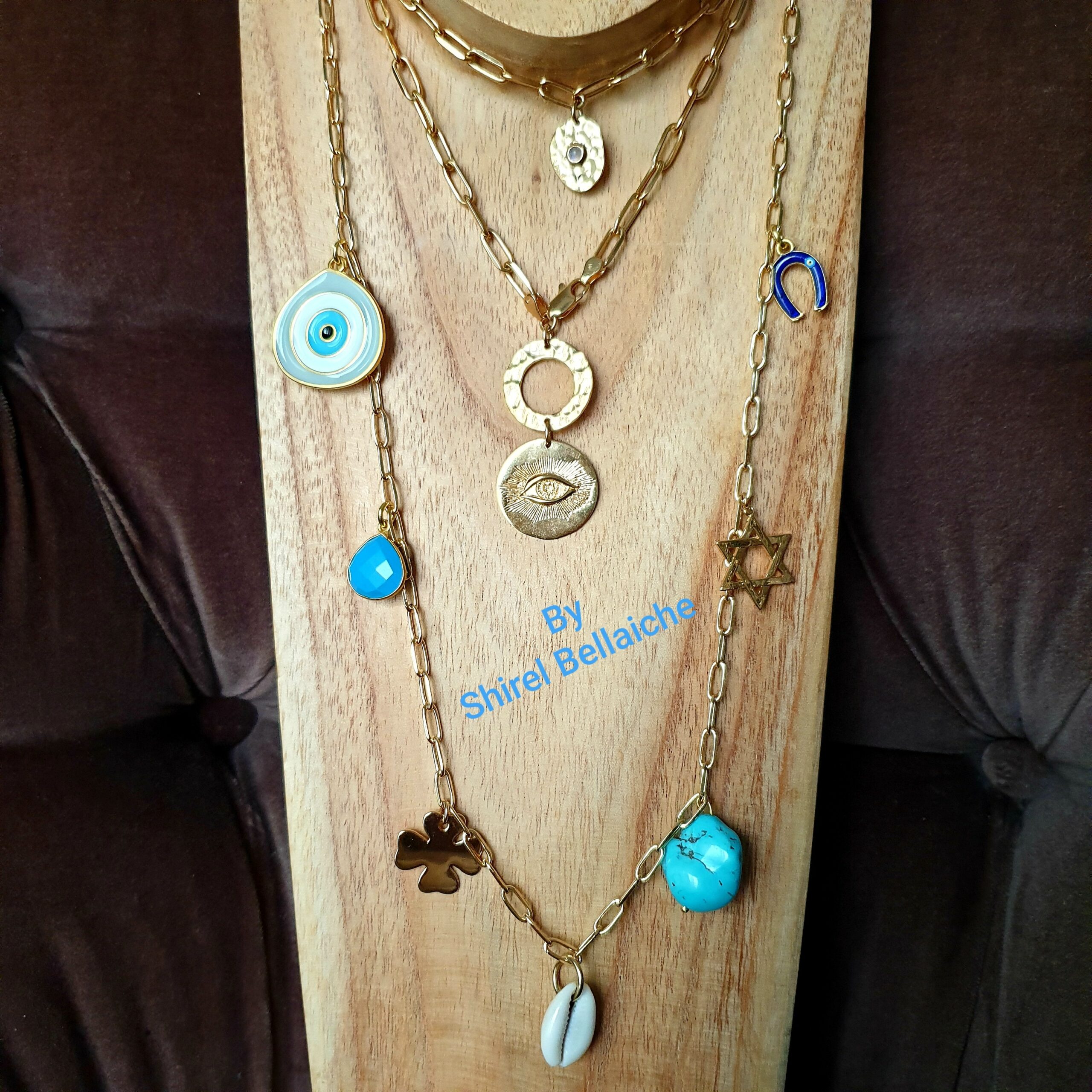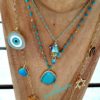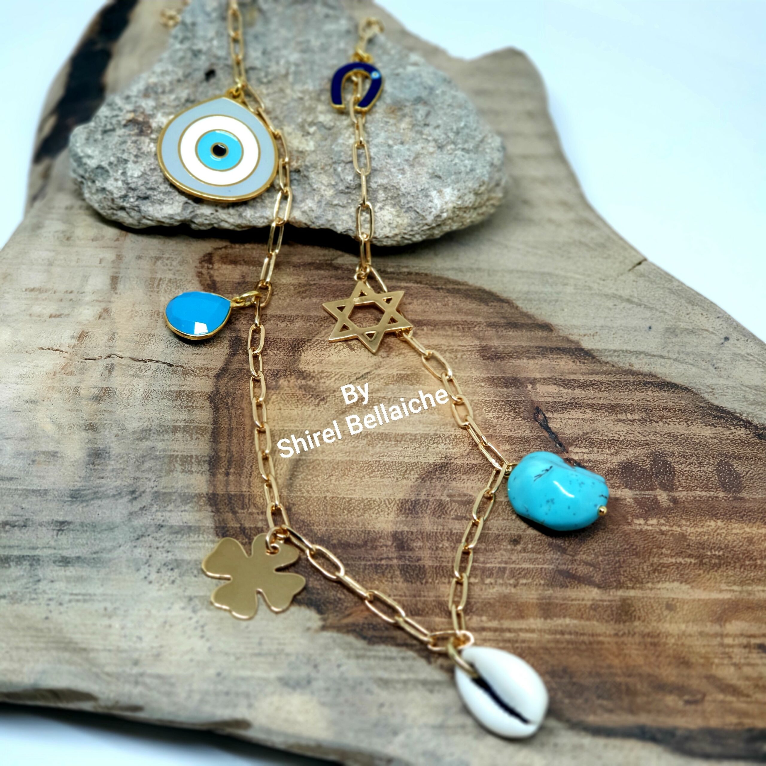 Le sautoir est composé de 7 charms plaqués or pour le trèfle et l étoile de David, d un coquillage, deux pierres turquoise, un oeil en émail et plaqué or puis d un fer à cheval