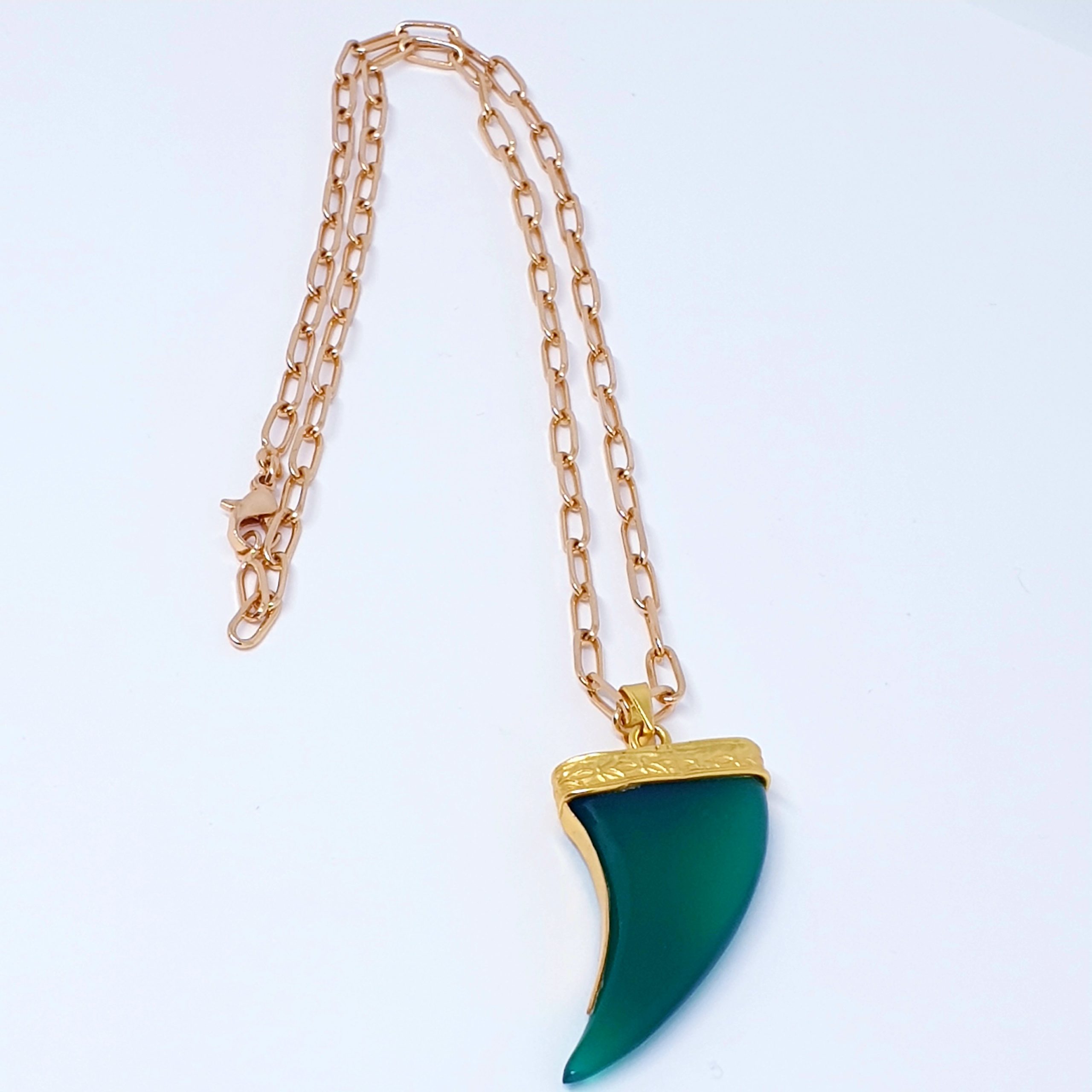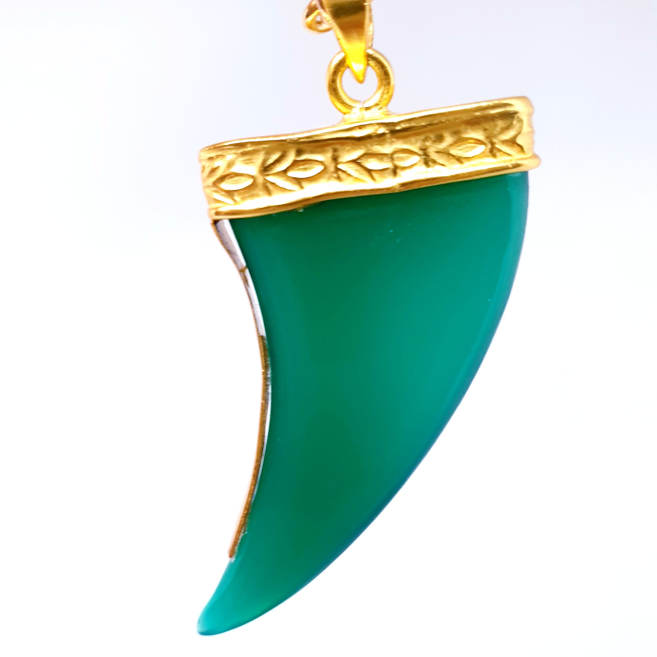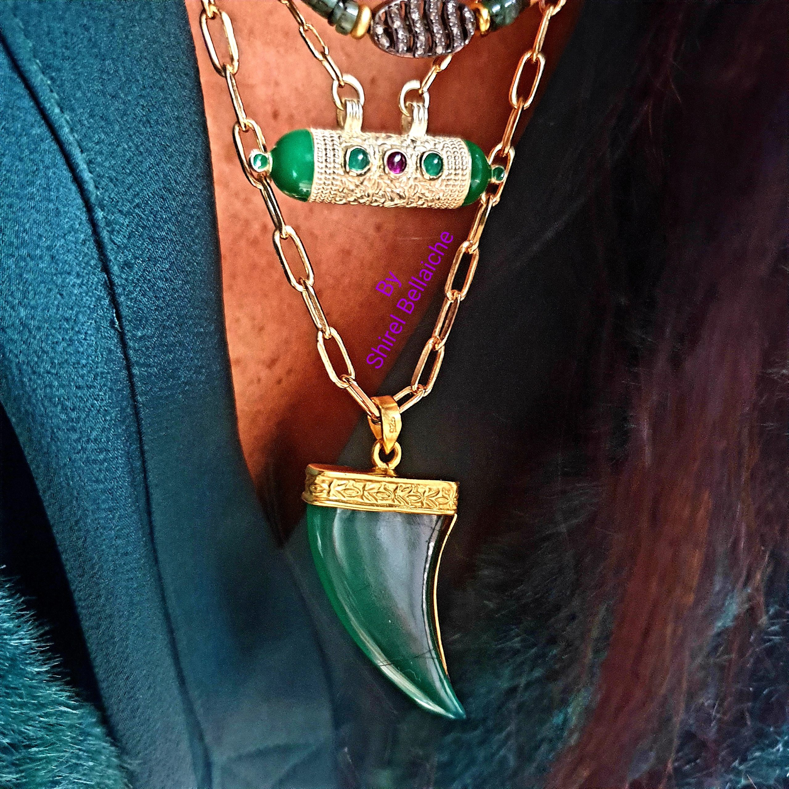 ORELY est un collier inspiré des tendances ethnochic, son pendentif corne en pierre onyx verte est serti tout vermeil avec des motifs finement travaillés.