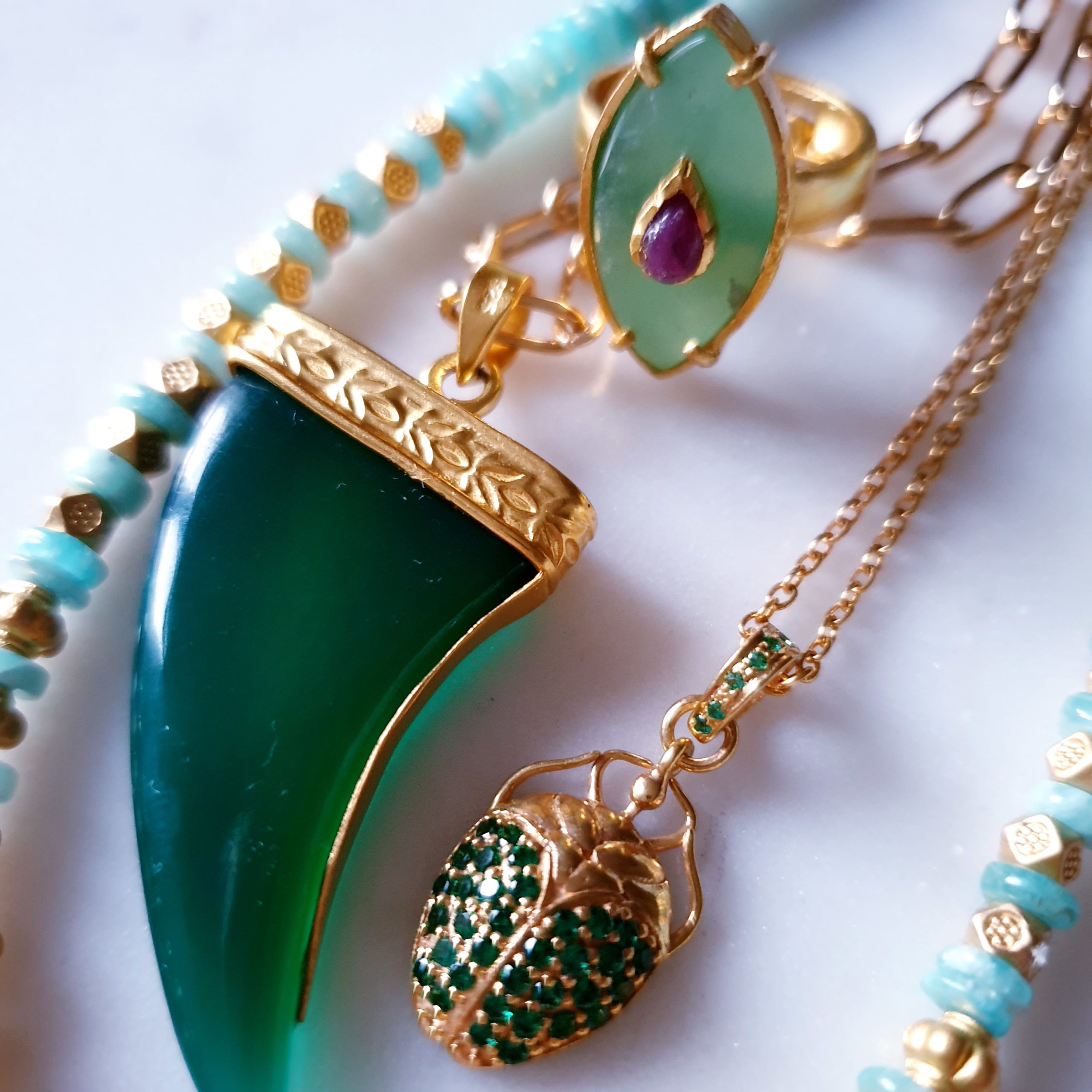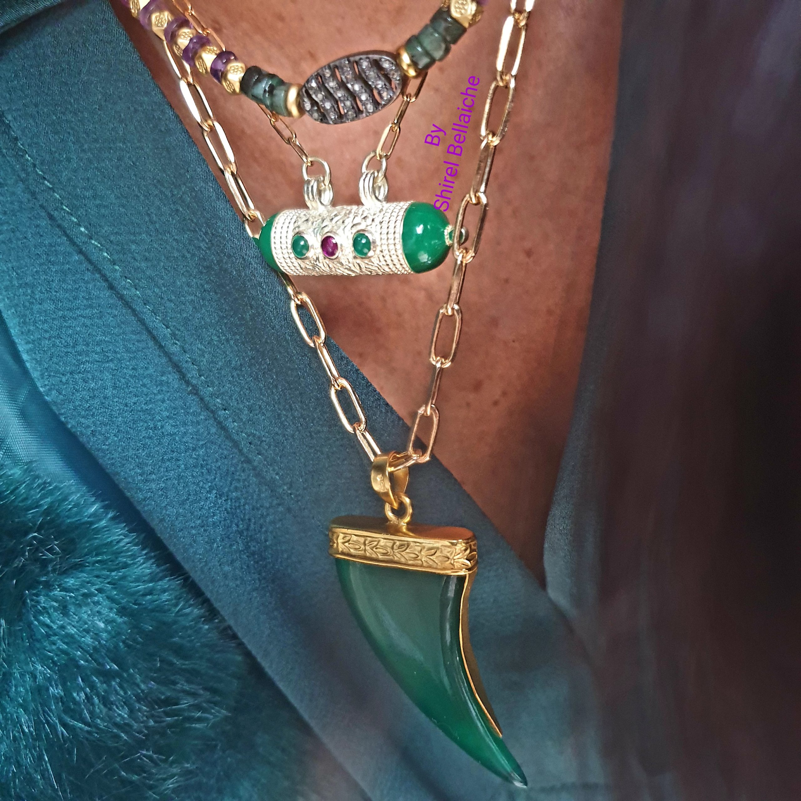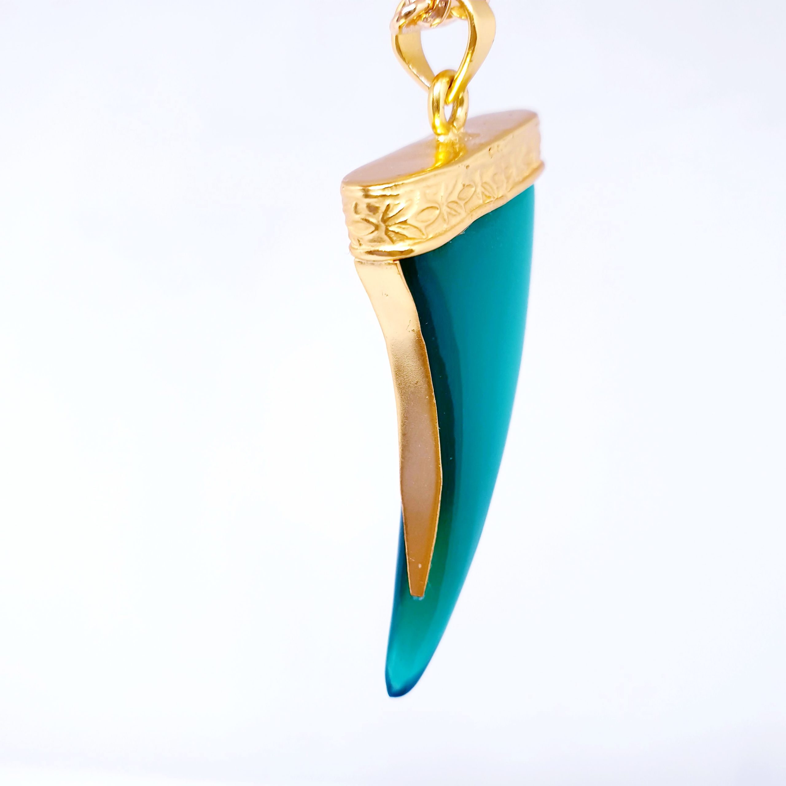 ORELY est un collier inspiré des tendances ethnochic, son pendentif corne en pierre onyx verte est serti tout vermeil avec des motifs finement travaillés.