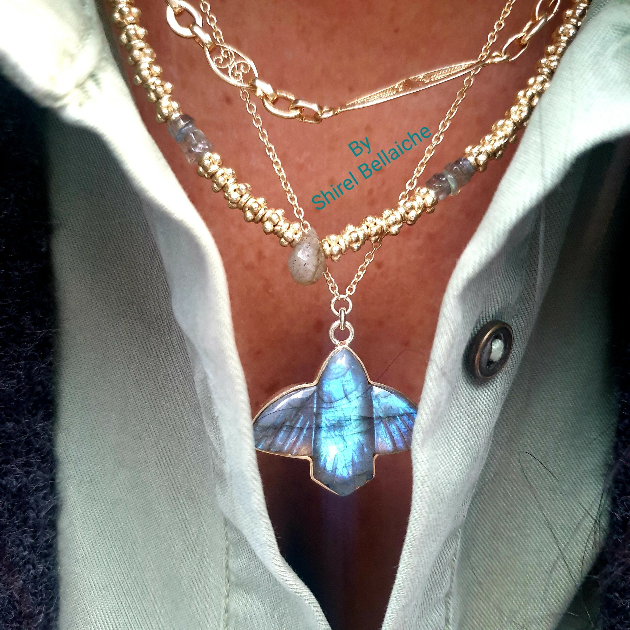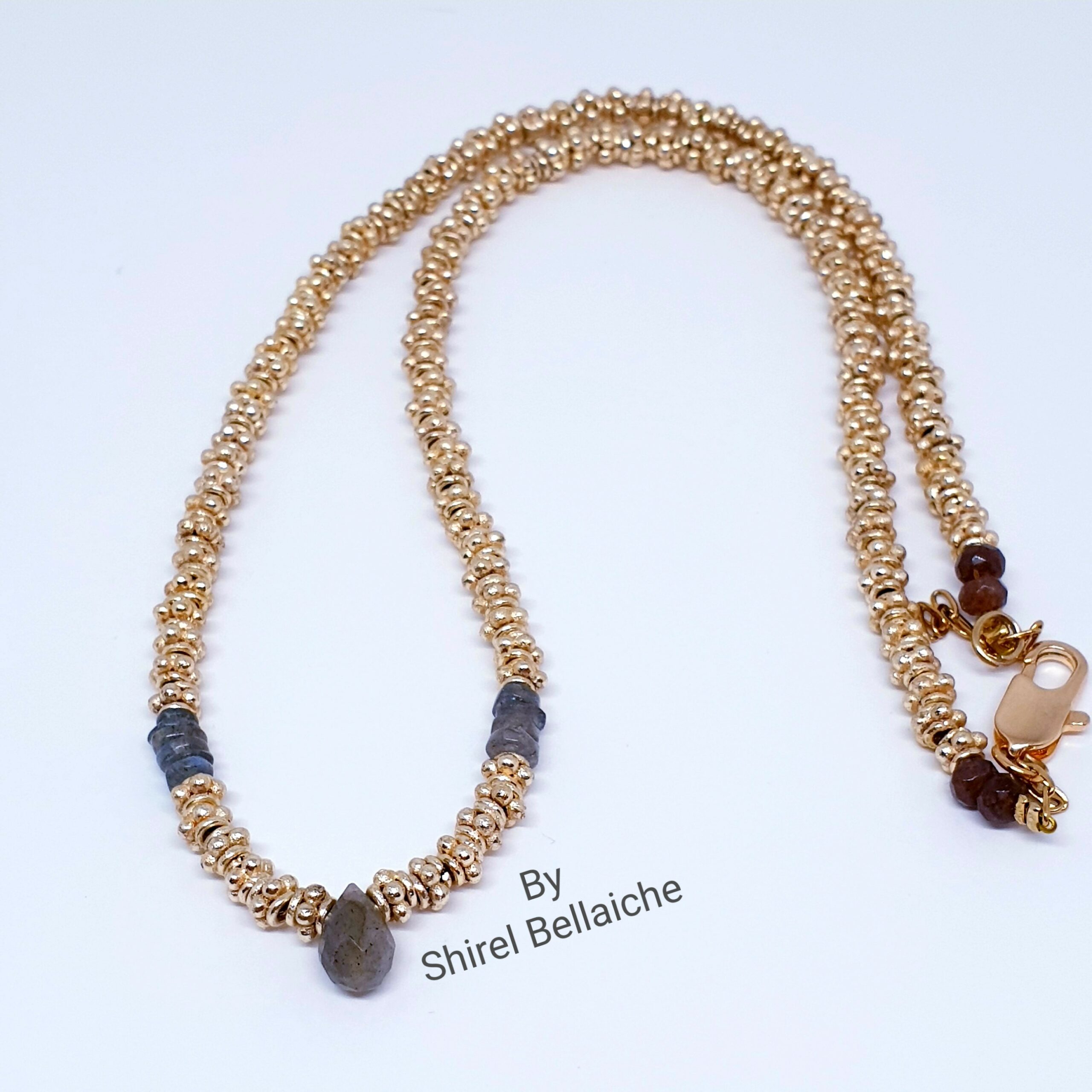 PALMA est un collier chic et intemporel que vous pourrez superposer avec tous vos autres bijoux. Il est tout en perles plaquées or avec un rappel de perles labradorite, afin de souligner la goutte centrale elle aussi en labradorite.