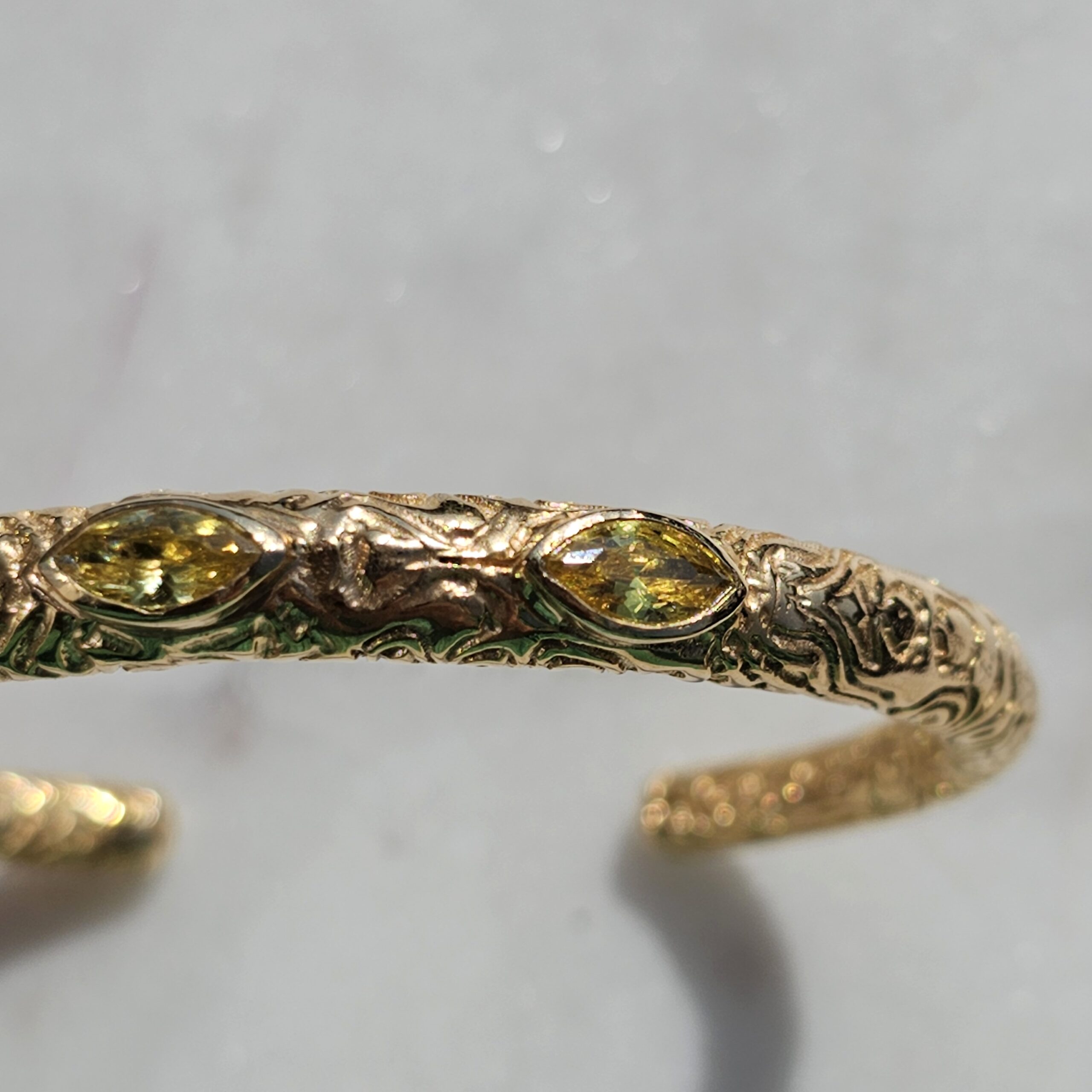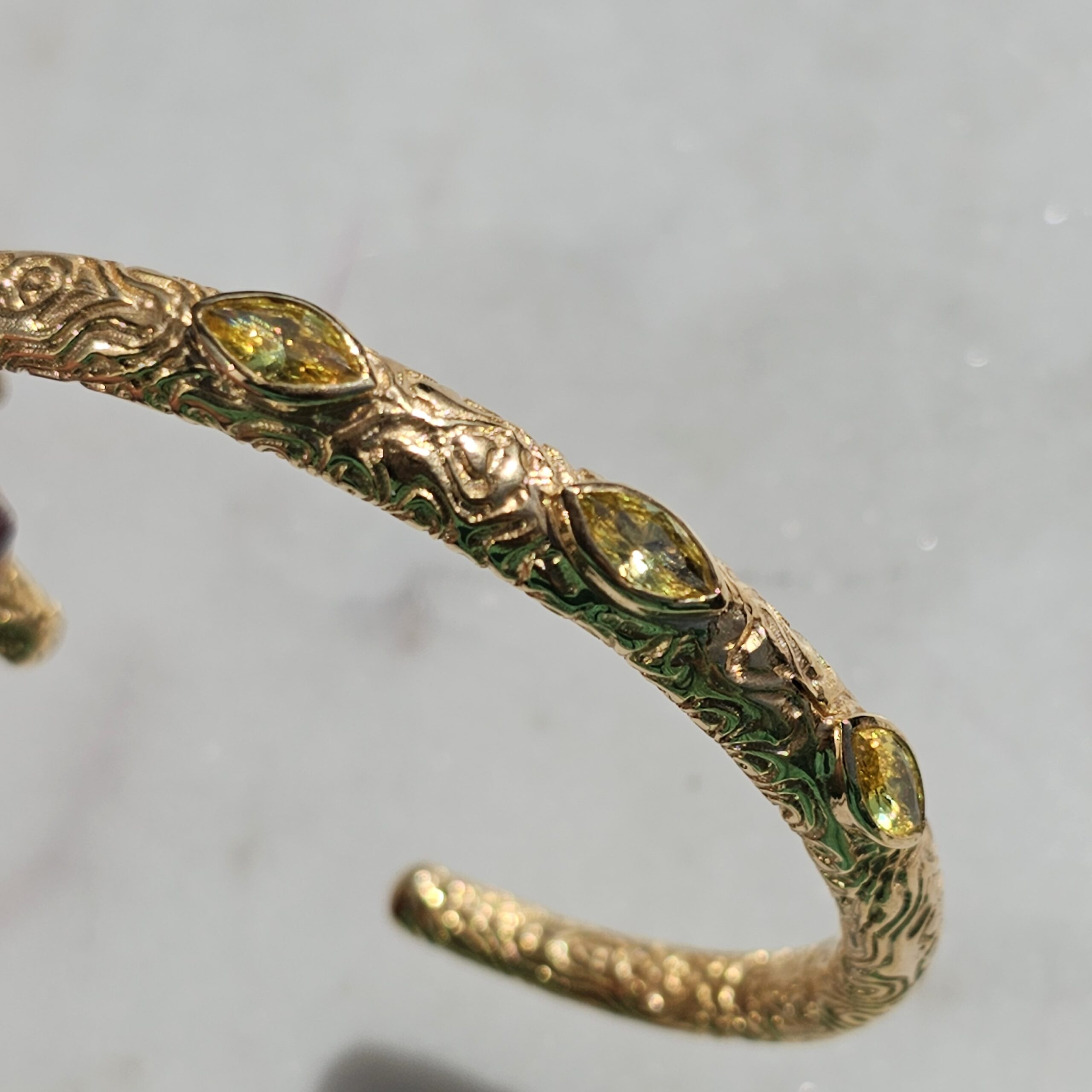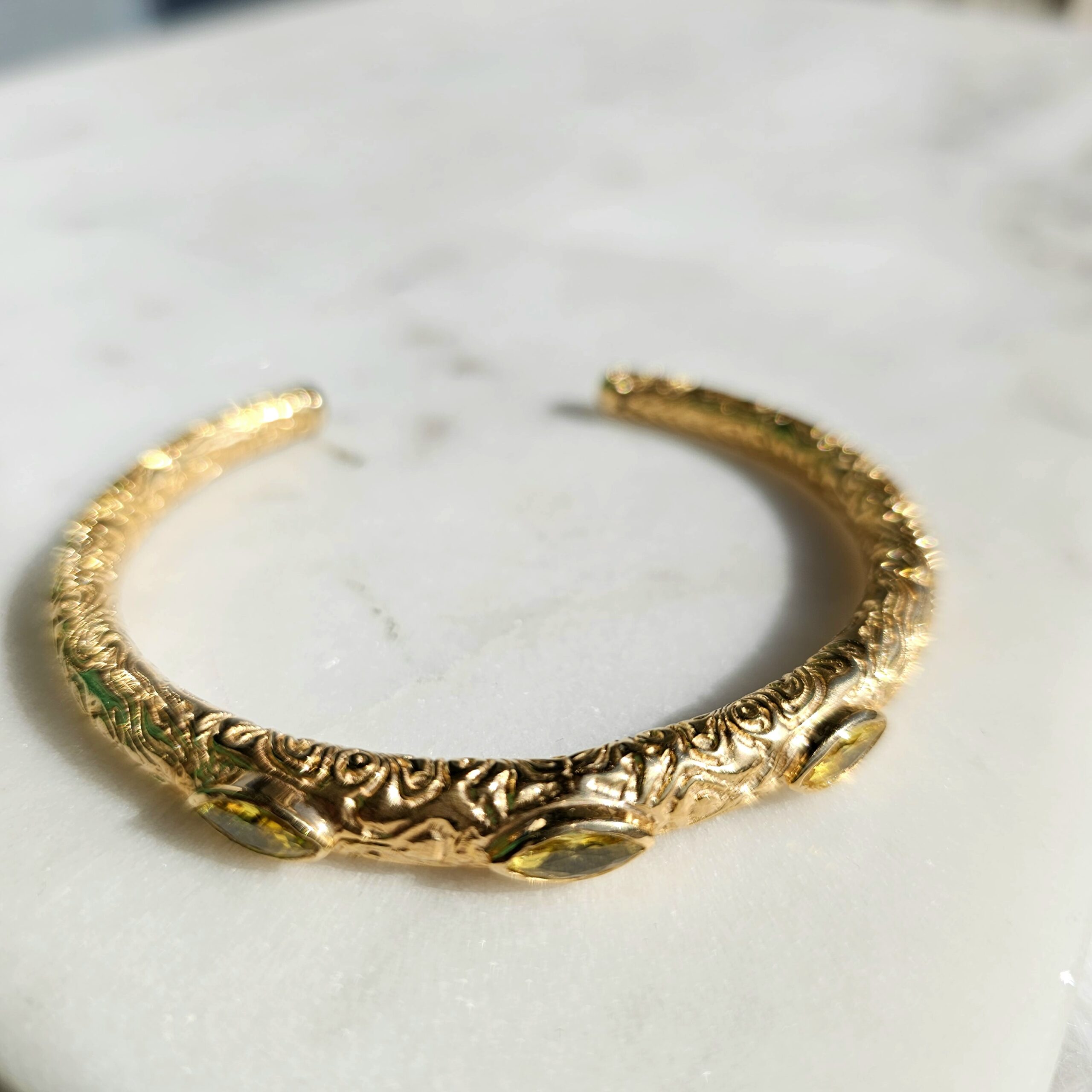 PANTHERE est un jonc ouvert tout en argent massif plaqué or avec trois marquises citrine.