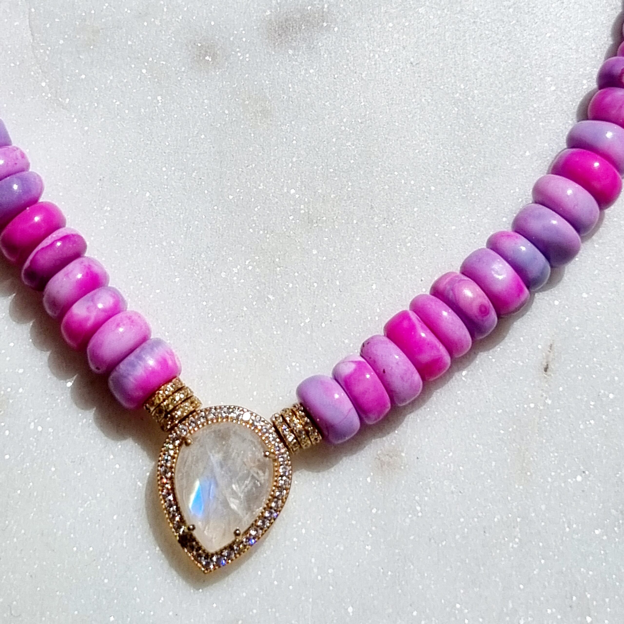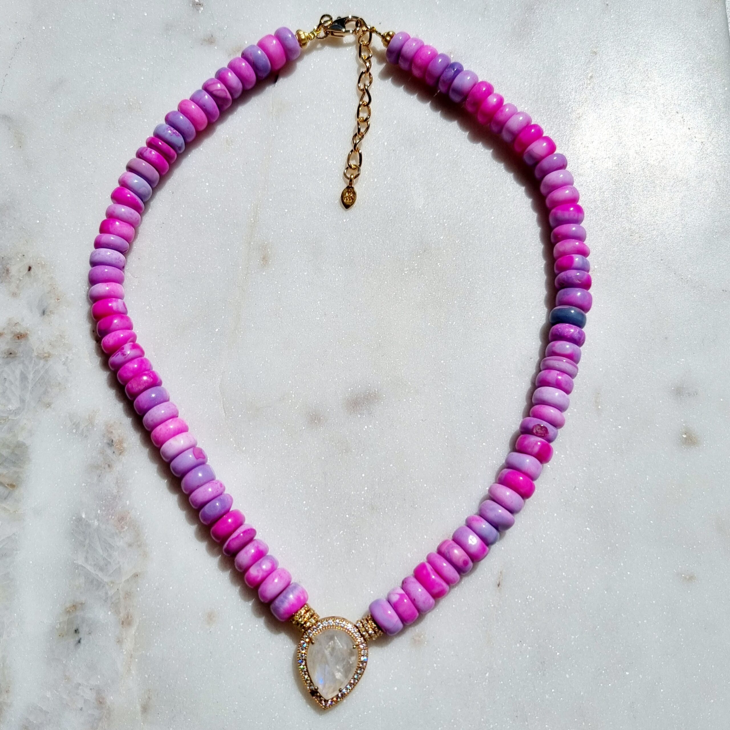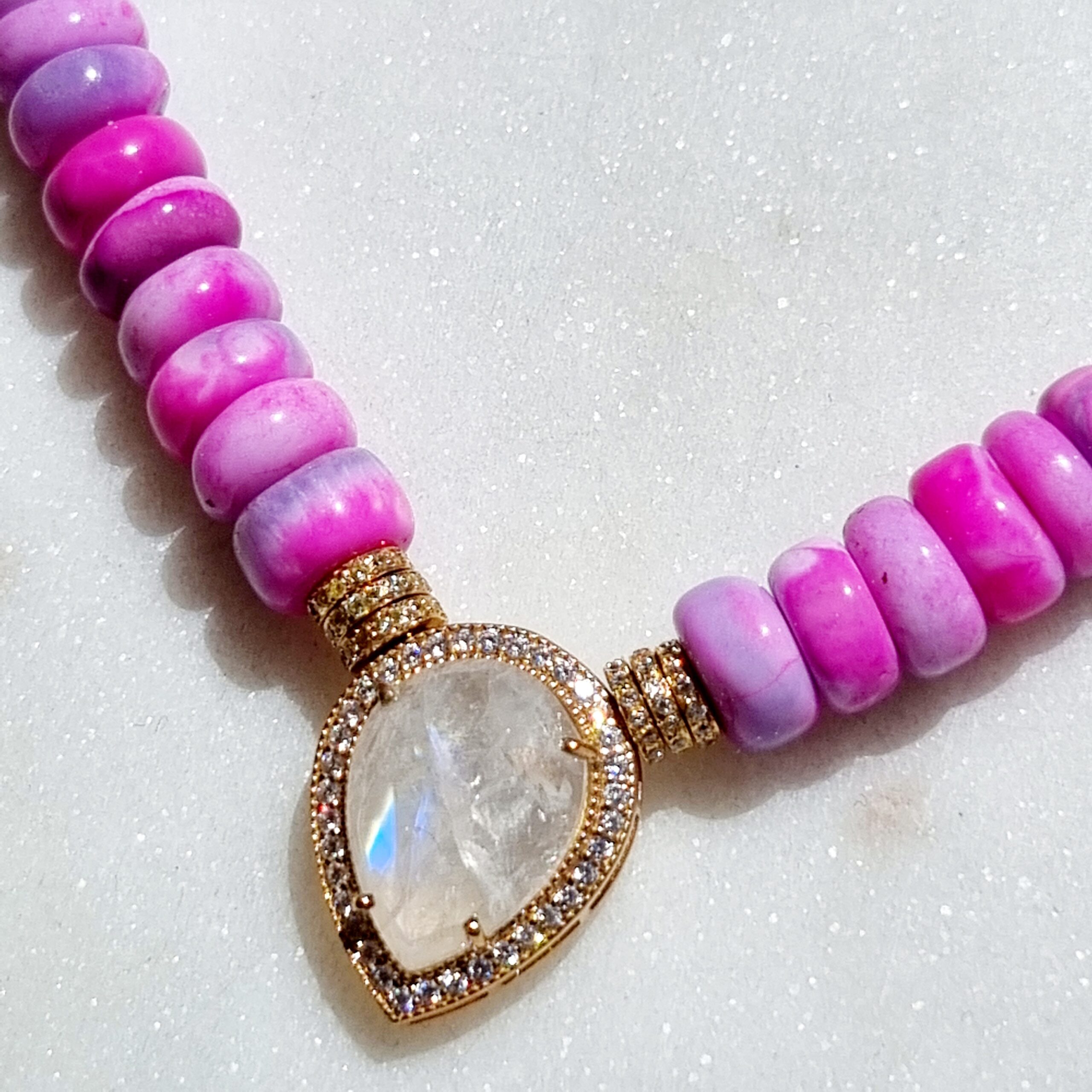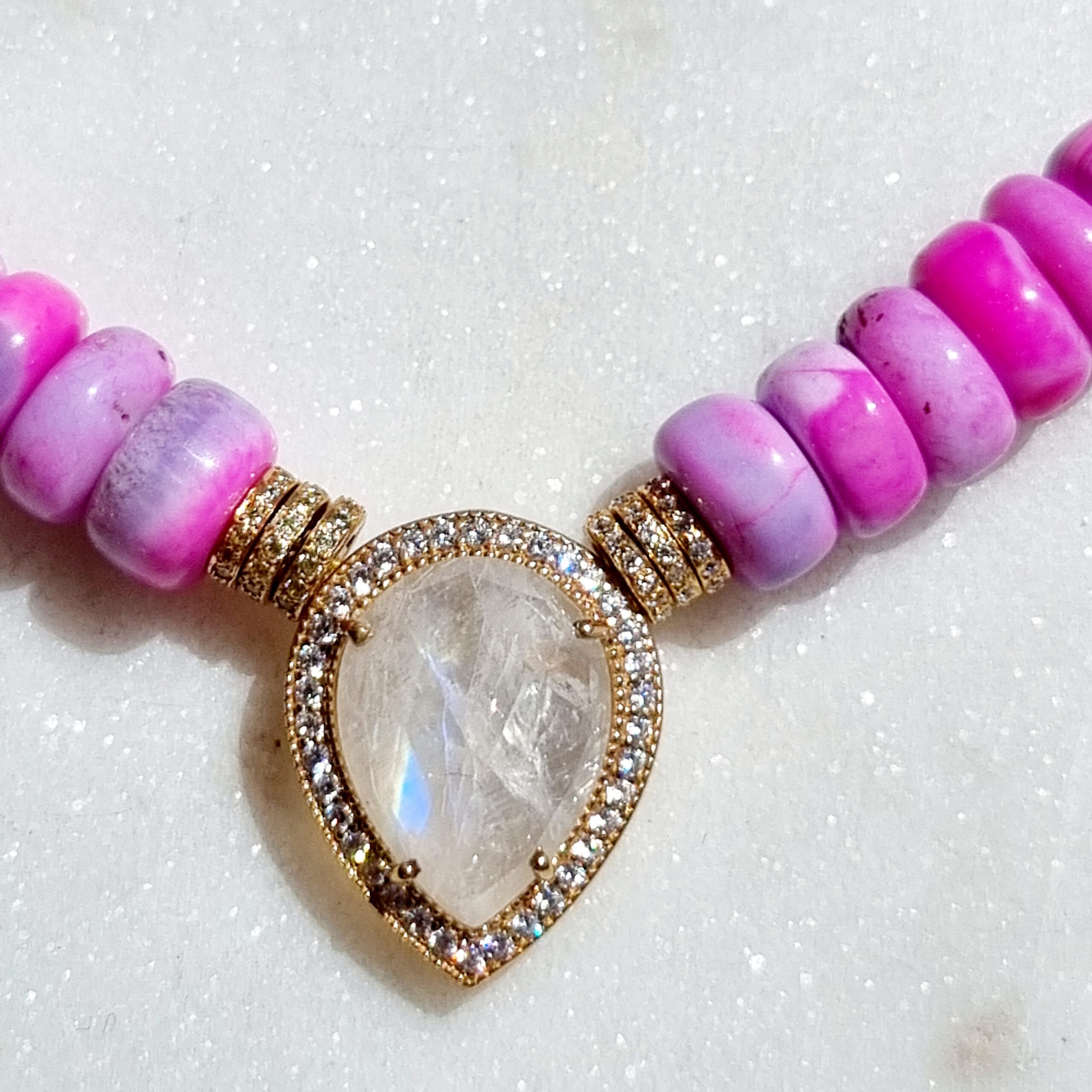 Queen est un collier tout en opales fushia avec au centre une goutte labradorite blanche, sertie de zircons. Elle est entièrement montée sur une base d’argent massif plaquée or.