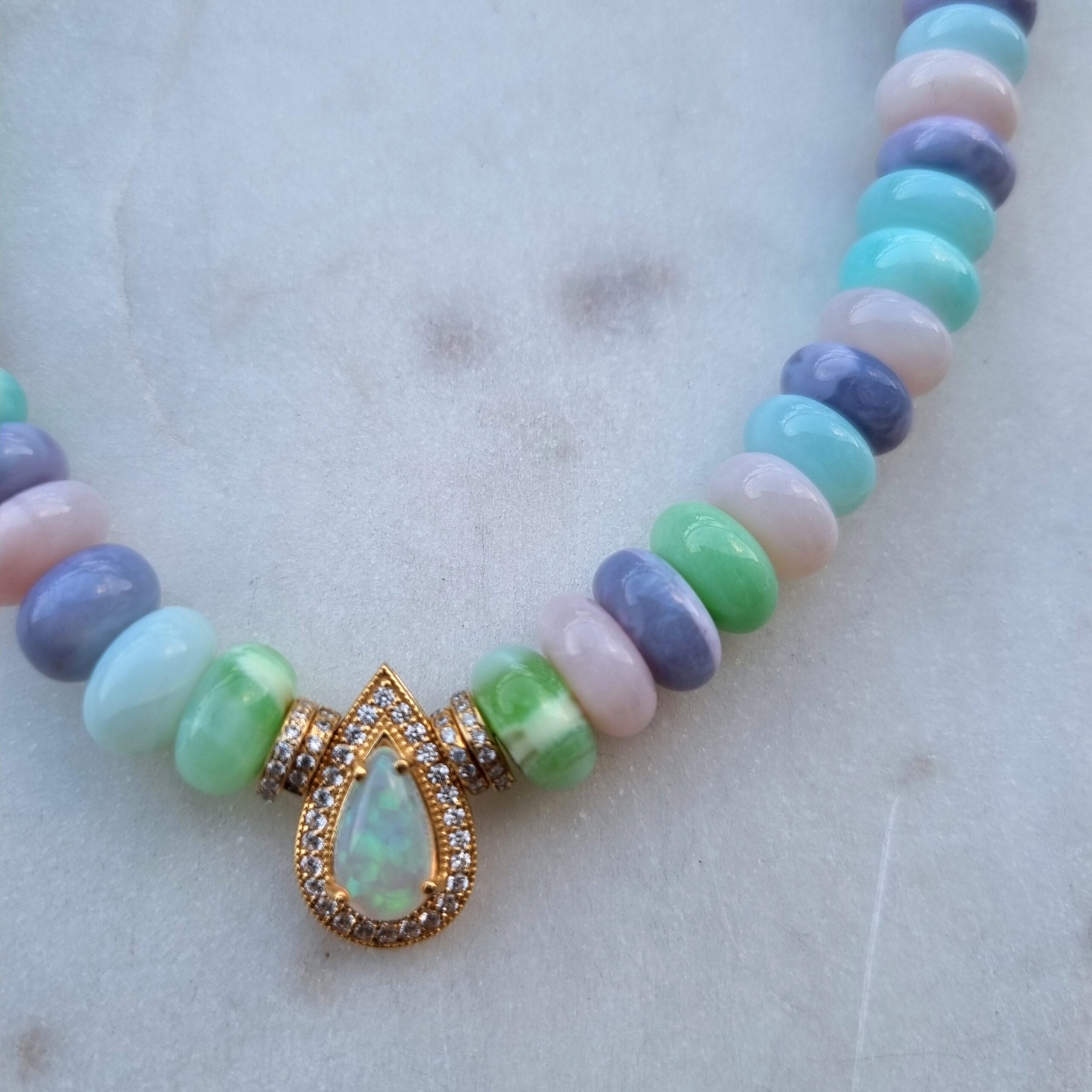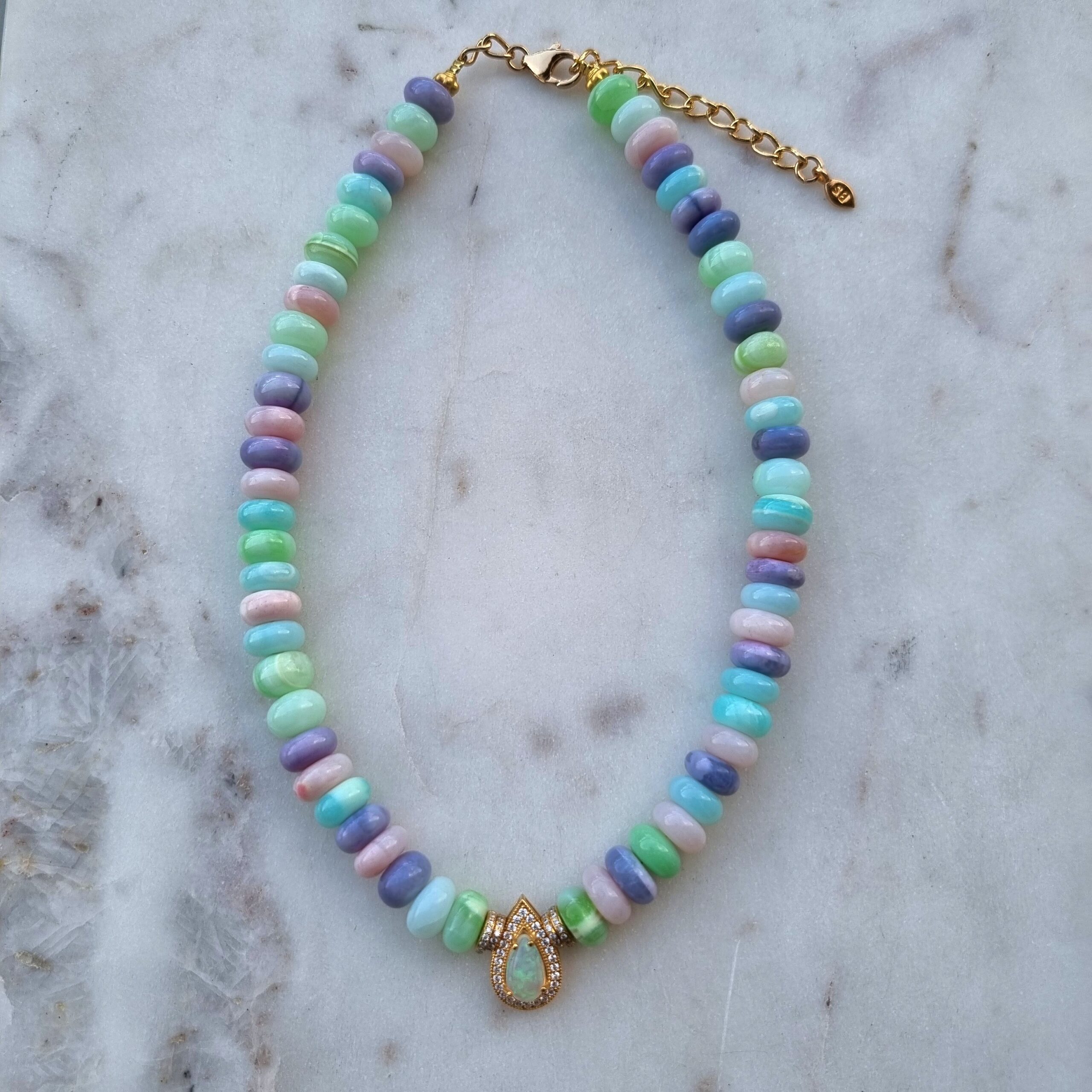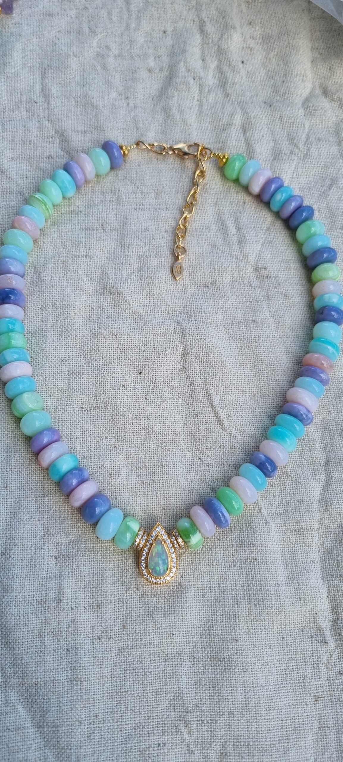 Rainbow est un collier entièrement d’opales multi couleurs avec au centre une goutte toute vermeil plaquée or.