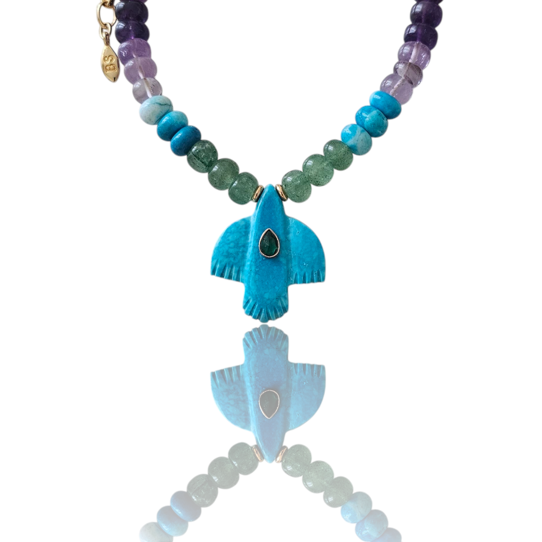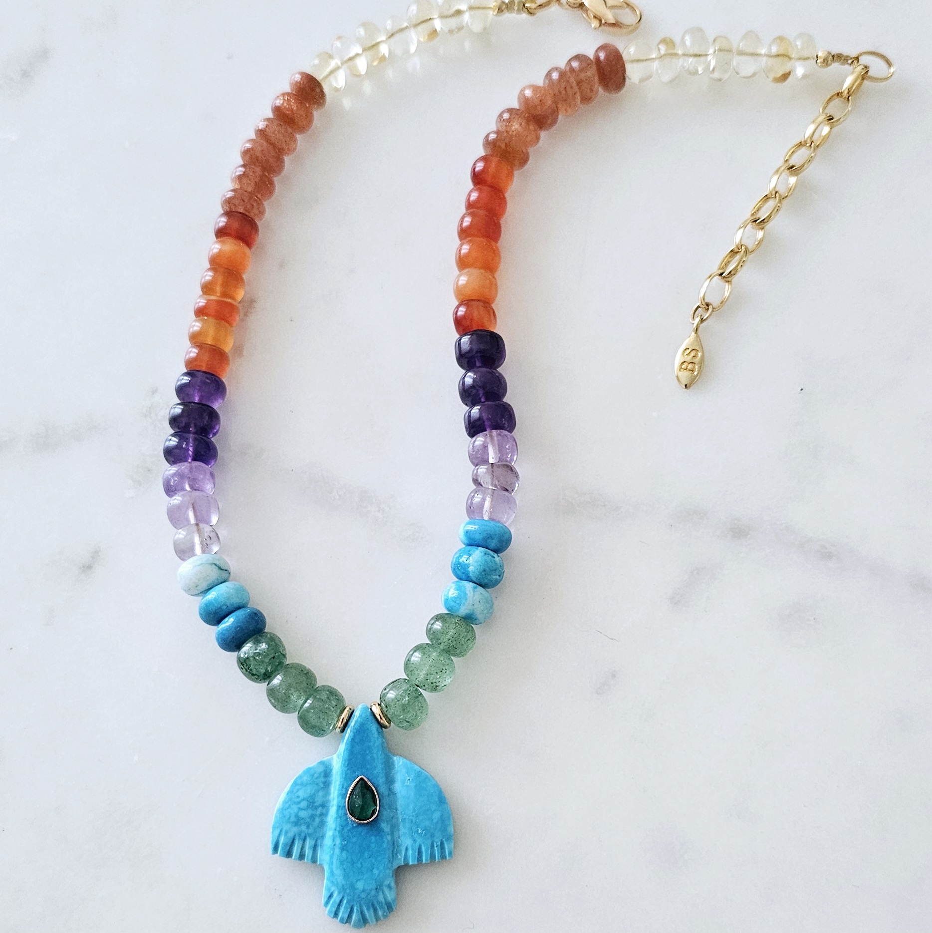 RAINBOWN PHOENIX est un collier multi pierres telles que, citrine, pierre de soleil, cornaline, améthyste, améthyste rose, opale bleue et strawberry vert avec un phœnix turquoise serti d’une onyx vert.