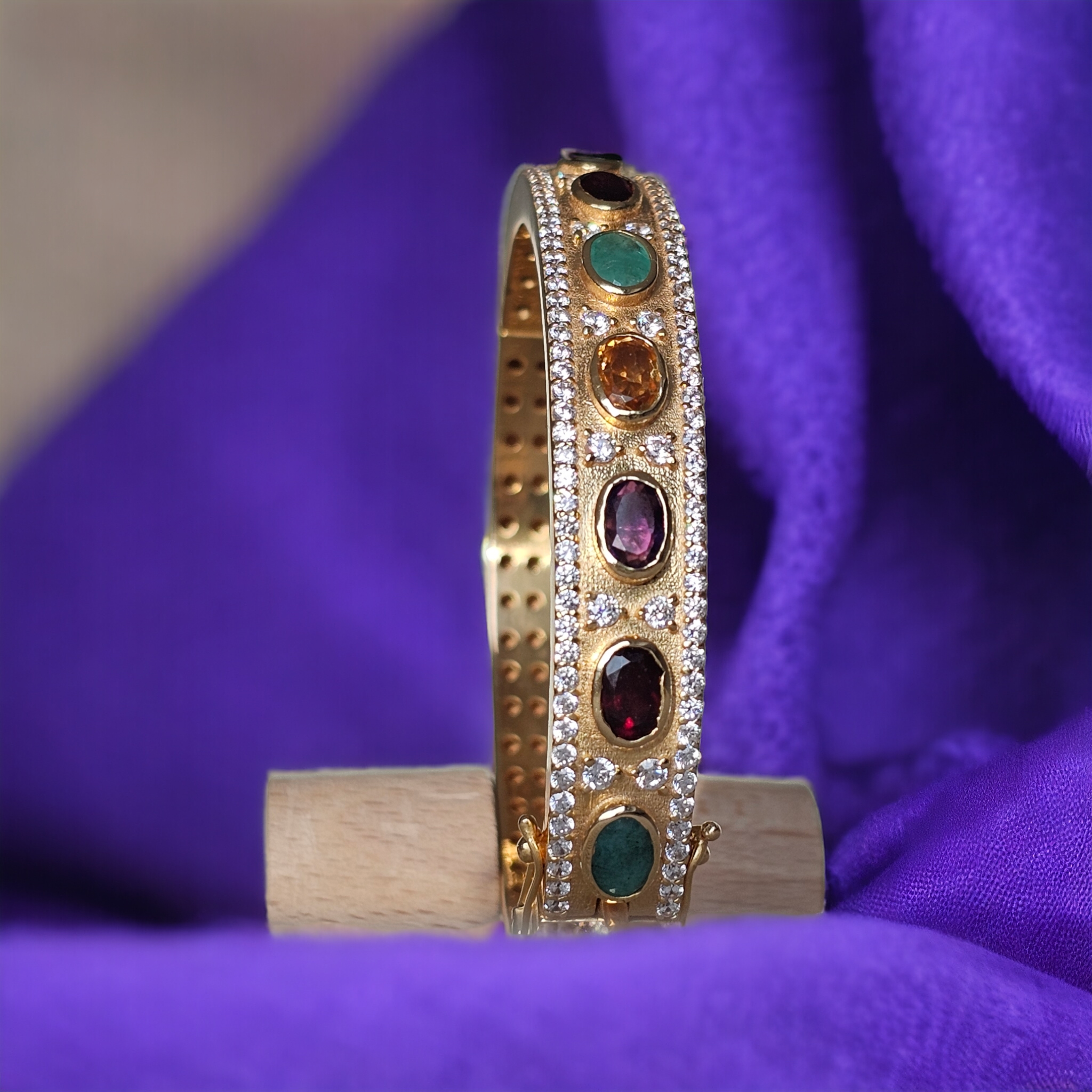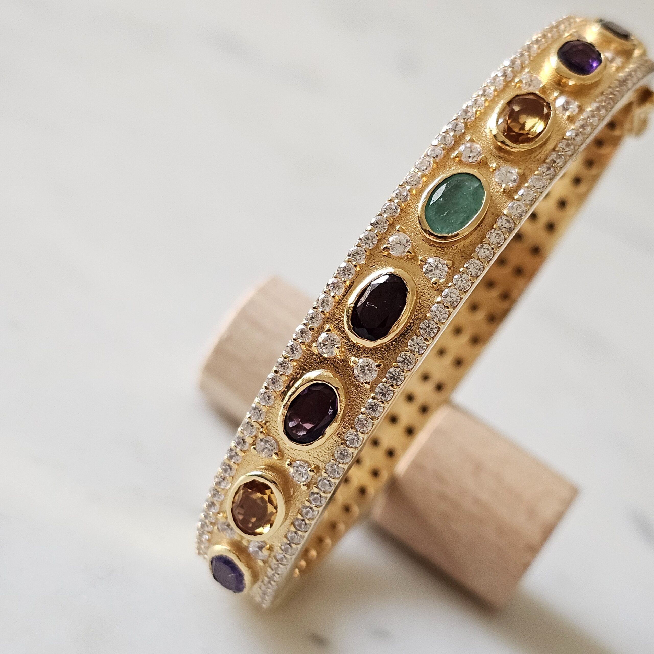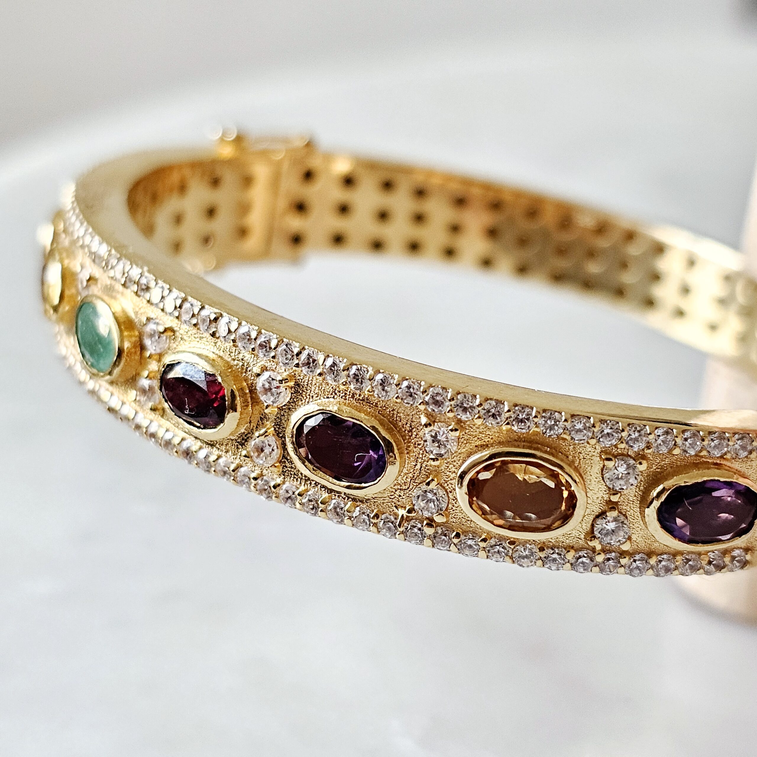 RIO est tout en argent plaqué or, orné de plusieurs pierres naturelles telles que l’améthyste, la citrine, l’ aventurine et le grenat. Le jonc est tout serti de zicons.