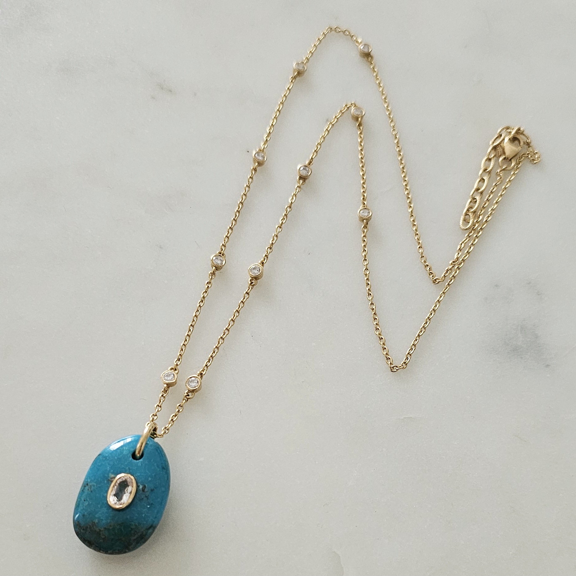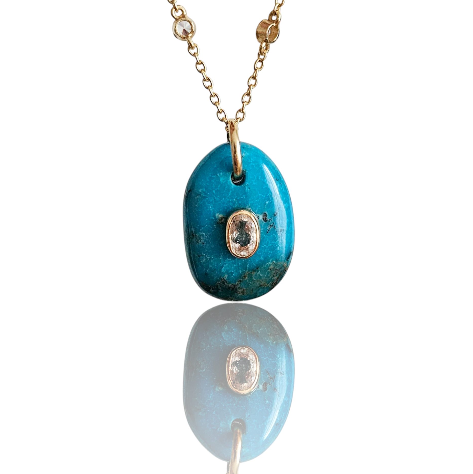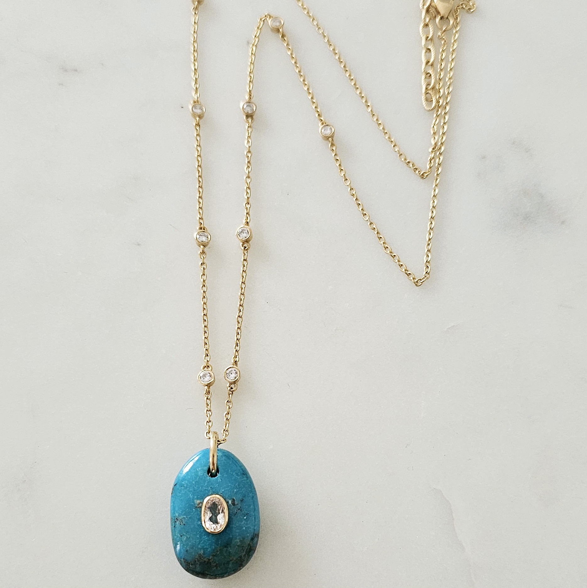 RIVER est tout en plaqué or et zircon, avec un pendentif oval turquoise avec au centre un zircon incrusté serti plaqué or.