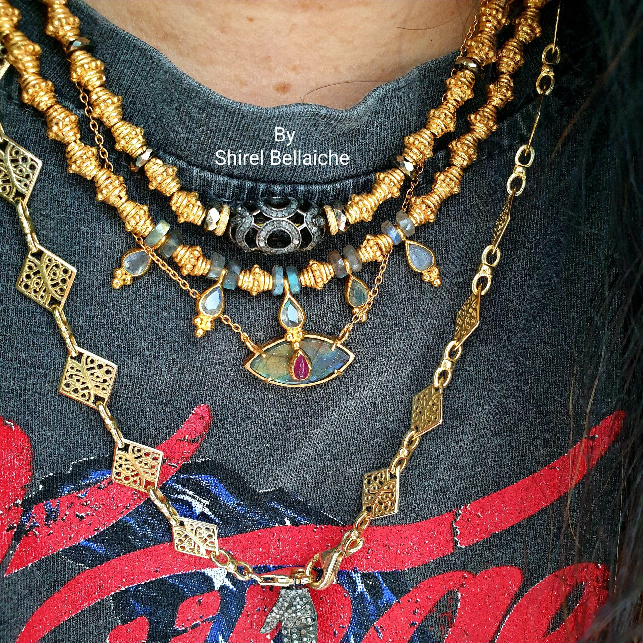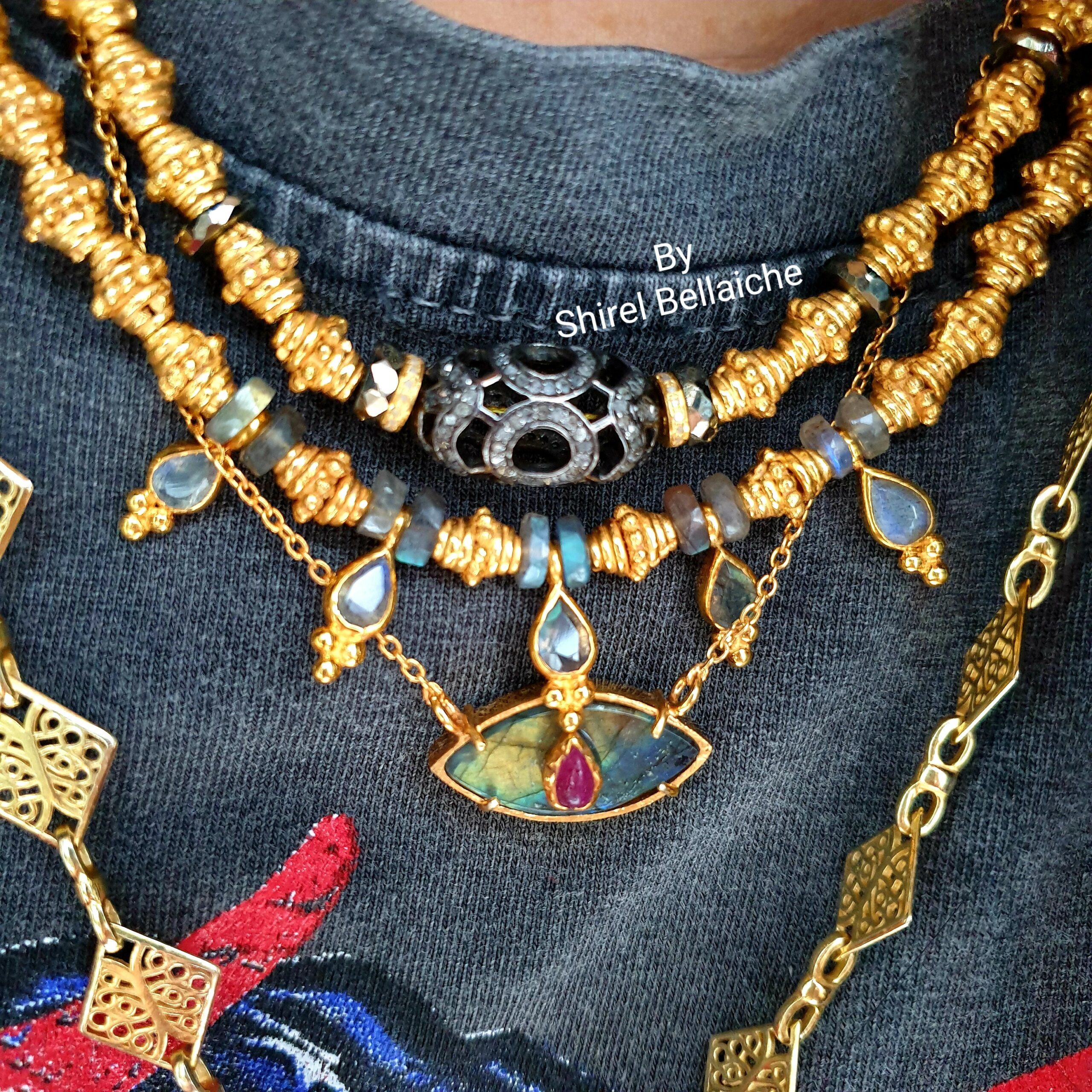 ROSANA est un collier qui mixe le Vintage avec le contemporain, de part son contraste de perles plaquées or 3 microns mattes et sa perle centrale en filigrane en argent noir 925 et diamants. Vous trouverez également des touches de perles en pyrite facettées.