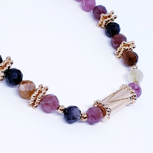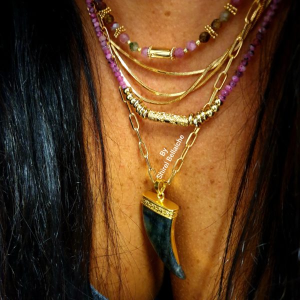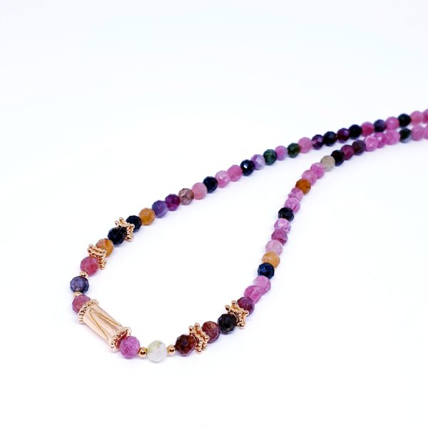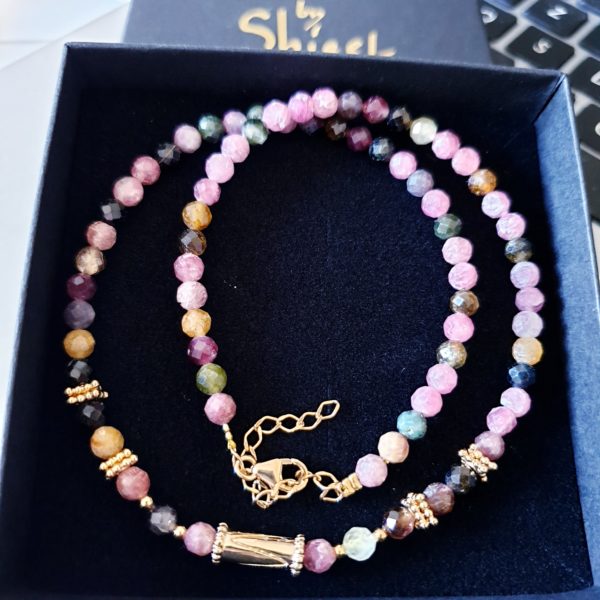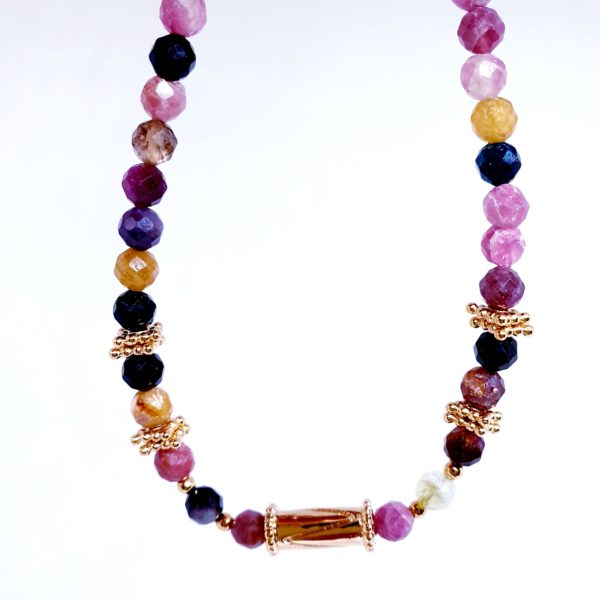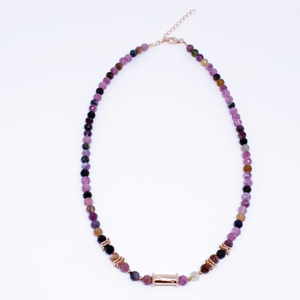 ROSY est un ras de cou de 40 cm tout en perles de tourmaline et plaquées or 3 microns, avec au centre une perle tube plaquée or 3 microns .
