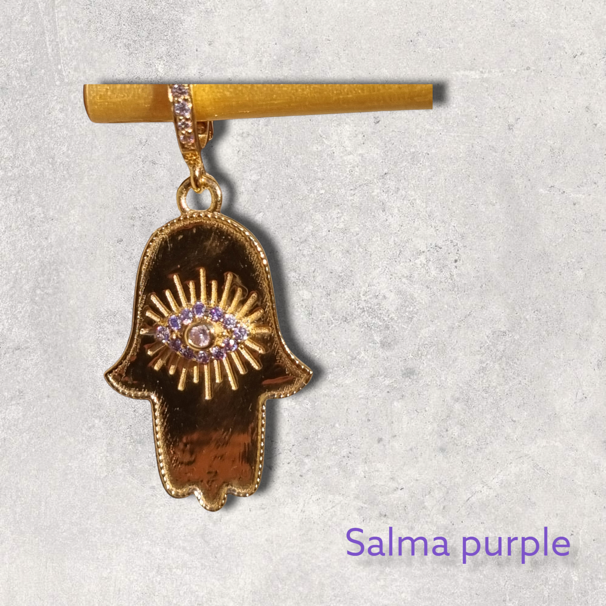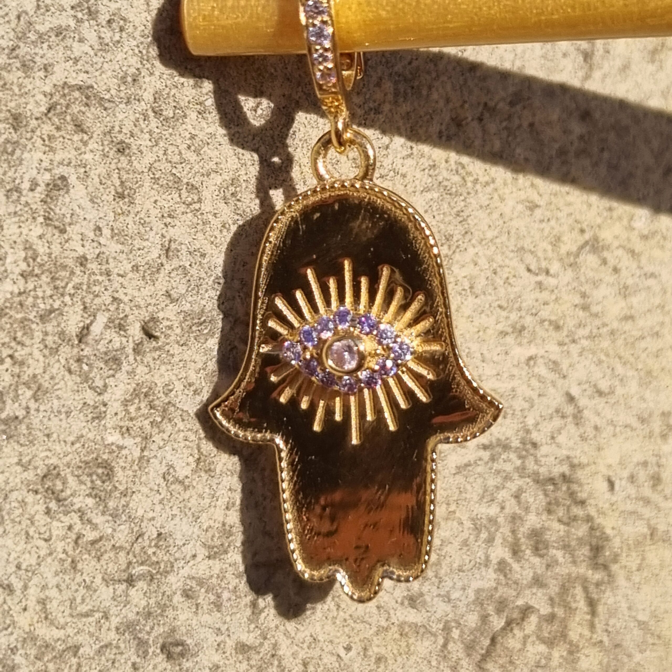 SALMA est un charm talisman main de protection connue aussi sous le nom de Hamsa inspirée des bijoux traditionnels orientaux. Double symboles de protection par un petit œil au centre. Sa bélière ouvrable sertie de zircons vous permet d’attacher le charm à une chaîne ou cordon de votre choix.