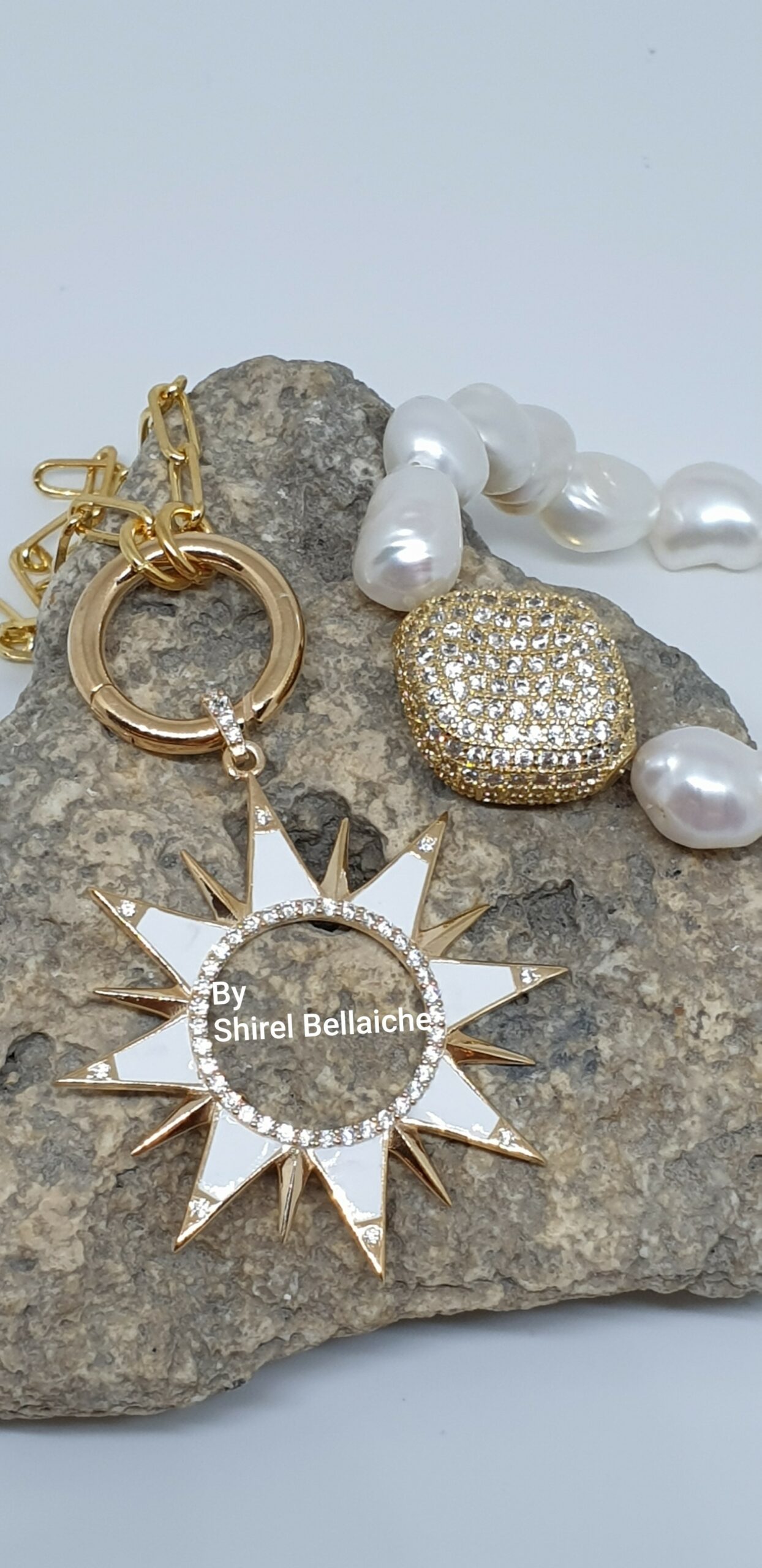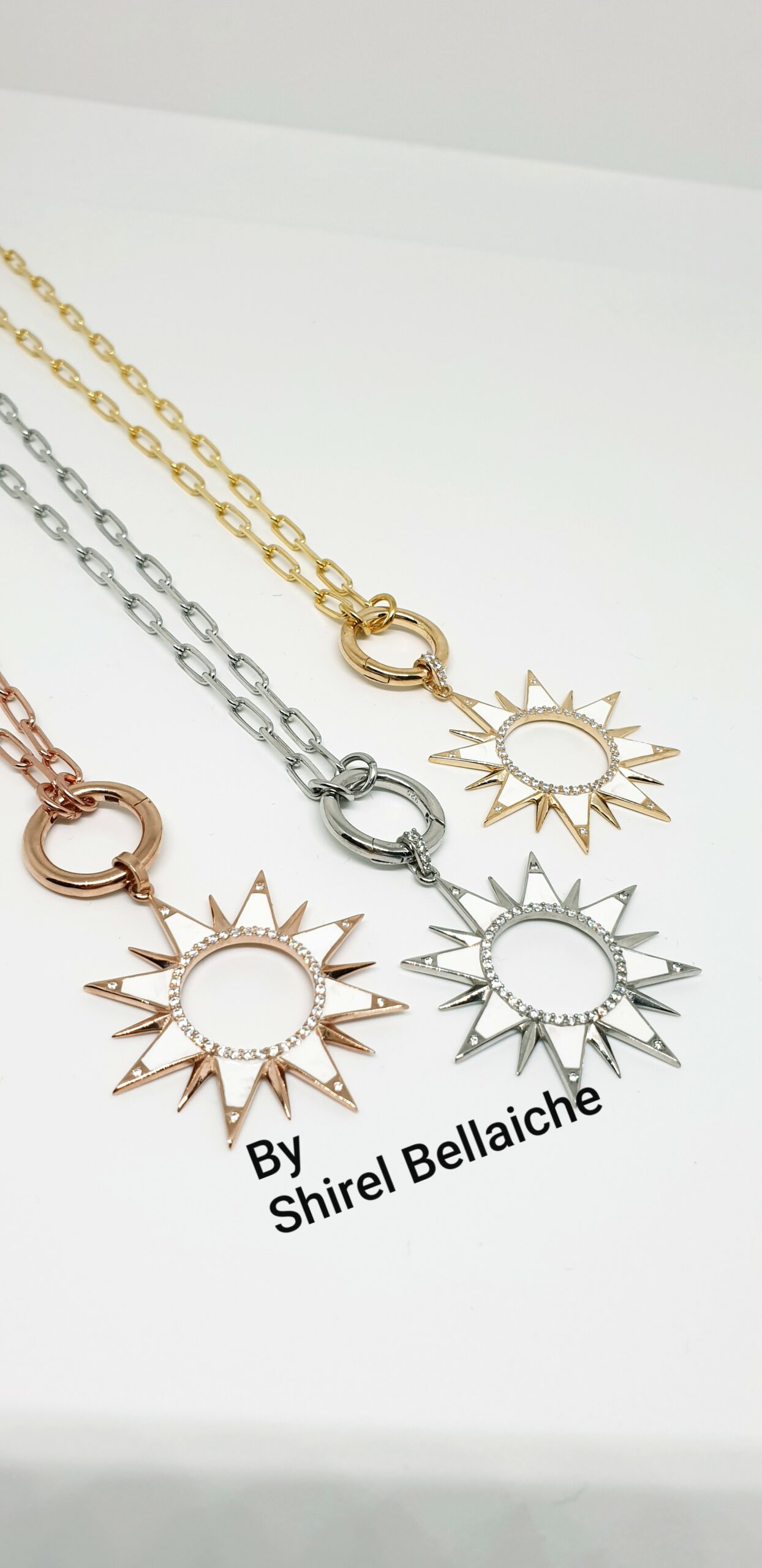 Sautoir motif Soleil en émail et zircons soutenu par un mousqueton permettant l ouverture