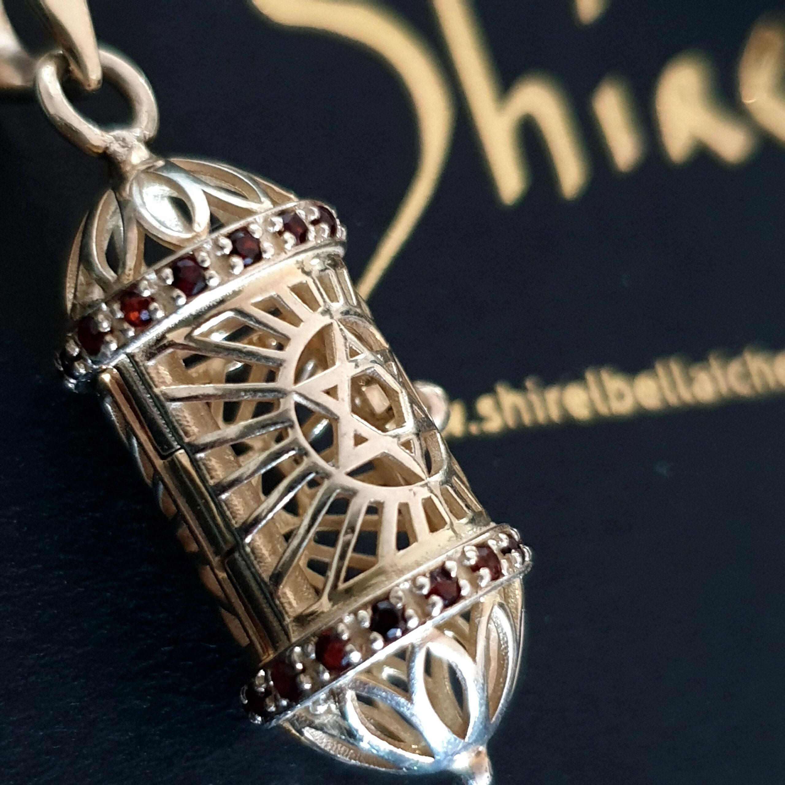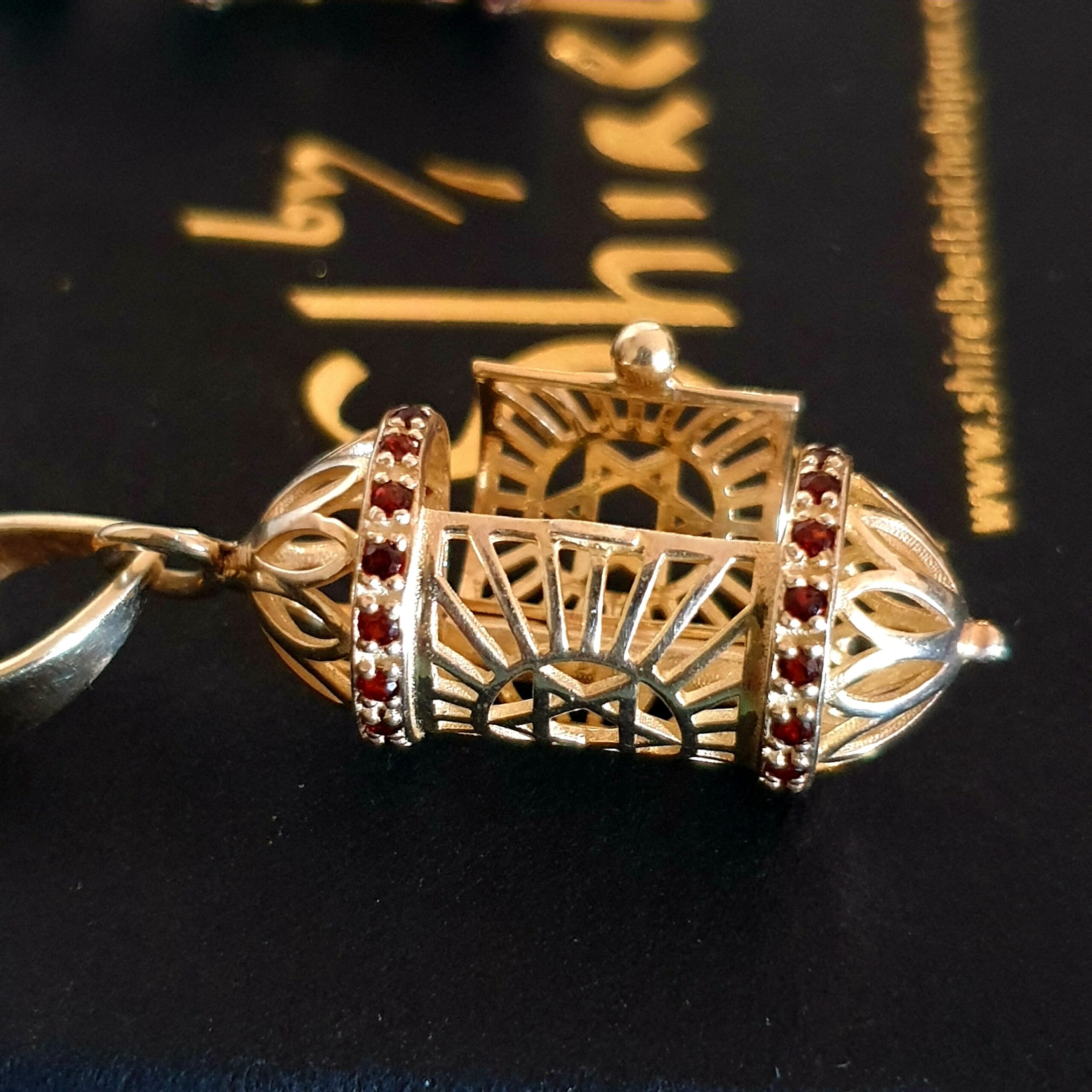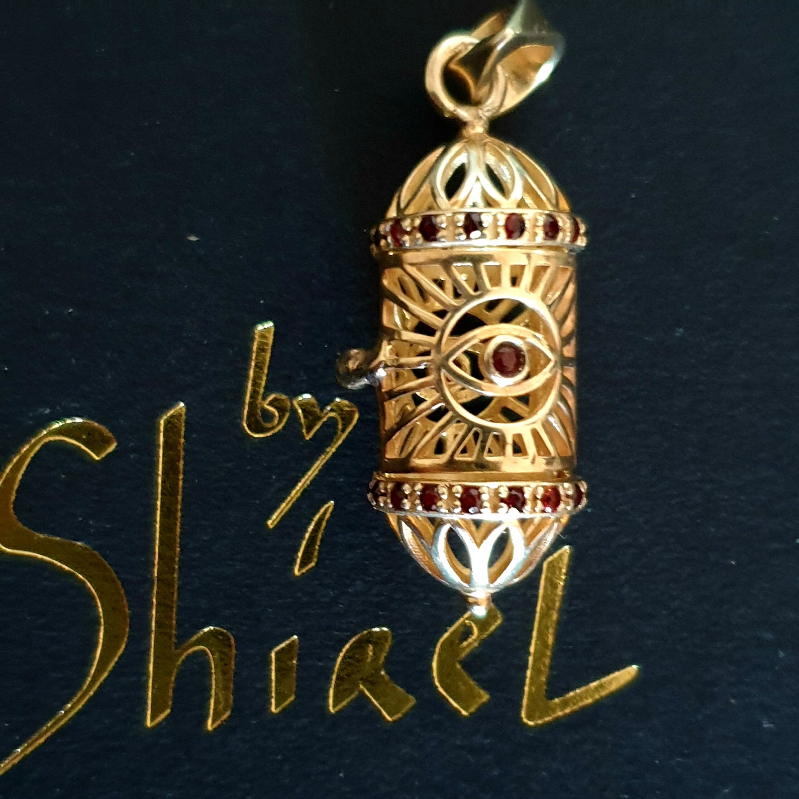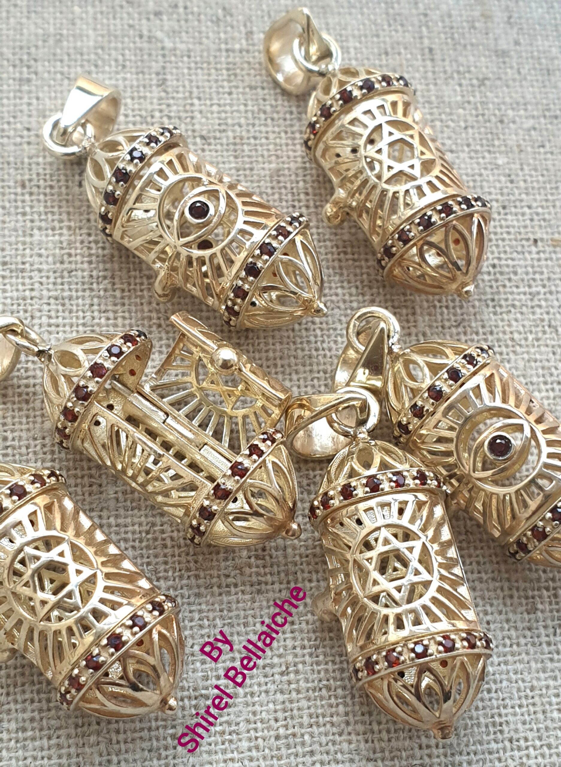 Les sefers sont entièrement fait en vermeil, puis ornés de zircons rubis tout autour en haut et en bas, repris sur l iris de l œil.