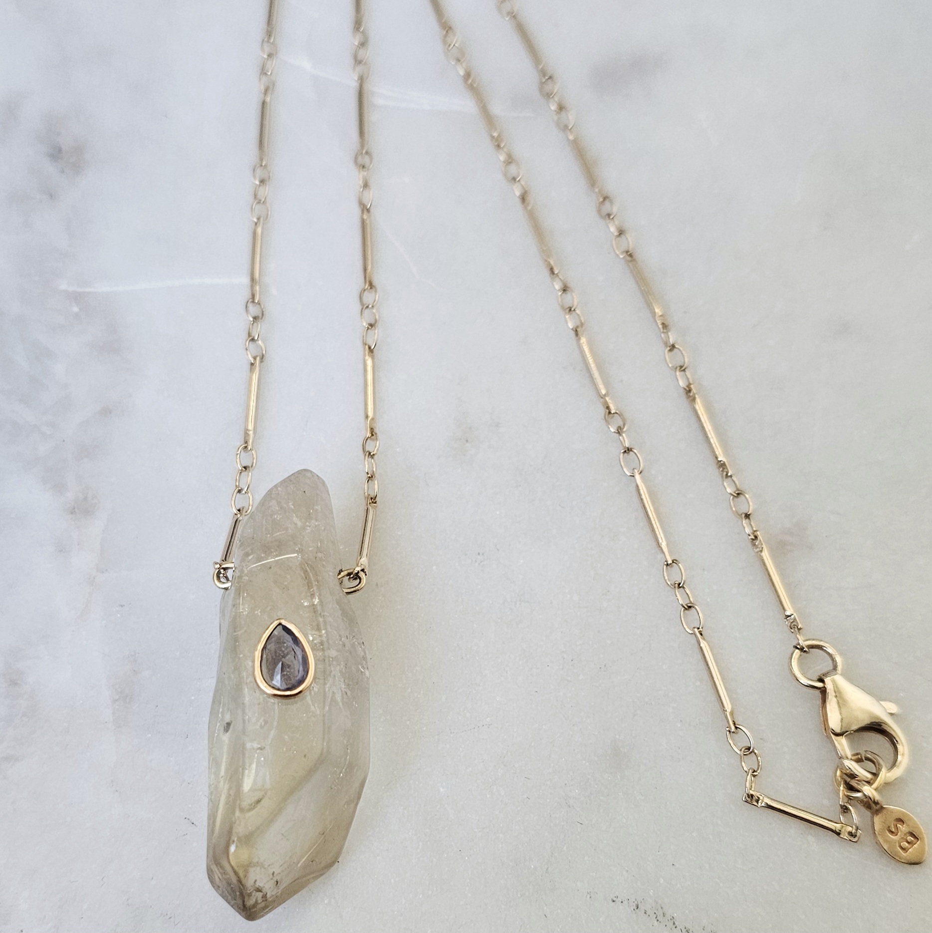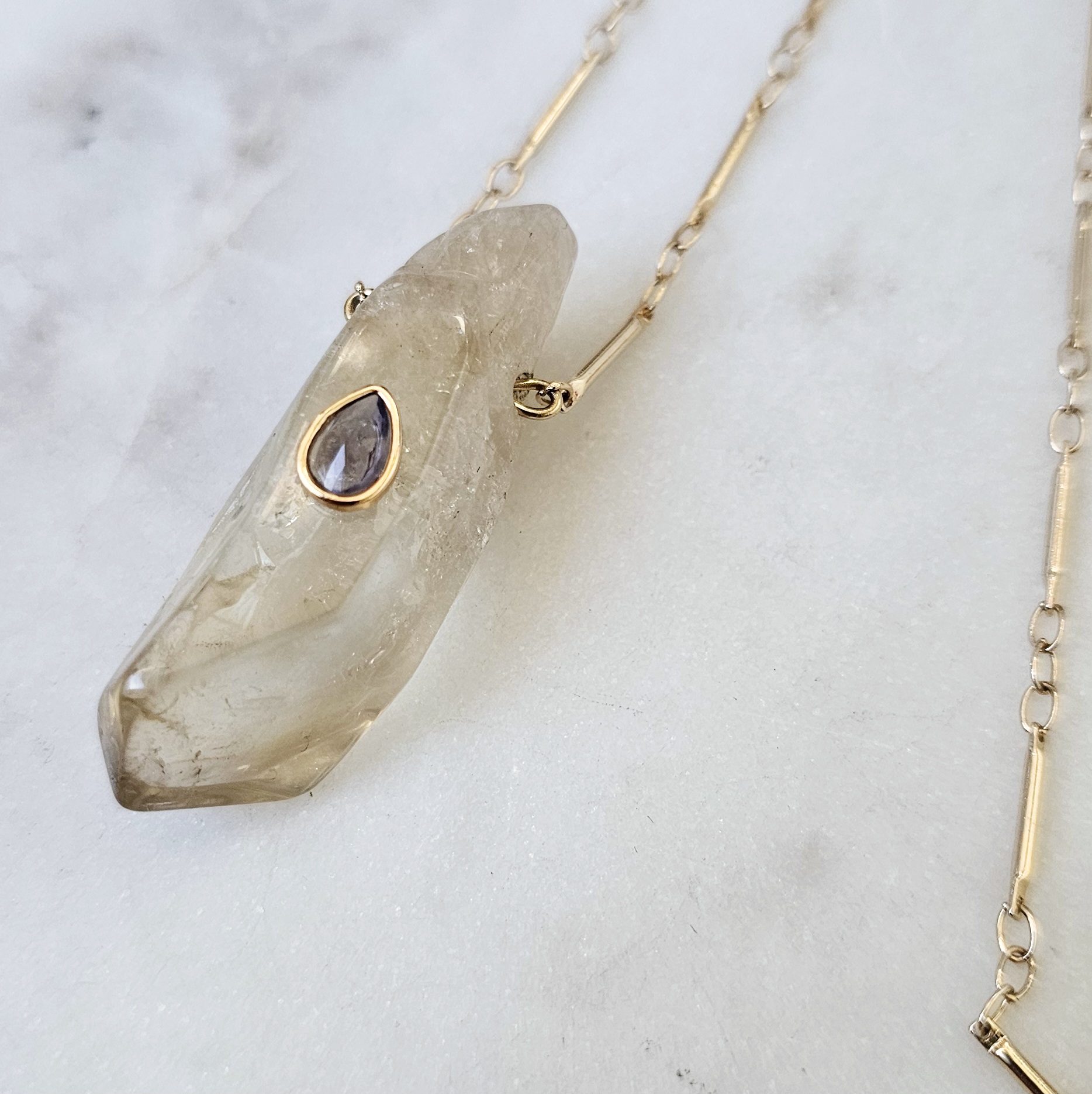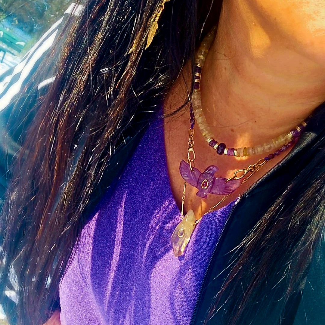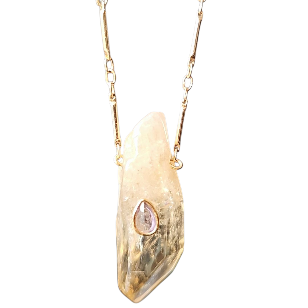 Ce collier met en lumière une citrine, pierre naturelle aux reflets dorés et translucides, soigneusement taillée et polie tout en conservant son caractère brut et organique. En son centre, une délicate goutte améthyste lavande sertie, apporte une touche subtile de lumière et de raffinement.