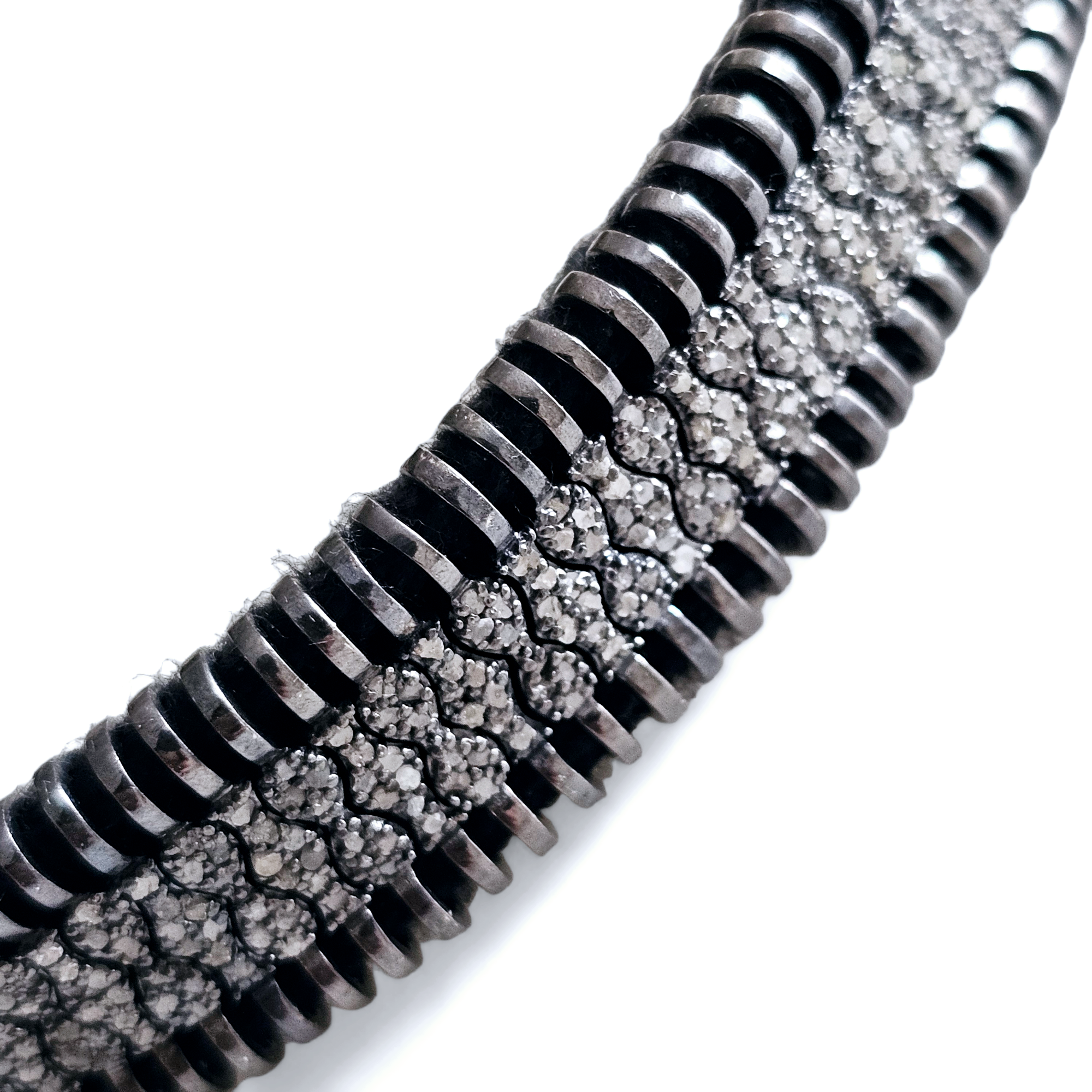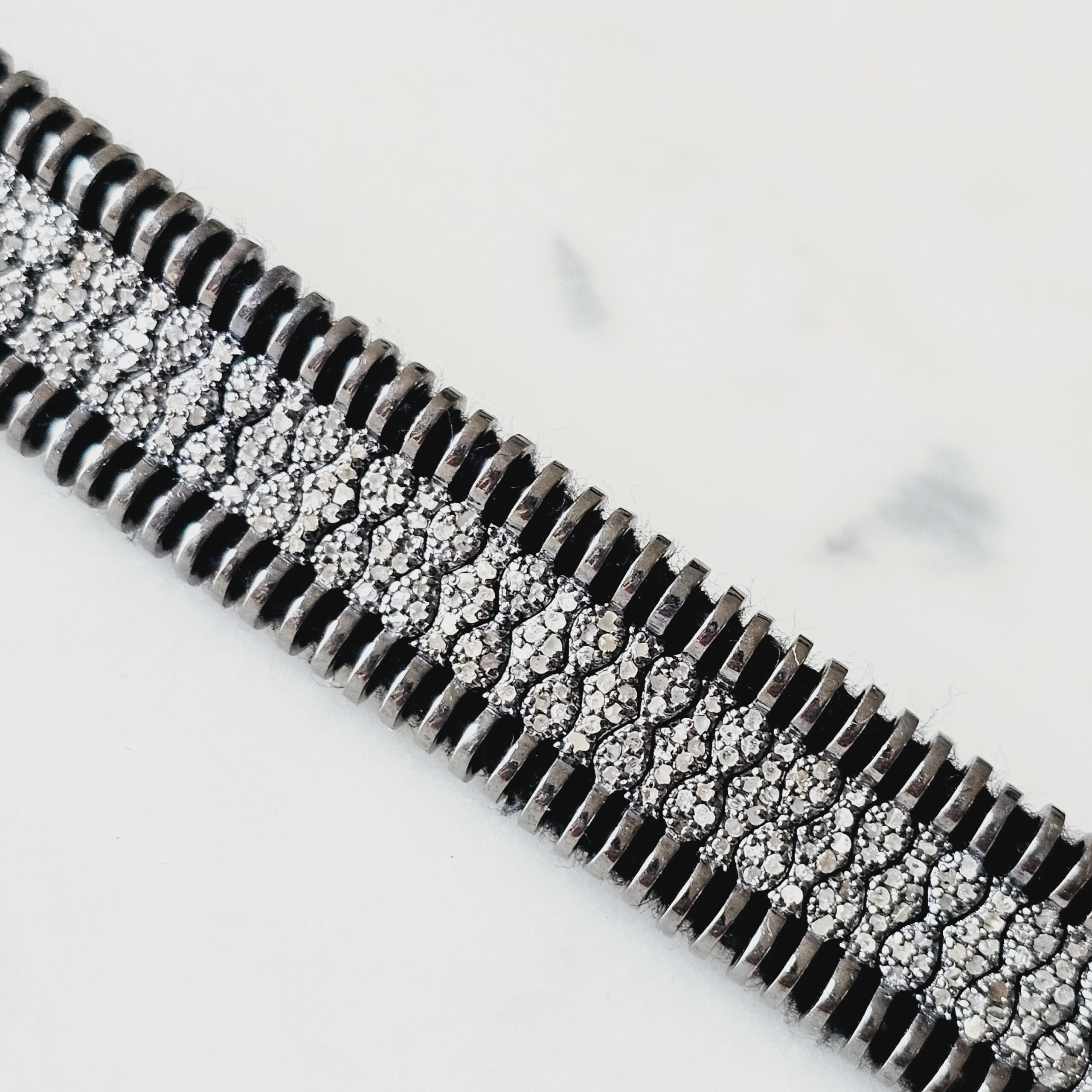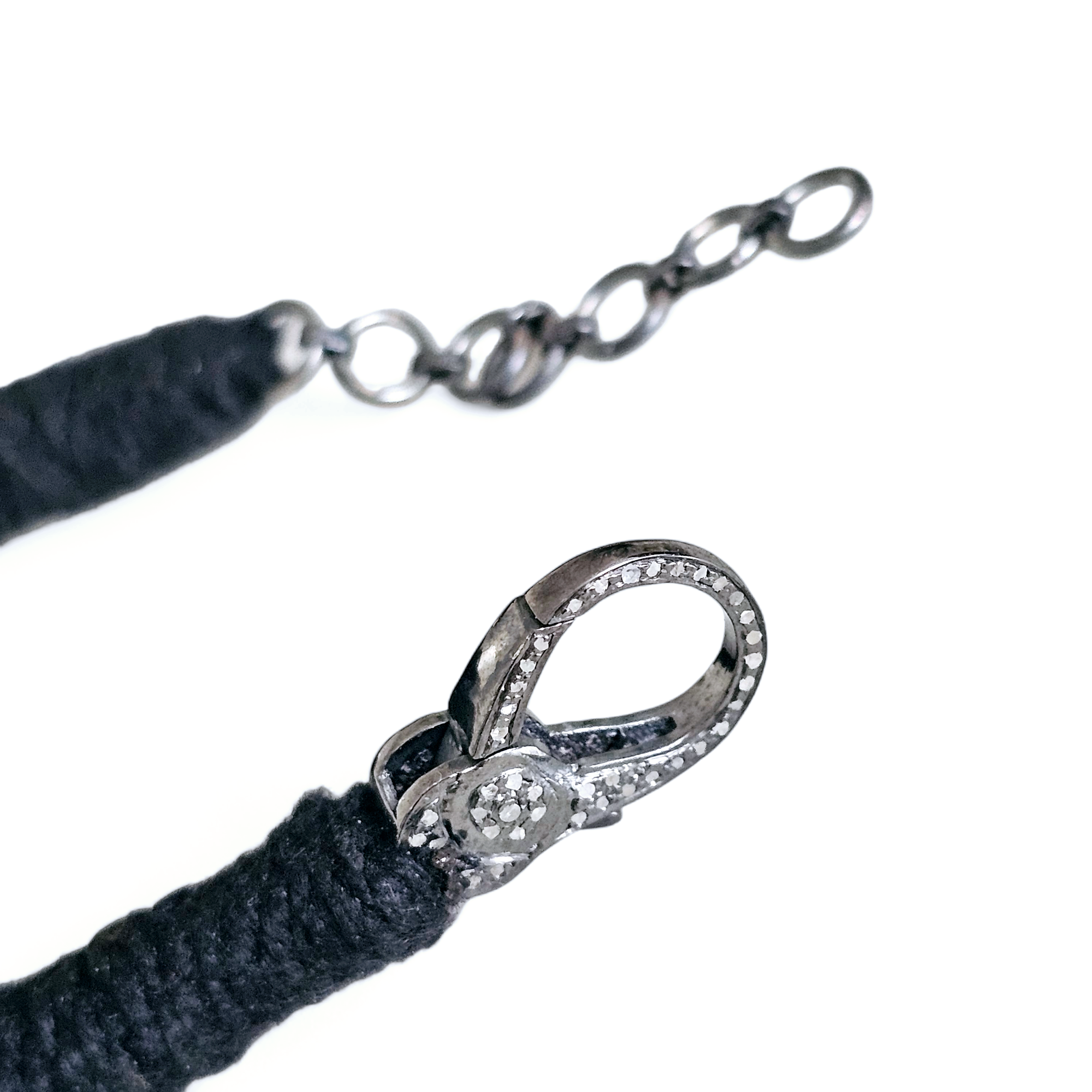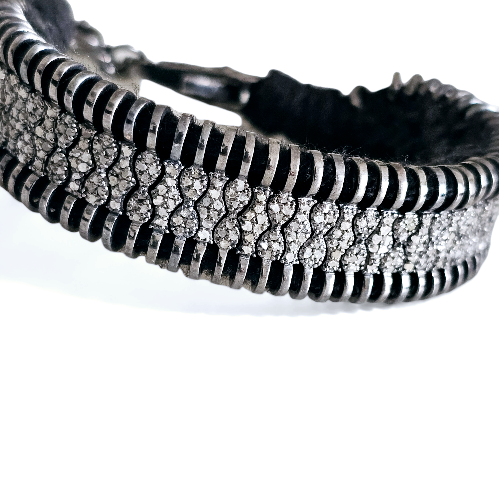 TAHITI est un bracelet en fil de coton noir, orné d’un motif argent 925, entièrement serti tout le long de plusieurs véritables diamants . Son ornement graphique tout pavé donne un coté contemporain à ce bracelet ethnique.