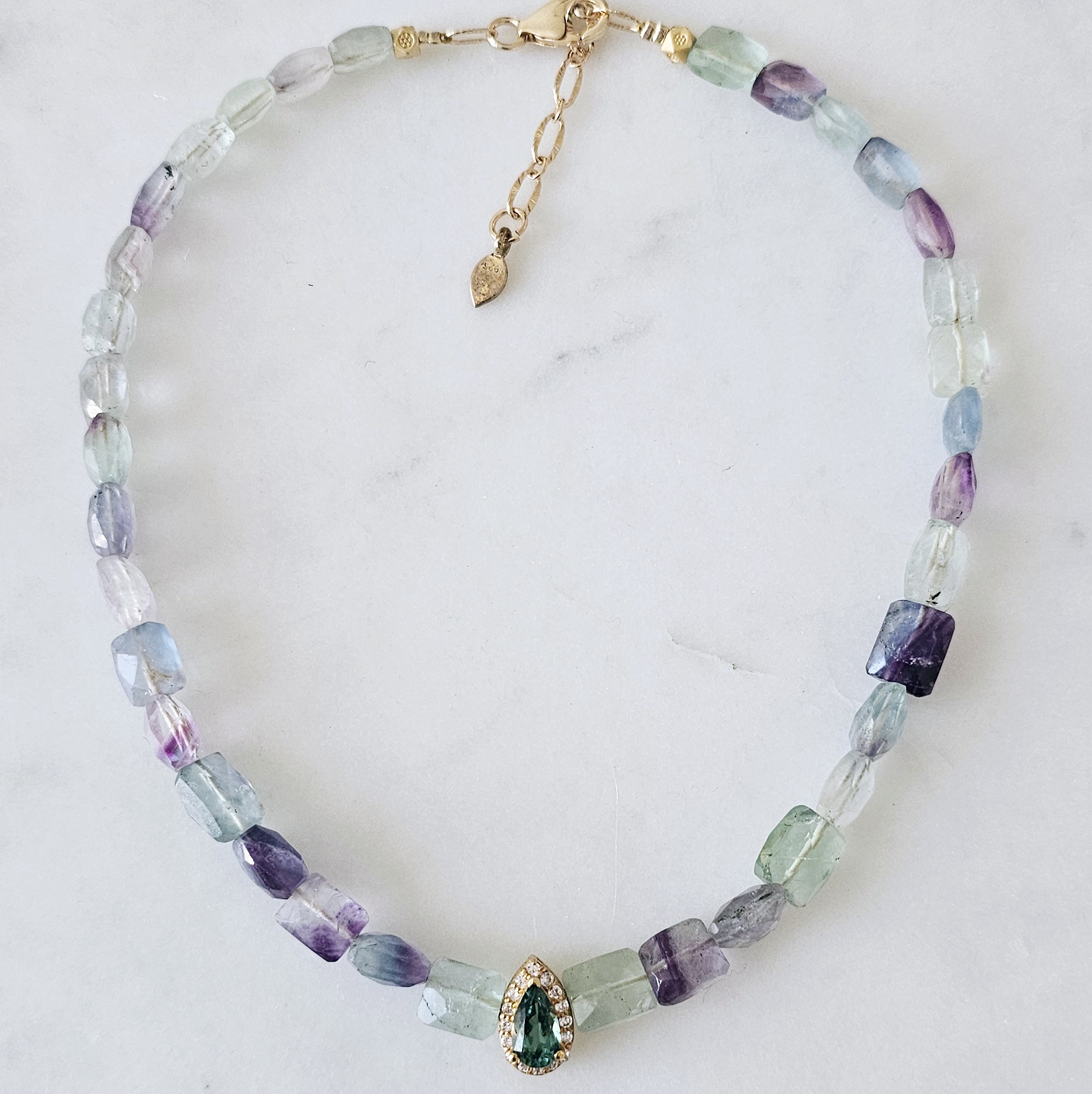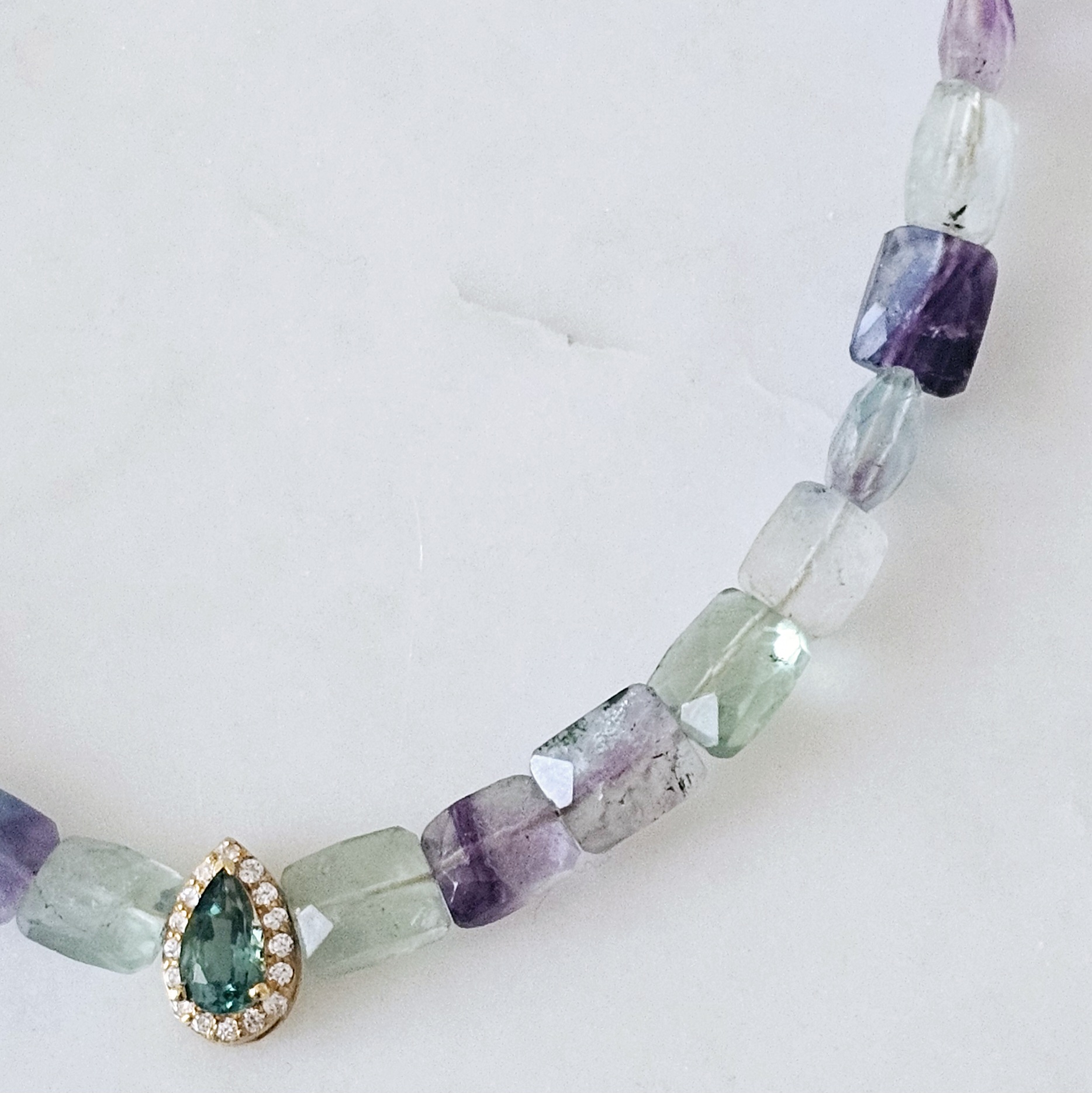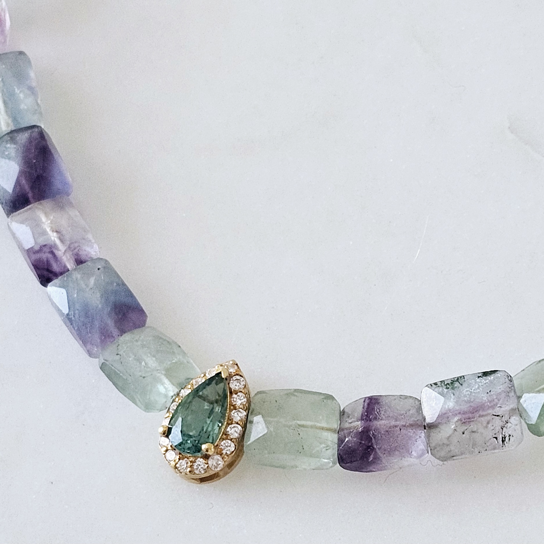 TAHITI est tout en fluorites naturelles facettées, plaquée or avec au centre une goutte tourmaline verte sertie de zircons.
