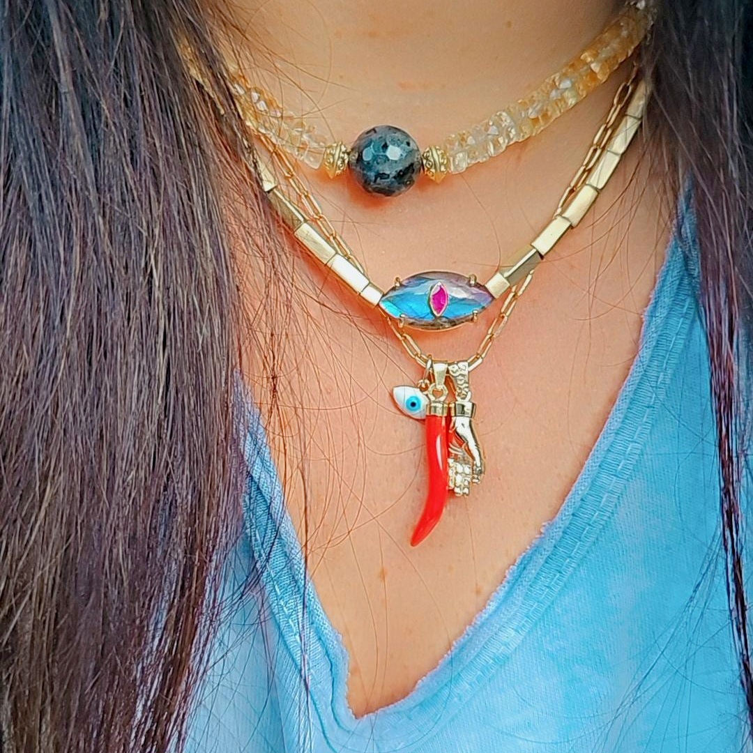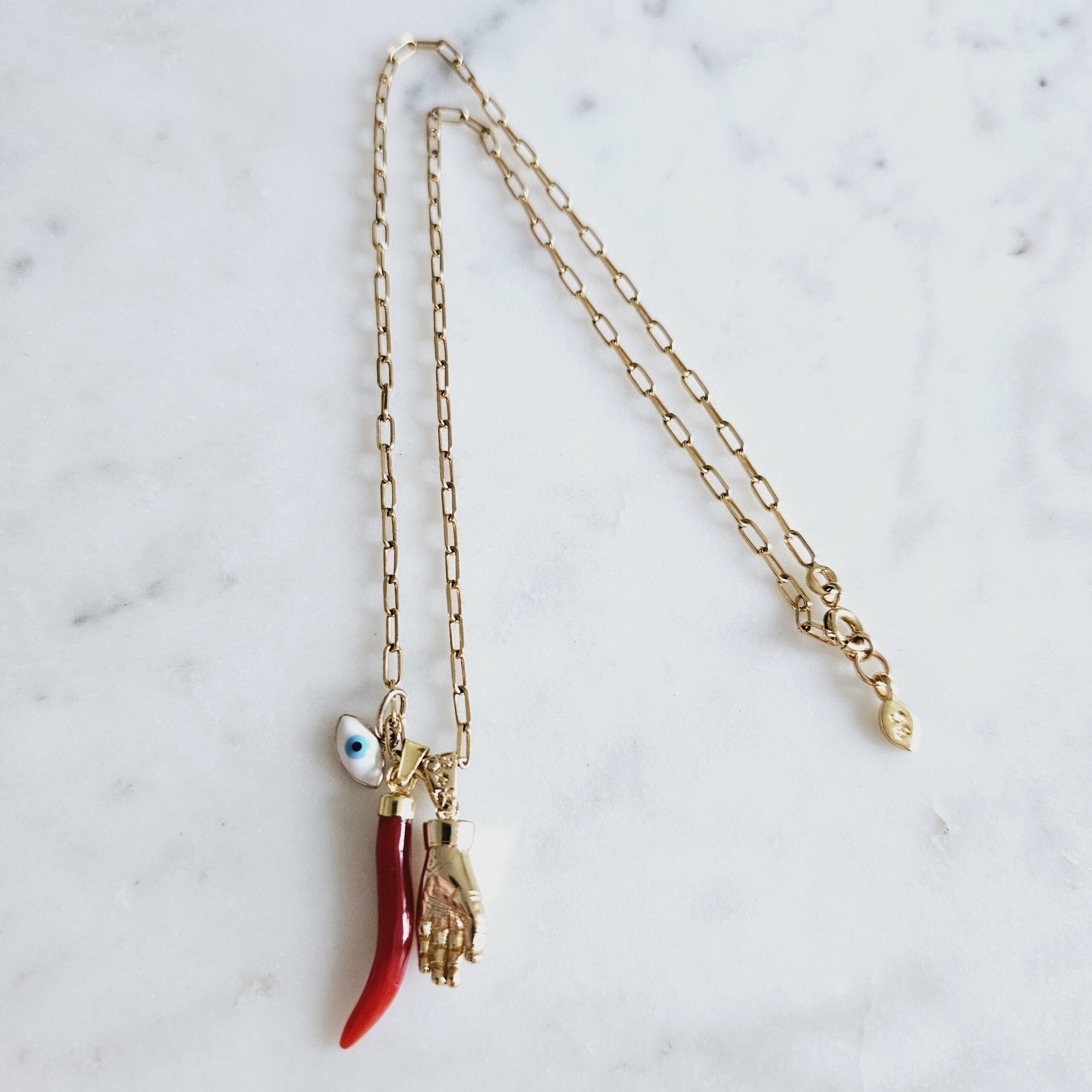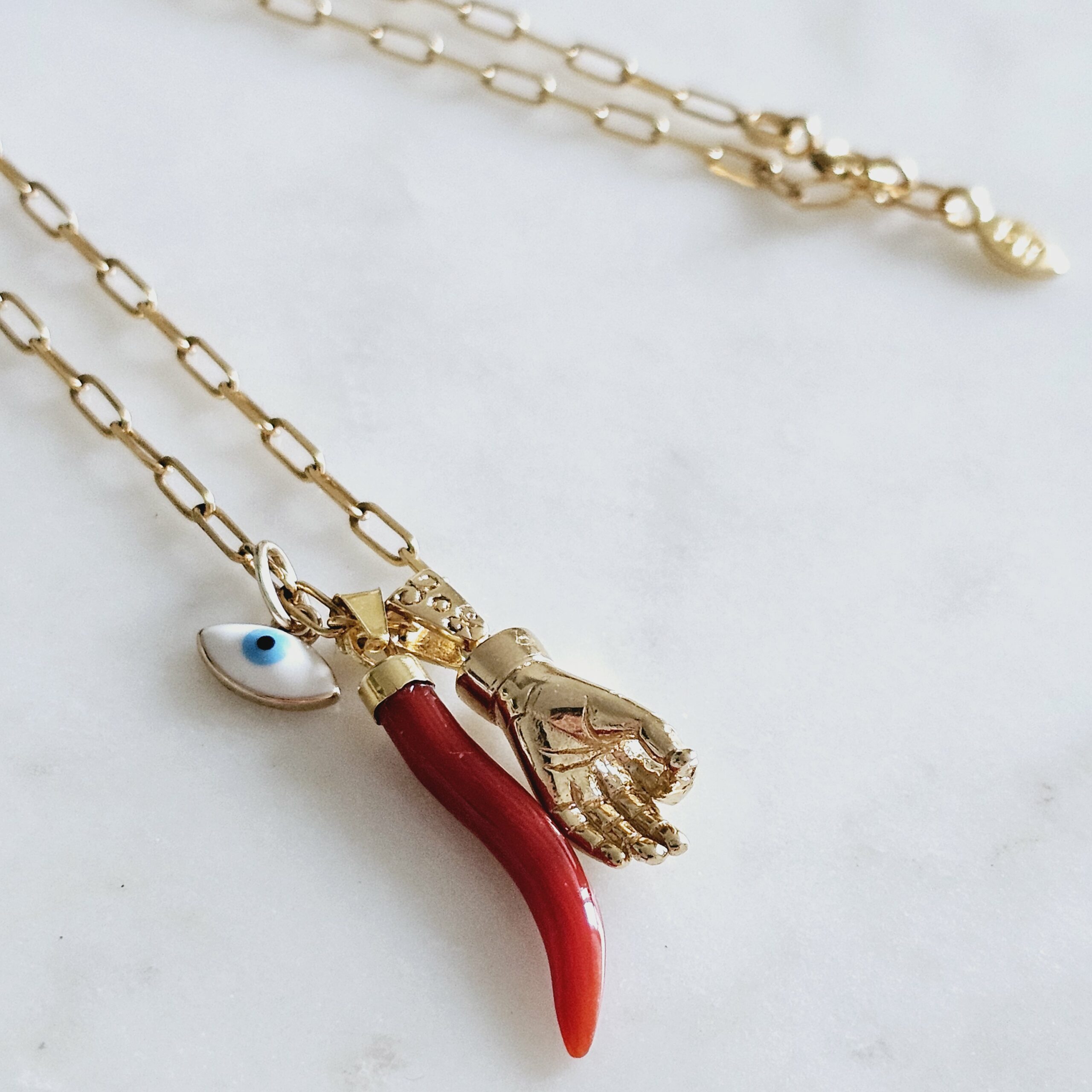 TENTATION est un collier fétiche, porte-bonheur tout plaqué or qui se compose d’un petit oeil grecque, un piment tout corail naturel et d’une main de protection.
