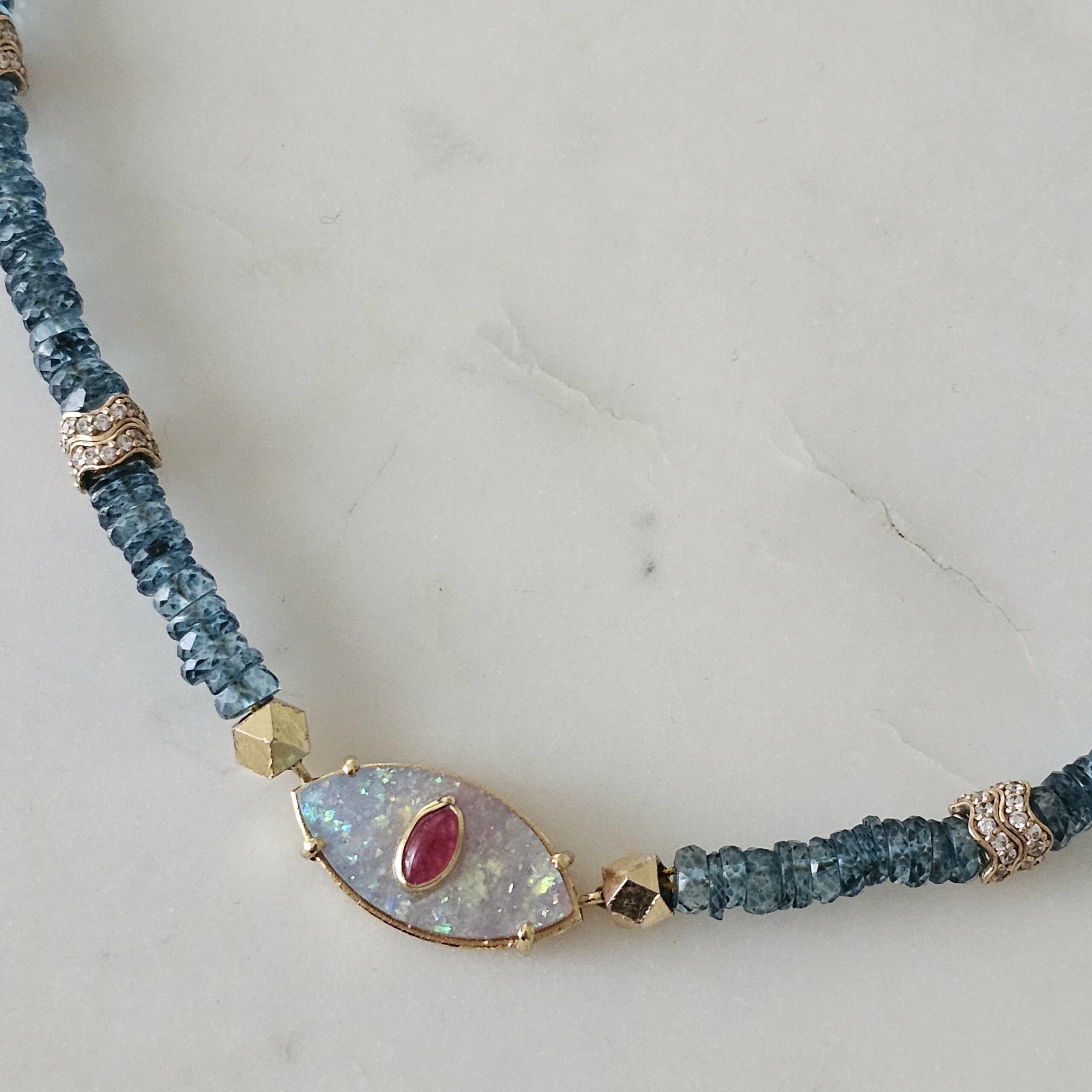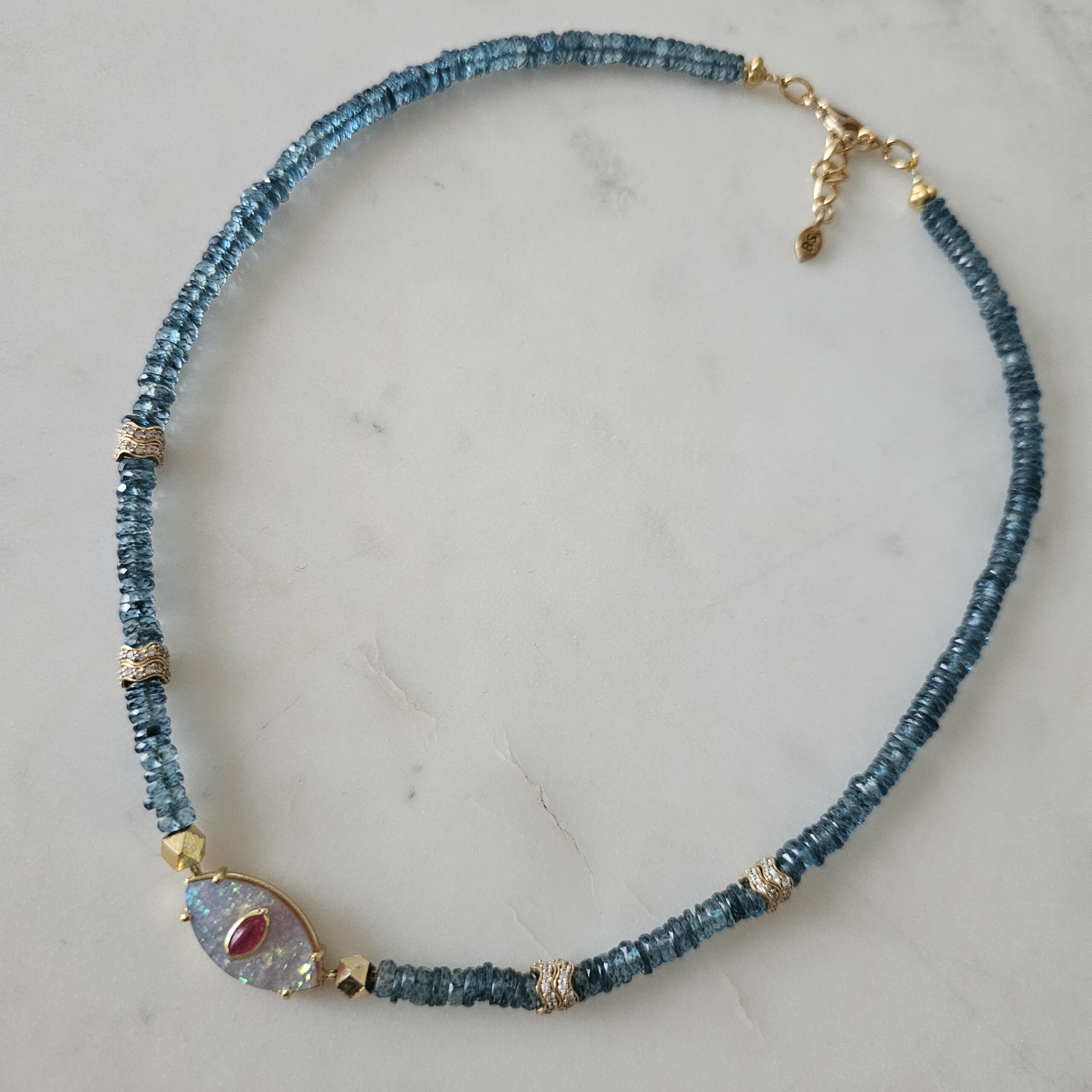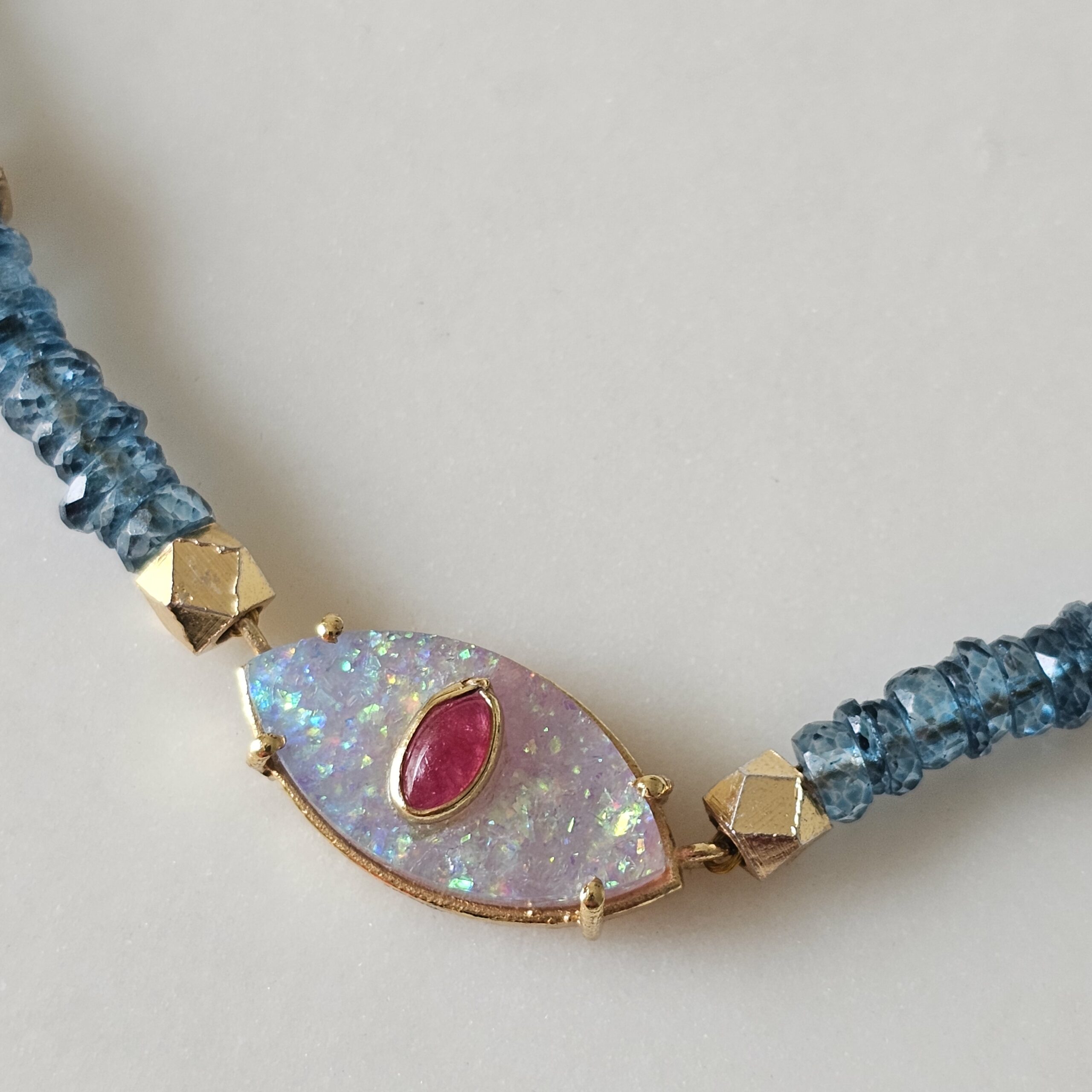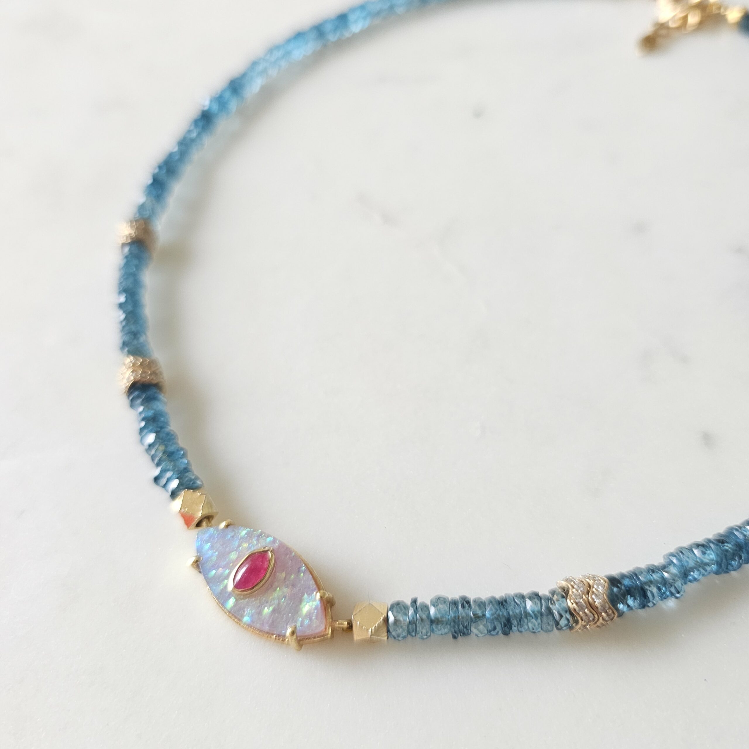 AINARA TOPAZE est entièrement en pierres naturelles de topaze blue London, zircon et plaqué or avec au centre un pendentif oeil Ainara en opale d’arlequin blanche.