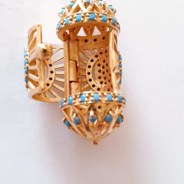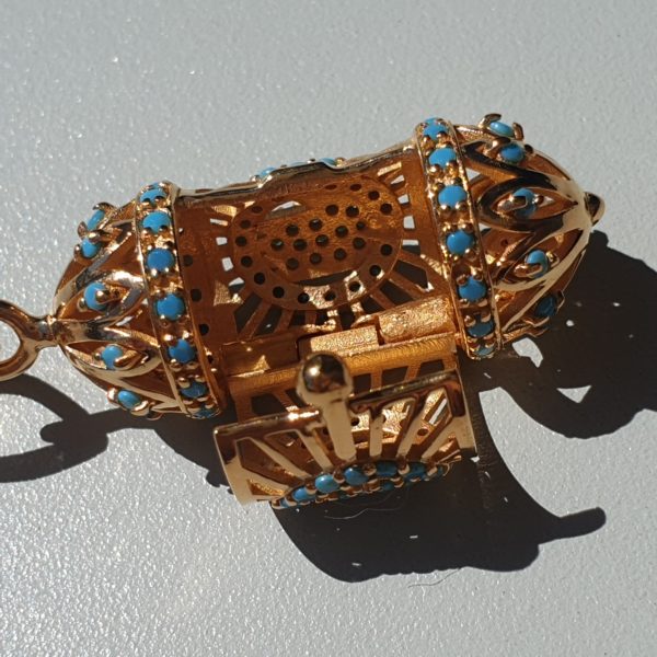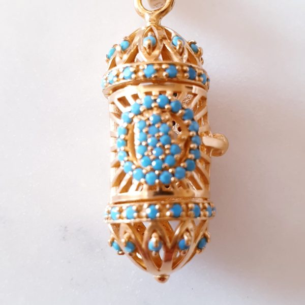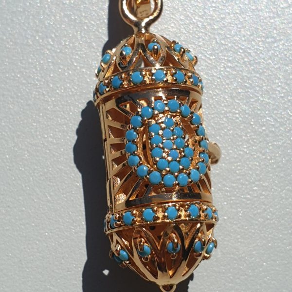 Bijou emblématique et ancestral de la religion juive, j’ai décliné une version avec une petite main que vous l’on retrouve aussi bien sur le devant que sur l’arrière du pendentif. Ce symbole de protection est tout en zircons TURQUOISE. Le haut et le bas du sefer sont également ornés de zircons TURQUOISE.