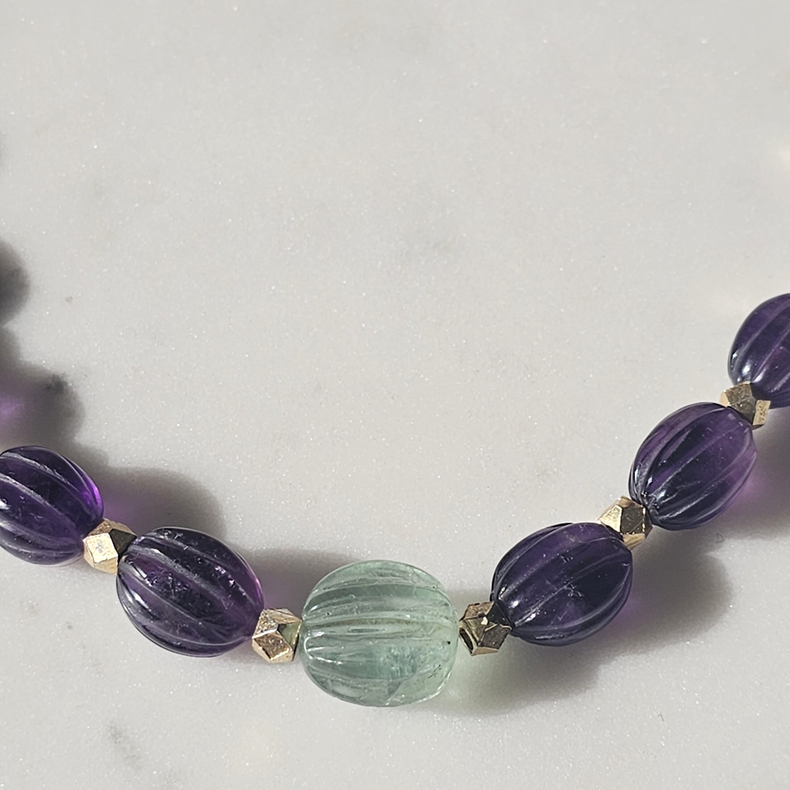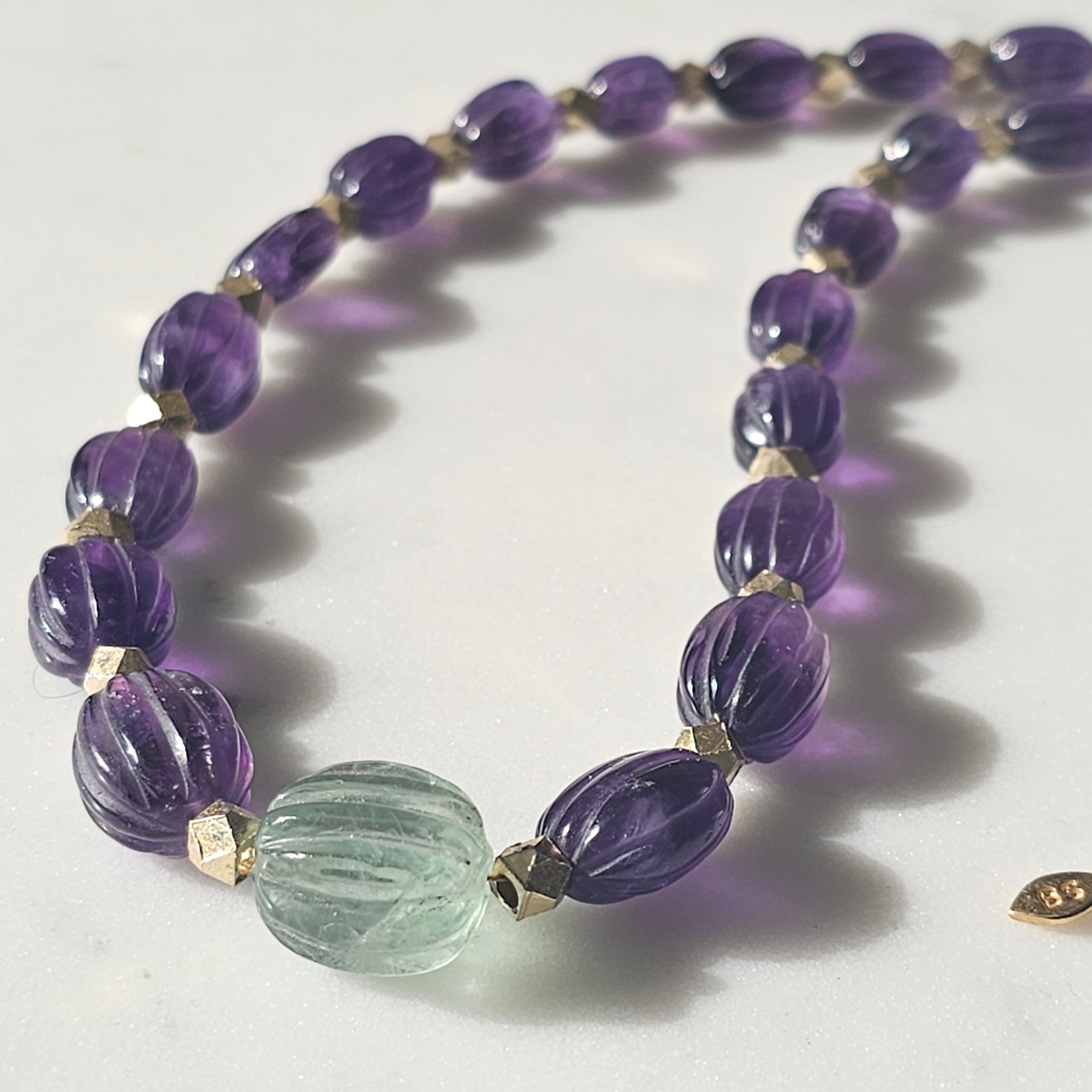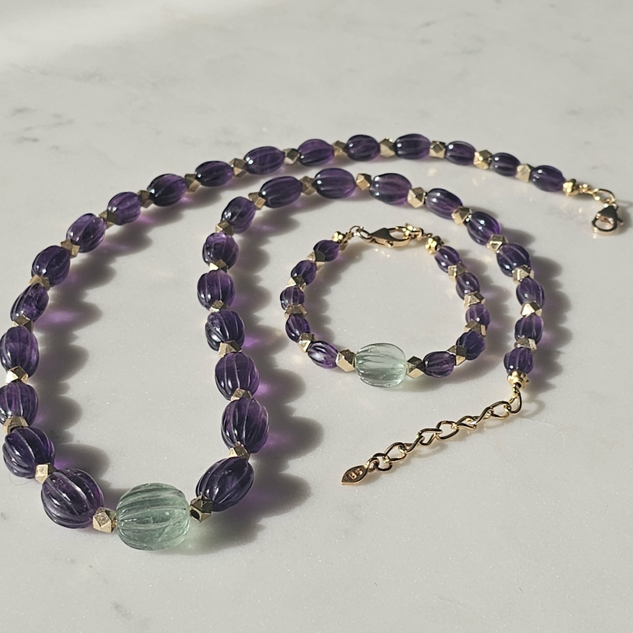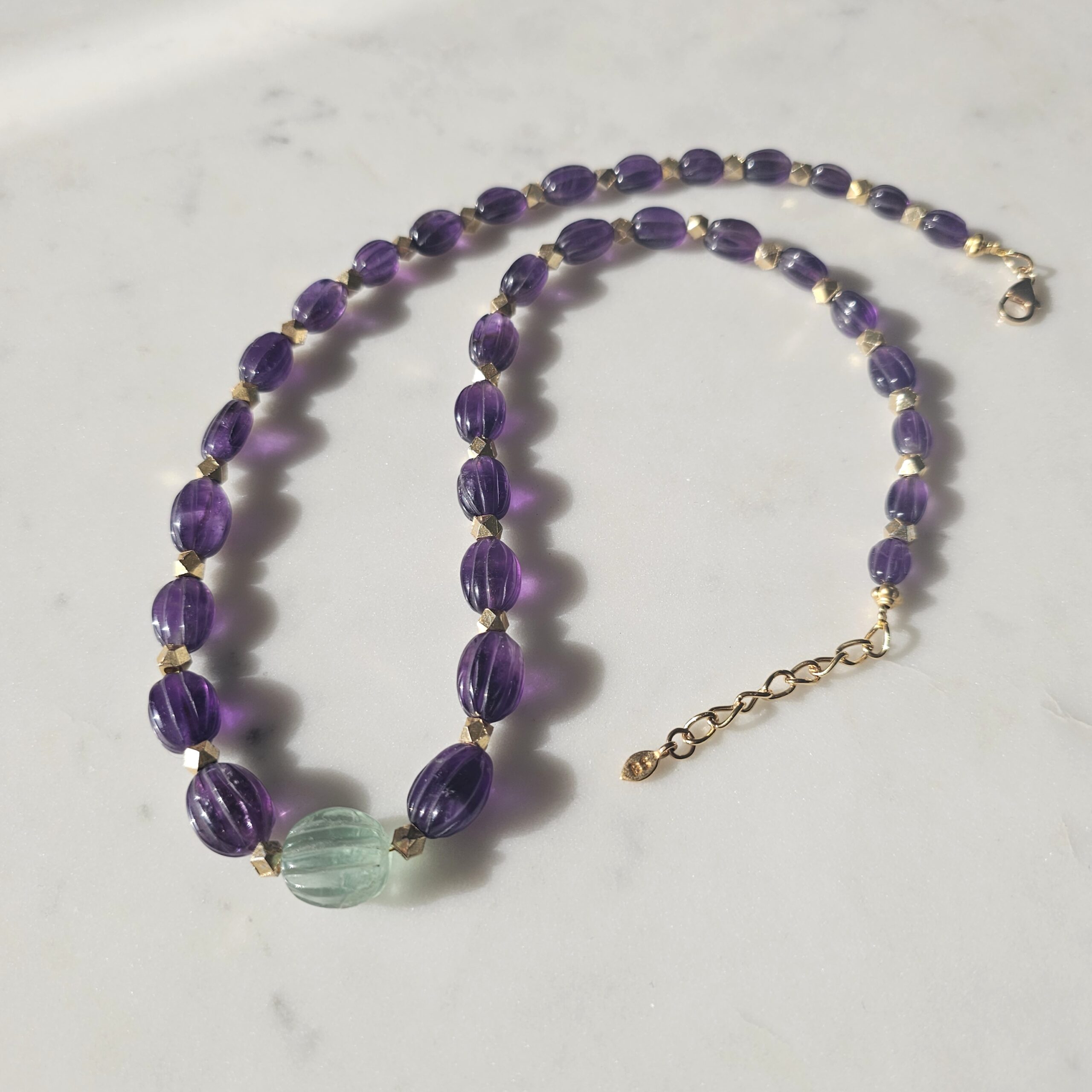 VIOLETTA est tout en améthyste, fluorite et plaqué or.