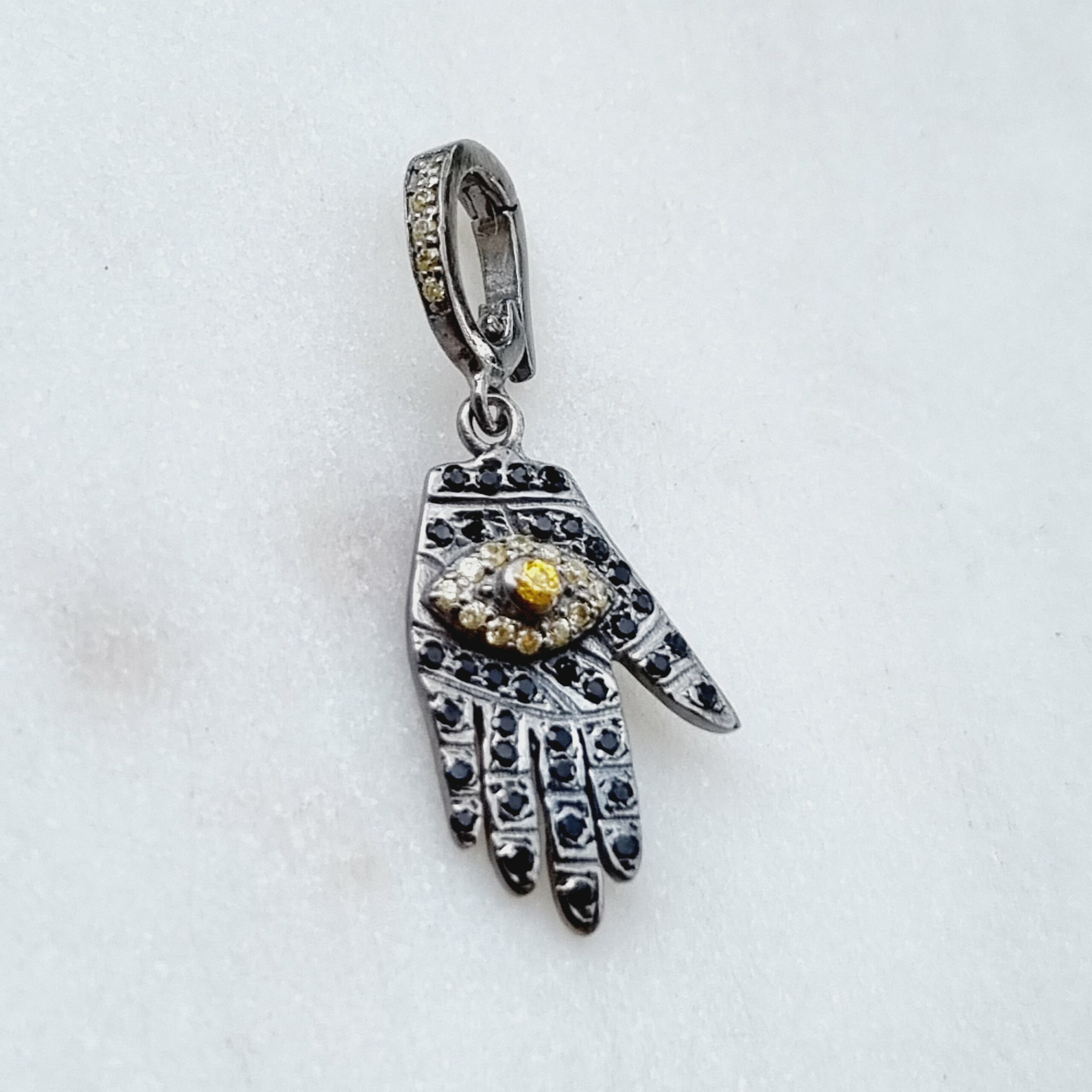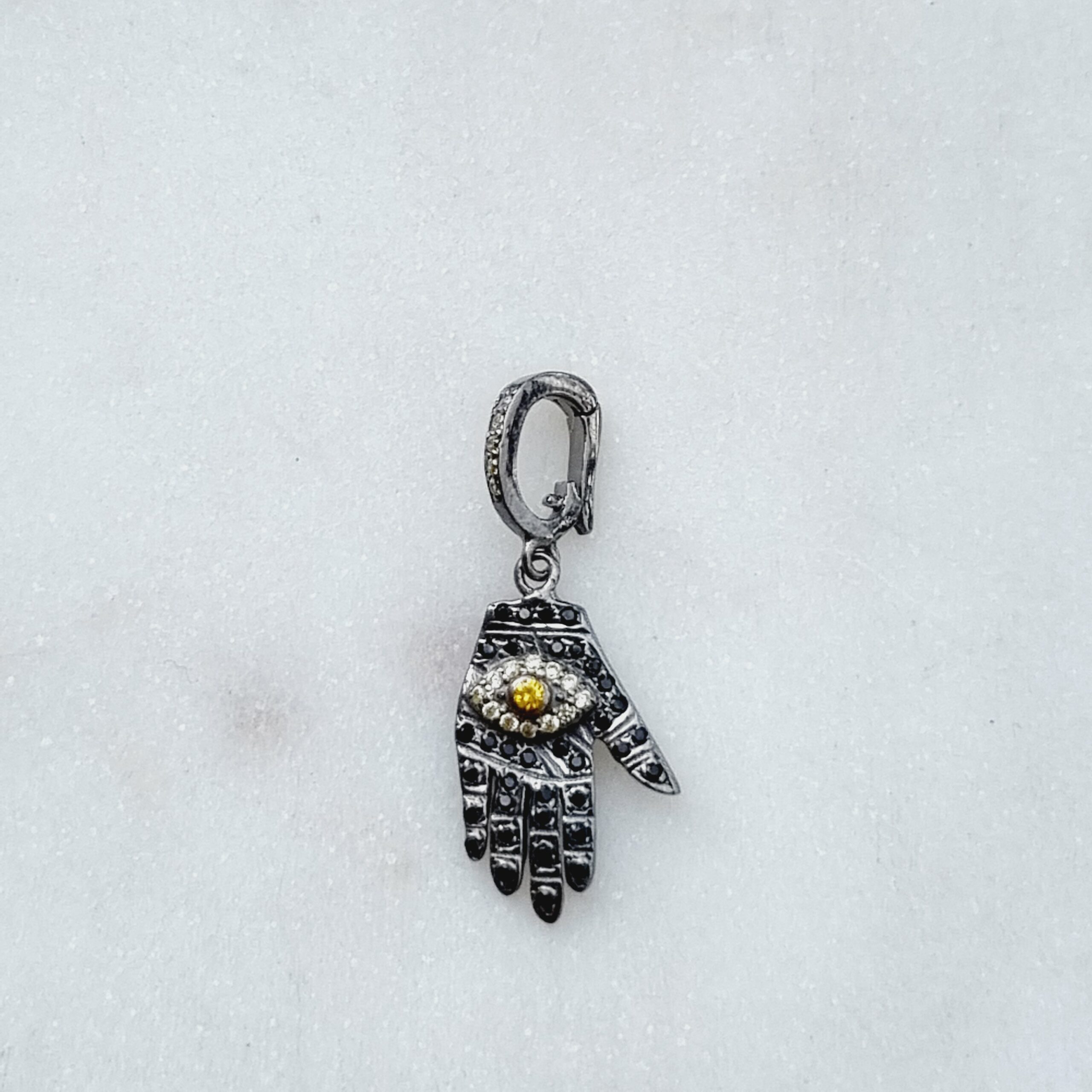 Yade est un charm talisman main de protection connue aussi sous le nom de Hamsa inspirée des bijoux traditionnels orientaux. Double symboles de protection par un petit œil au centre. Sa bélière ouvrable sertie de zircons vous permet d’attacher le charm à une chaîne ou cordon de votre choix.