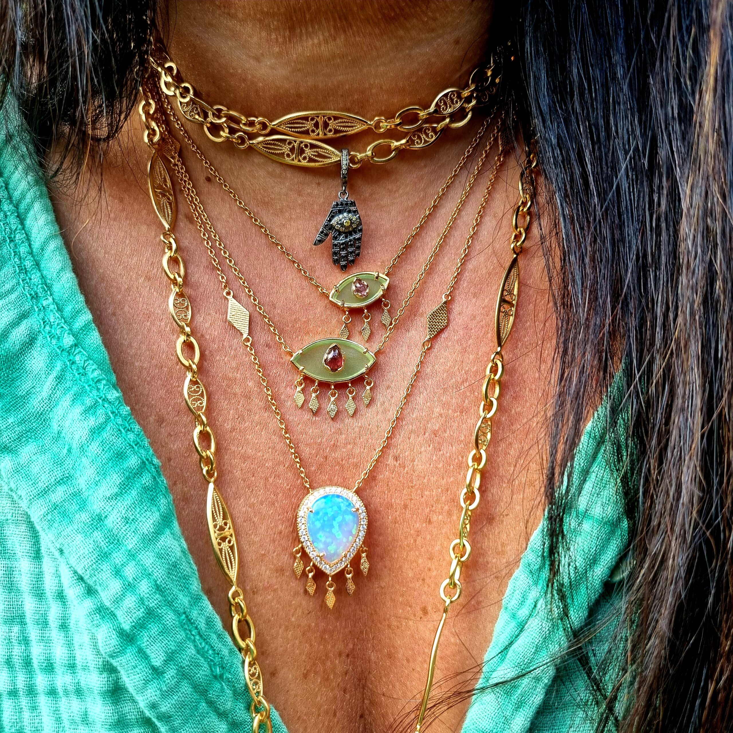 Mona Charm’s est proposée sans chaine. La version proposée ici est en amazonite avec au centre un petit oeil plaqué or.
