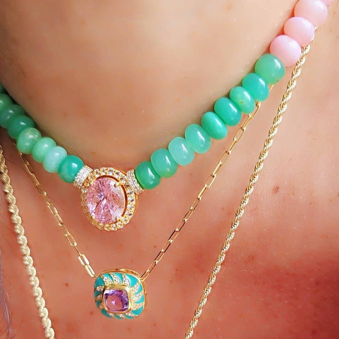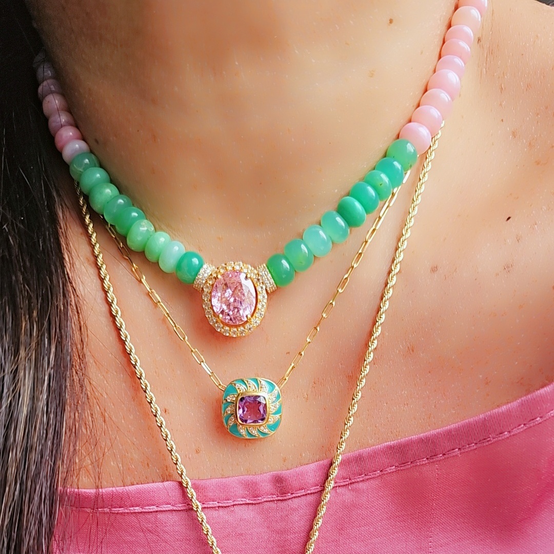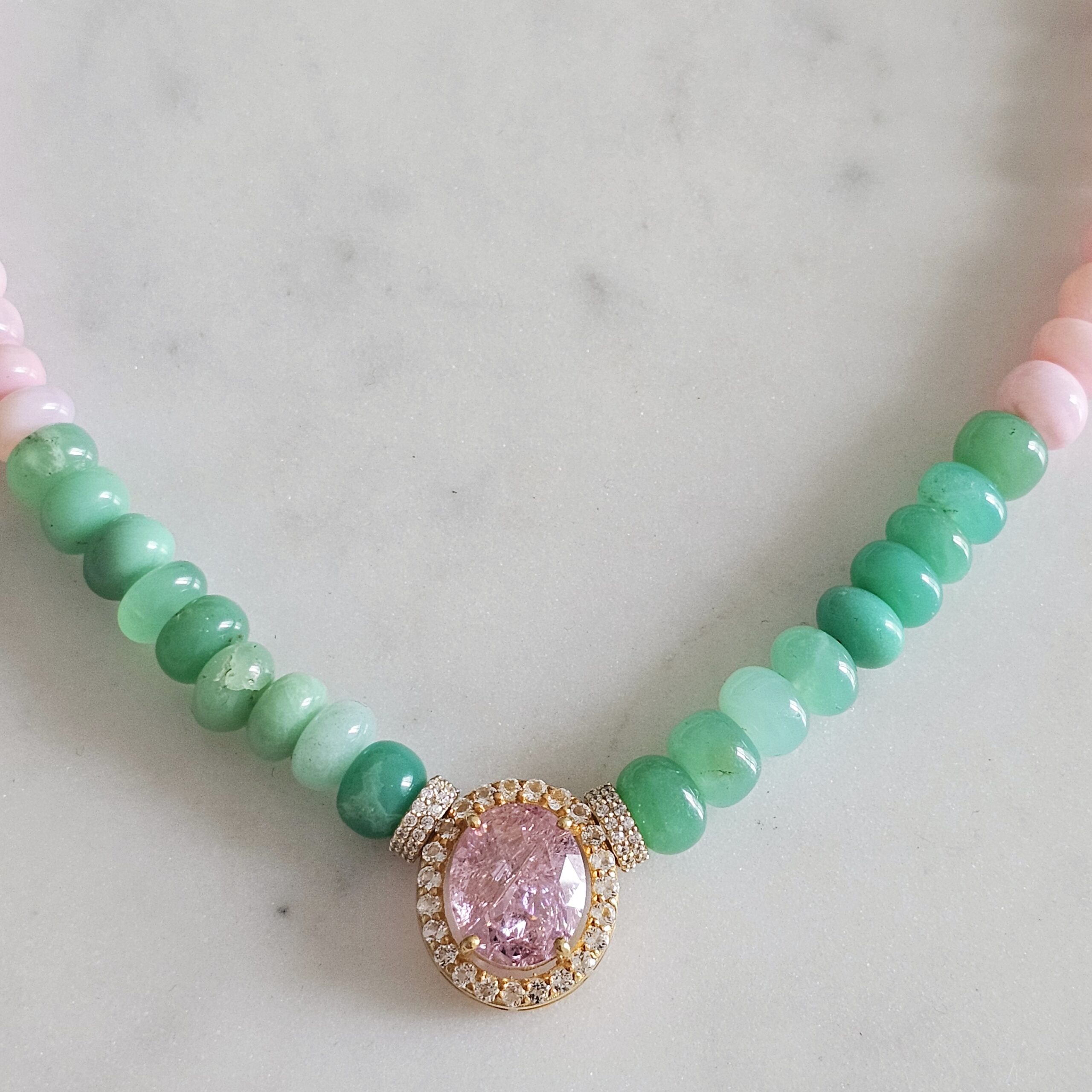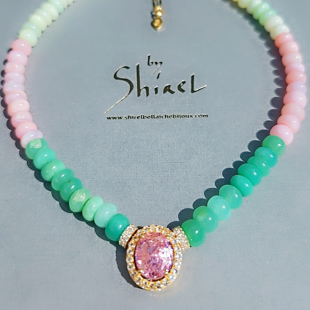 ZOE est tout en opales naturelles , chrysoprase et zircons, avec au centre un pendentif en améthyste rose tout serti de zircons.